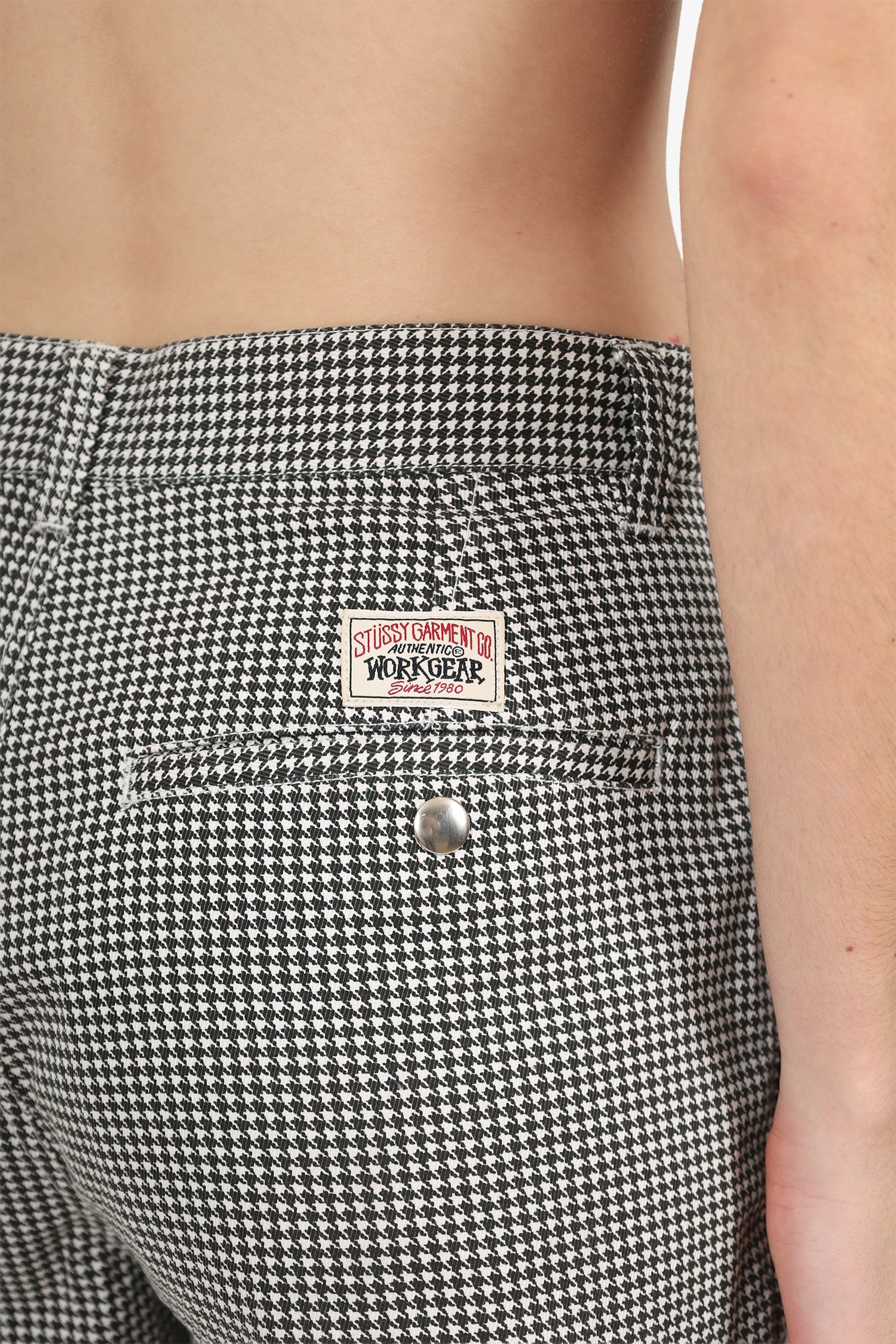 Refresh availabilityStussy Black/White Houndstooth Long Shorts. Slip-on. Front zip and snap-button closure. Waistband belt loops. 4 exterior pockets; 2 side slip and 2 rear slip. Silver-tone hardware. Tonal stitching.