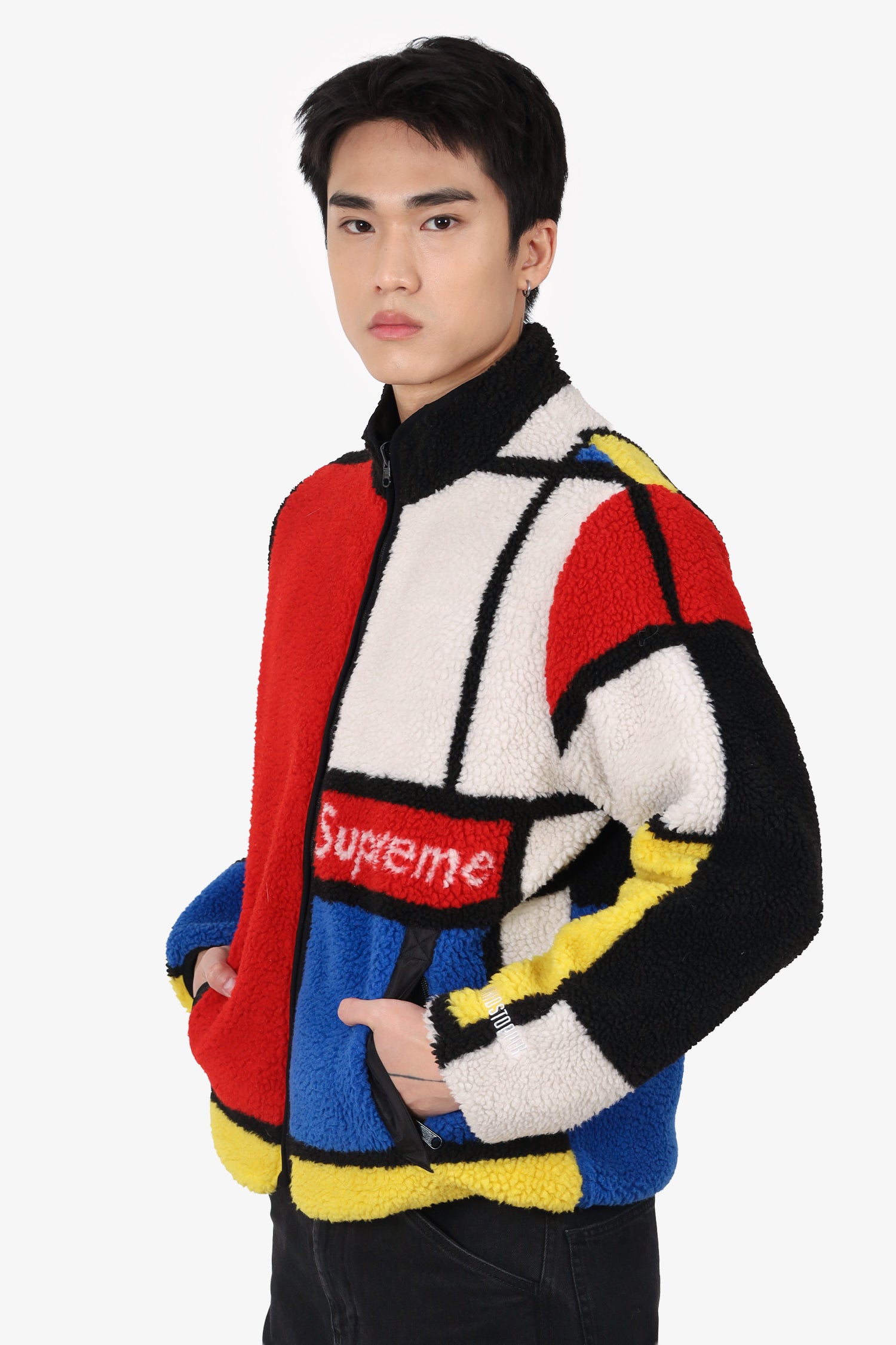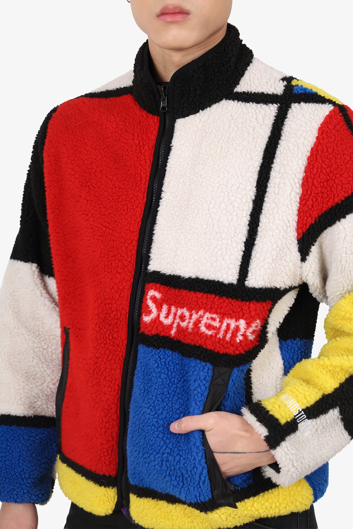 Refresh availabilitySupreme Black/Red/Yellow Colourblock Reversible Fleece Zip Up Sweater. Pull-on. Round neckline. Front zip and snap-button closure. 2 exterior zip pockets on each side. Tonal stitching.
