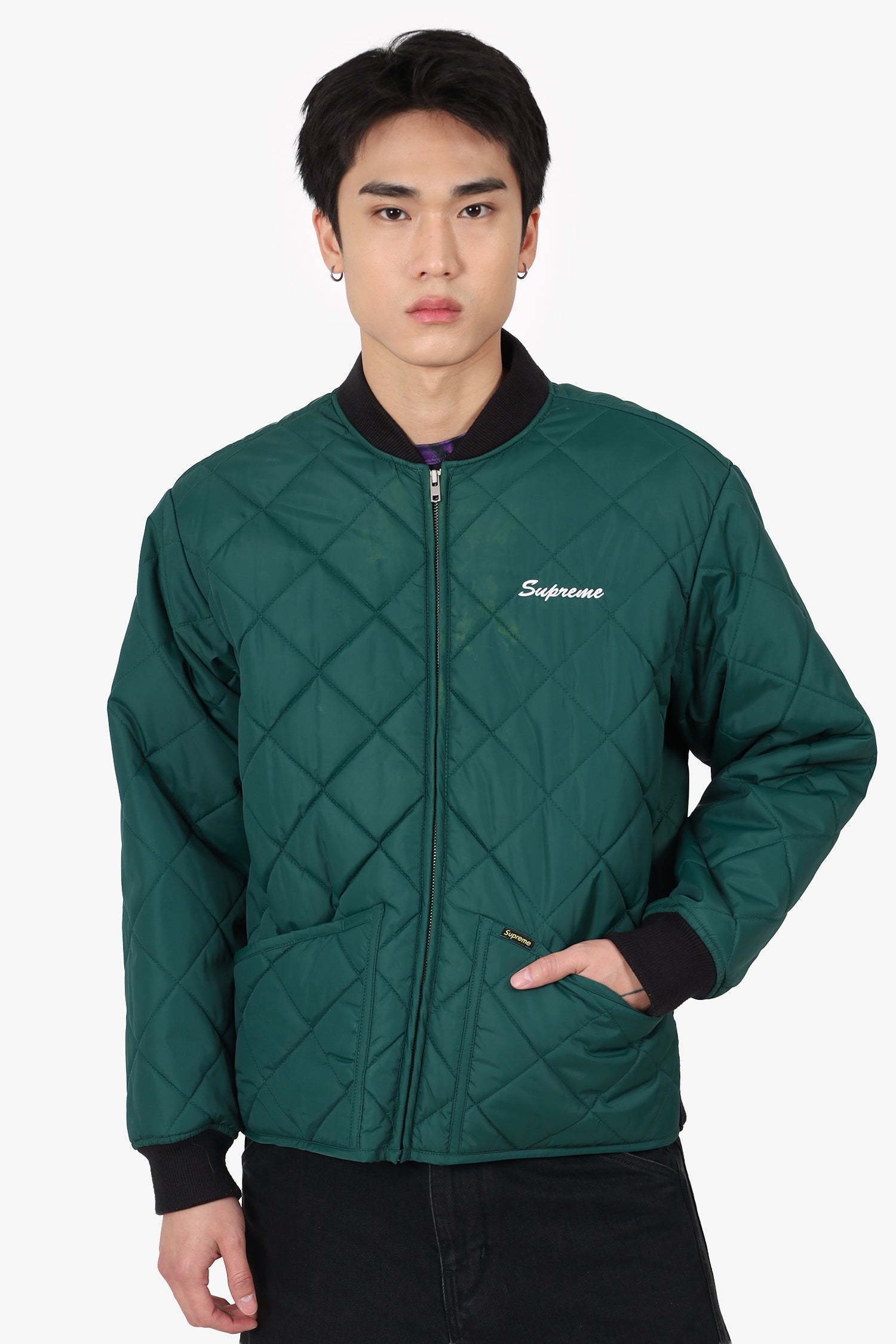 Refresh availabilitySupreme Green Quilted 'Dead Prez' Jacket. Pull-on. Round neckline. Front zip closure. Ribbed and elasticized neckline and sleeve cuffs. 2 front exterior slip pockets. Rear embroidery. Quilted lined interior. Silver-tone hardware. Tonal stitching.