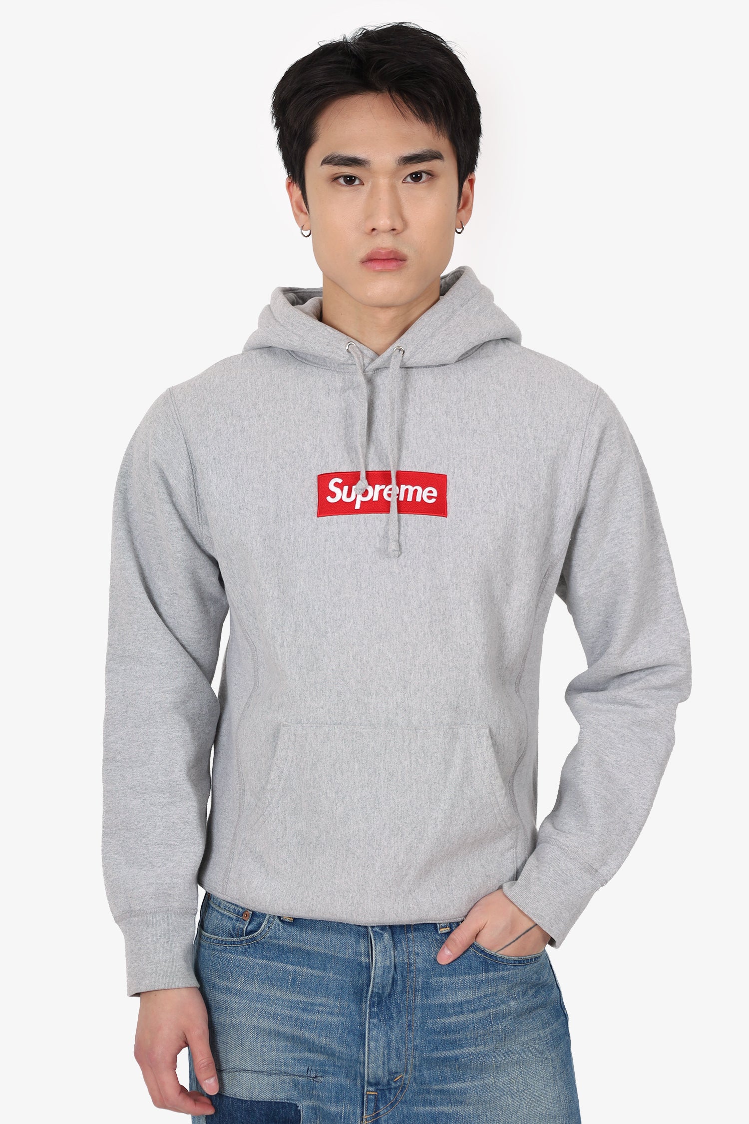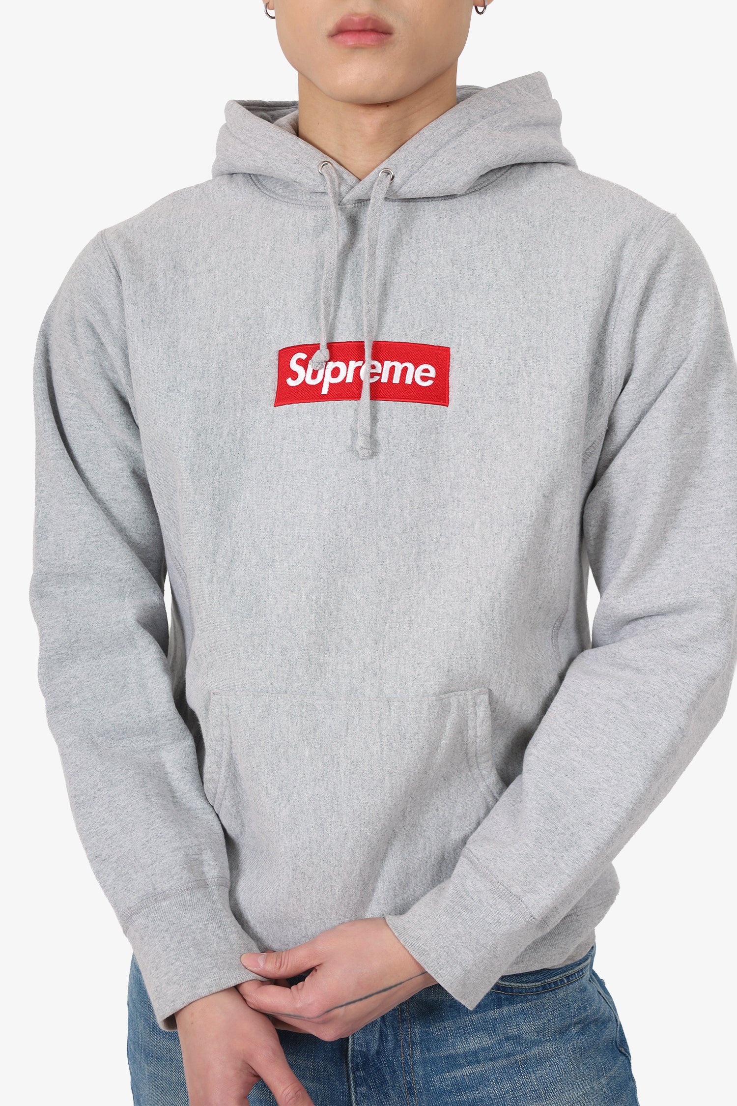 Refresh availabilitySupreme Grey/Red Logo Hoodie. Pull-on. Hooded with adjustable cinching drawstrings. Front kangaroo pocket. Silver-tone hardware. Tonal stitching.