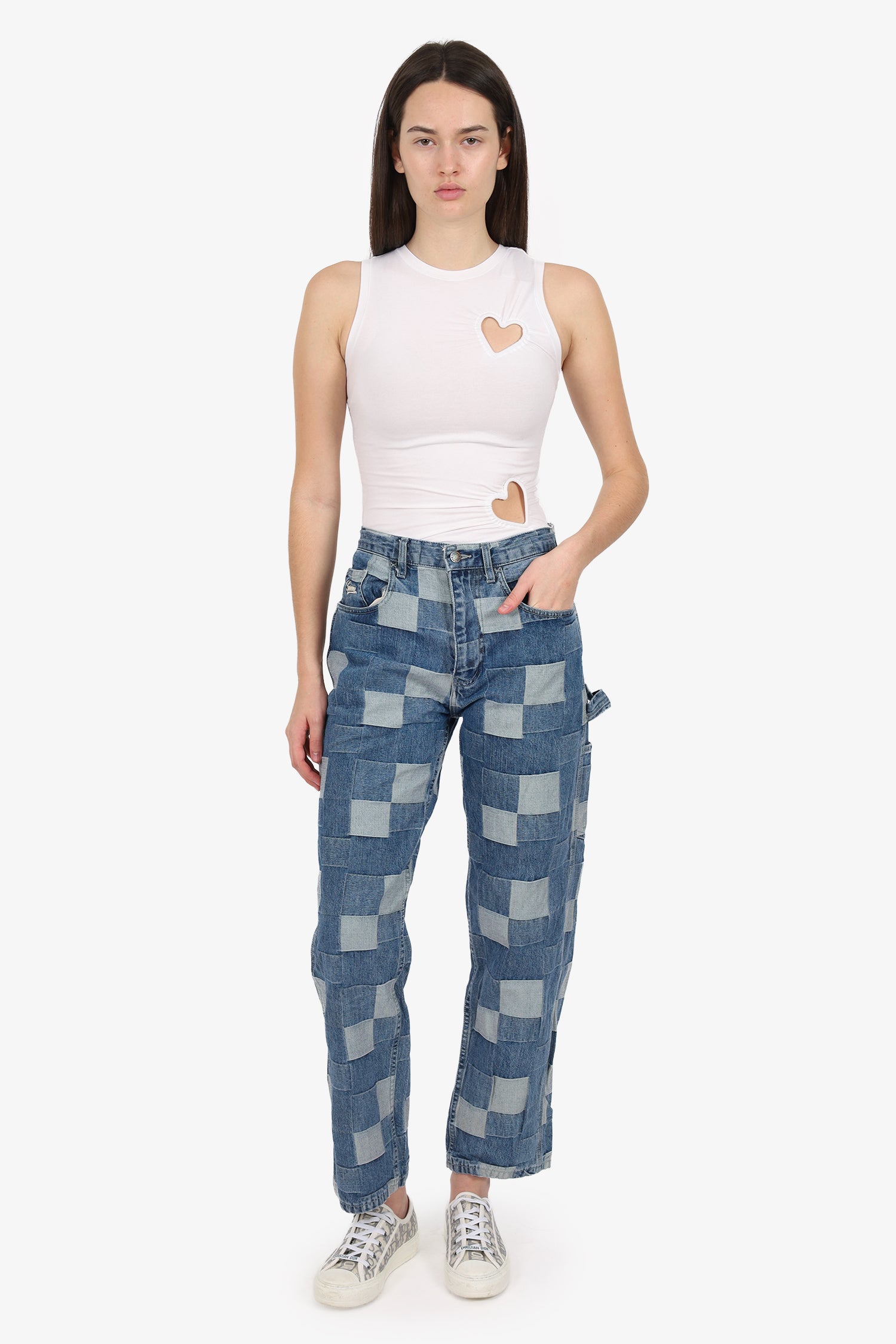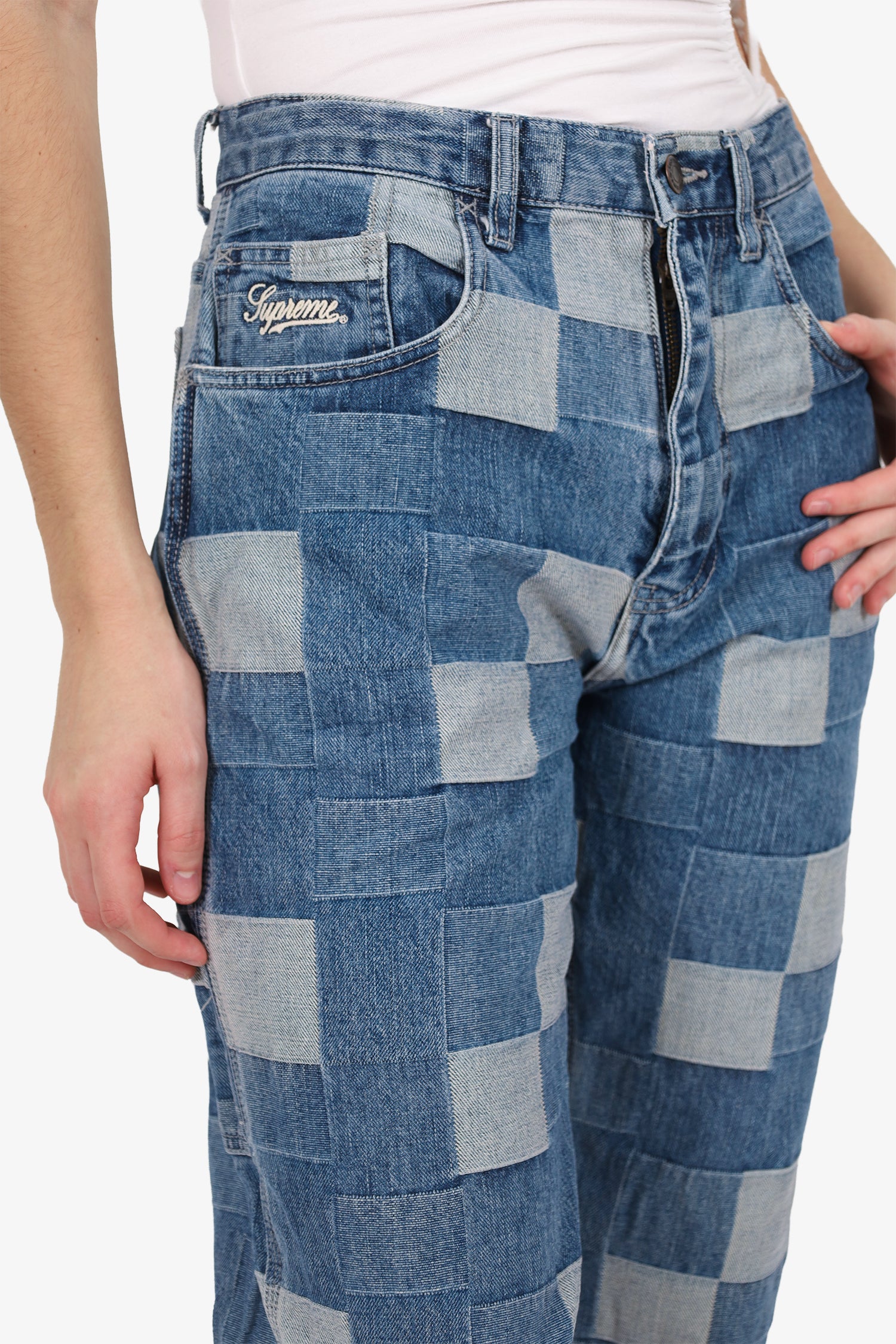 Refresh availabilitySupreme Patchwork Carpenter Jeans. Pull-on. Front zip with button closure. Waistband belt loops. 5 exterior pockets; 2 front side slip and 1 mini compartment, 2 rear slip. Bronze-tone hardware. Contrast stitching.
