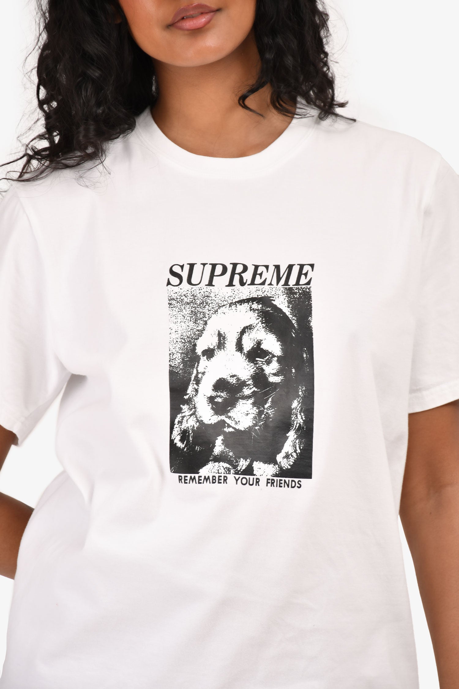Refresh availabilitySupreme White 'Remember Your Friends' T-Shirt. Round neckline. Ribbed neckline. Graphic at front. Tonal stitching.