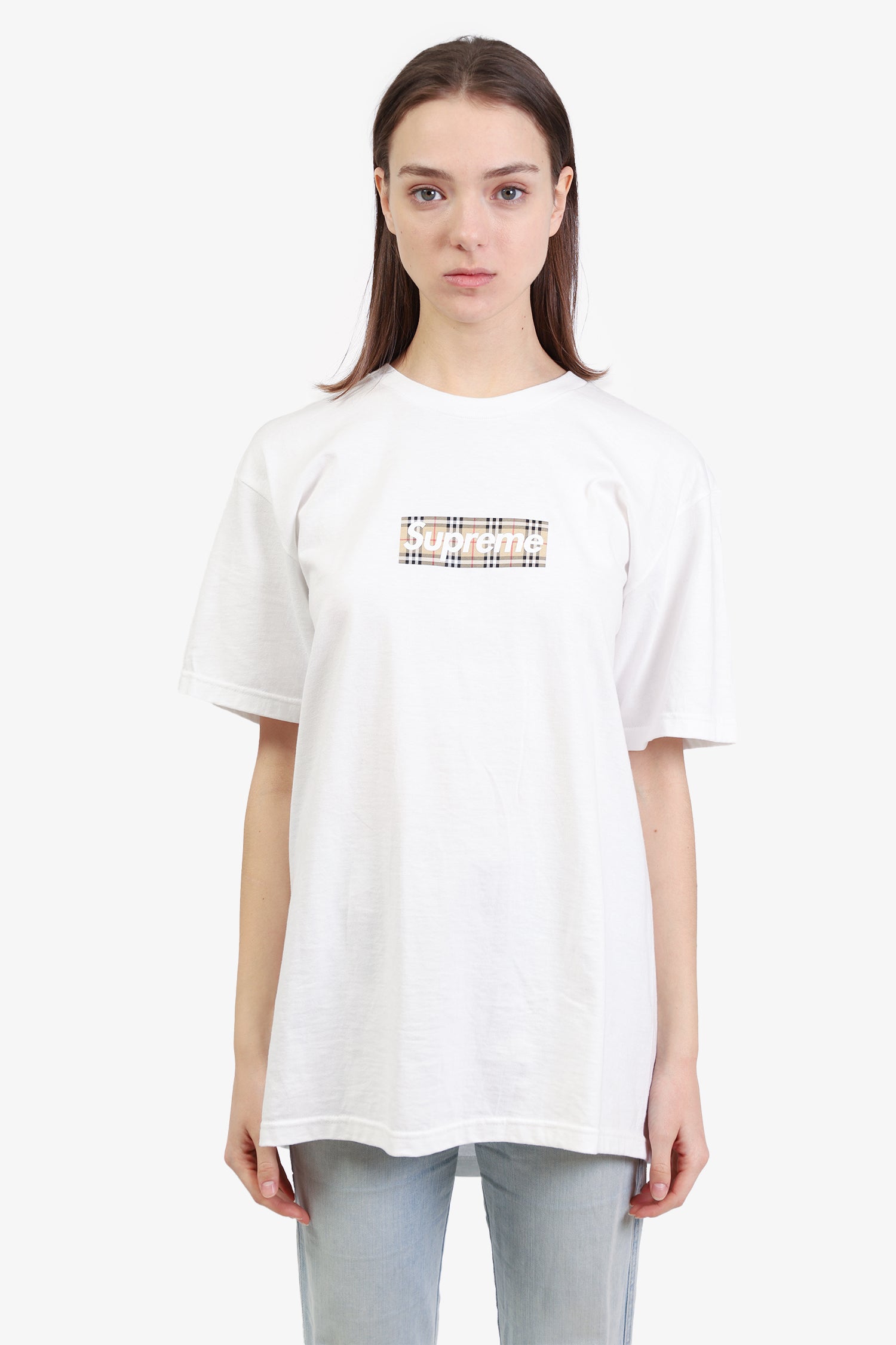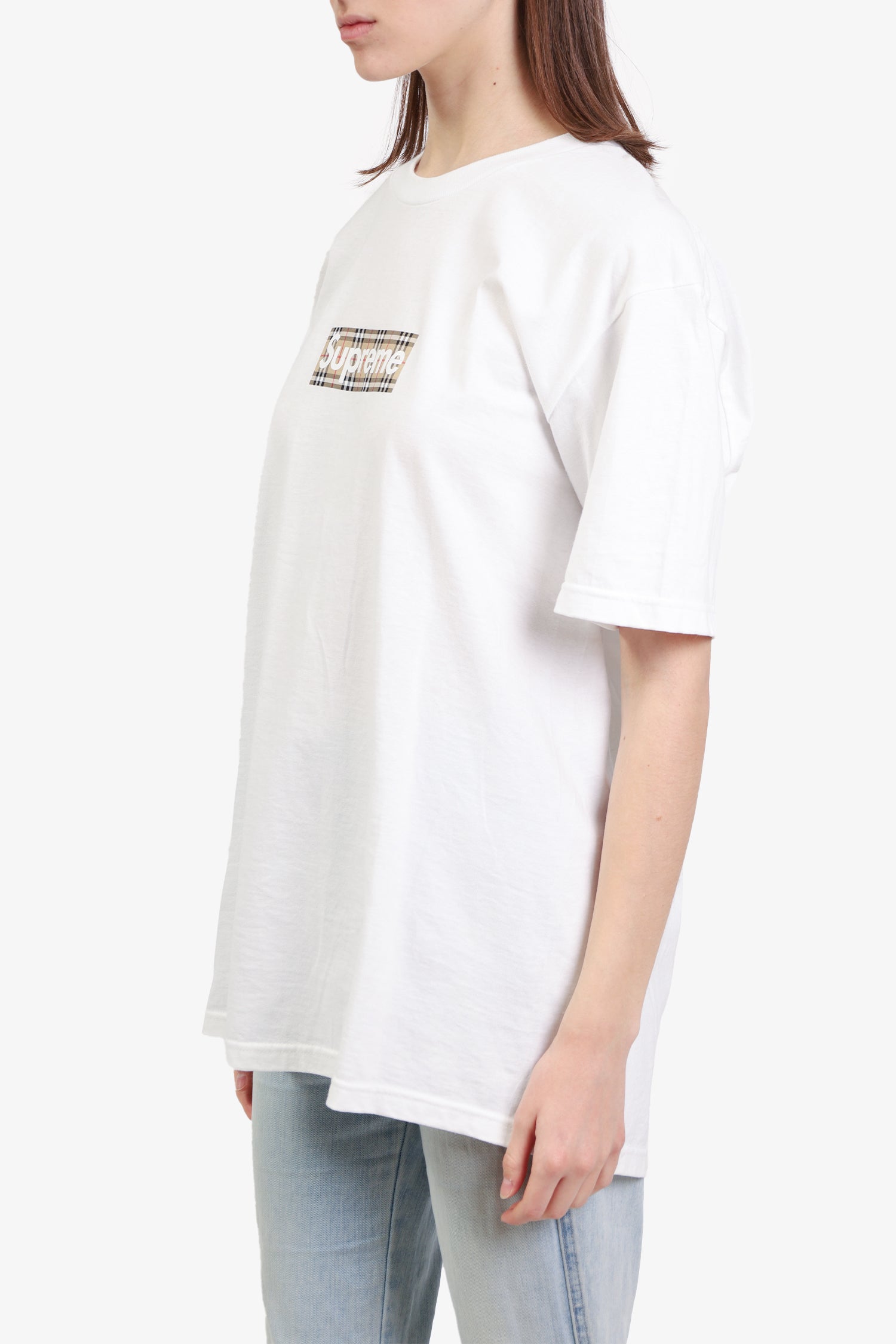 Refresh availabilitySupreme x Burberry White Cotton Box Logo T-Shirt. Round neck. Pull-on. Tonal stitching.