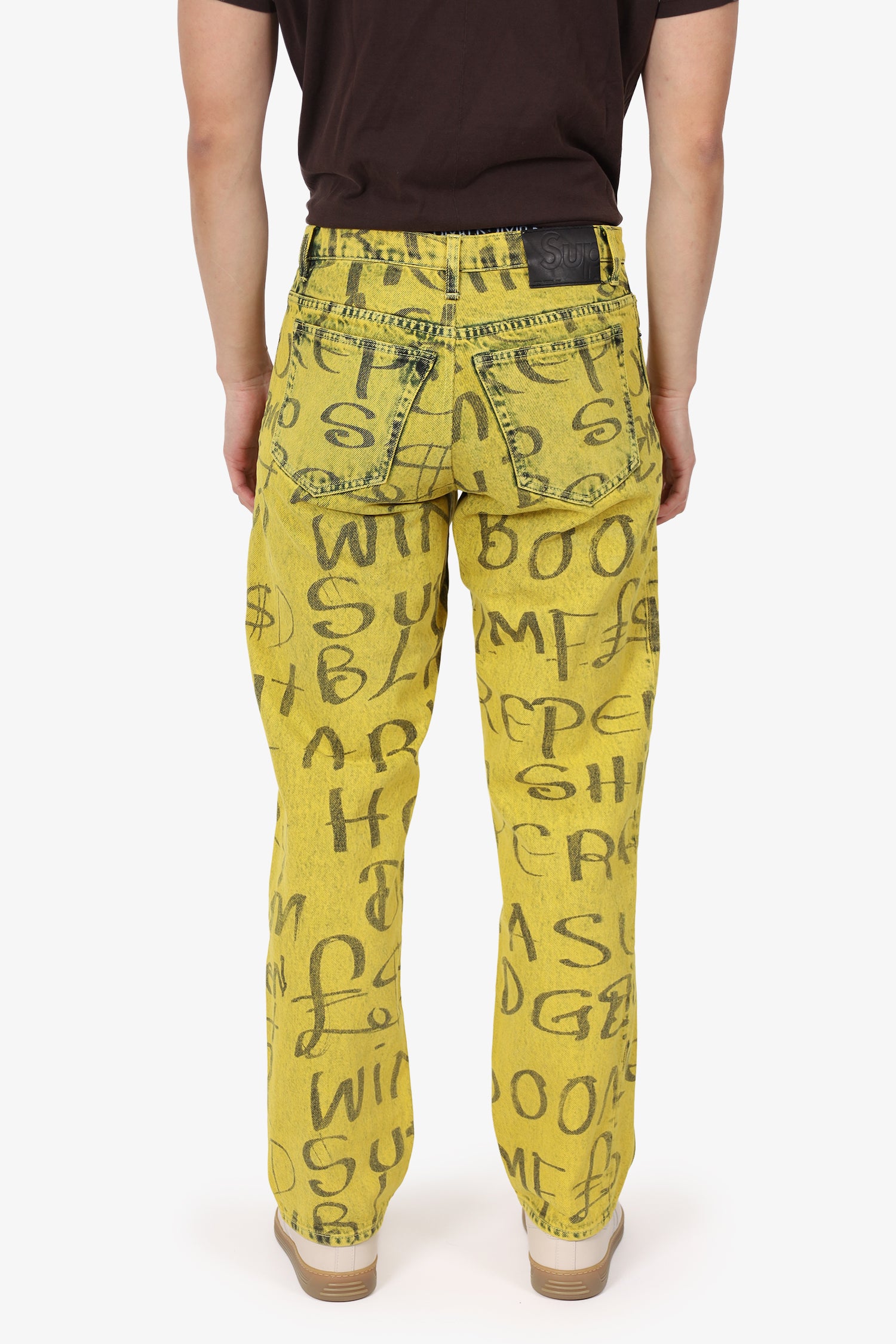 Refresh availabilitySupreme Yellow Printed Jeans. Slip-on. Front zip with button closure. Waistband belt loops. 5 exterior pockets; 2 front side slip and 1 mini compartment, 2 rear slip. Bronze-tone hardware. Tonal stitching.