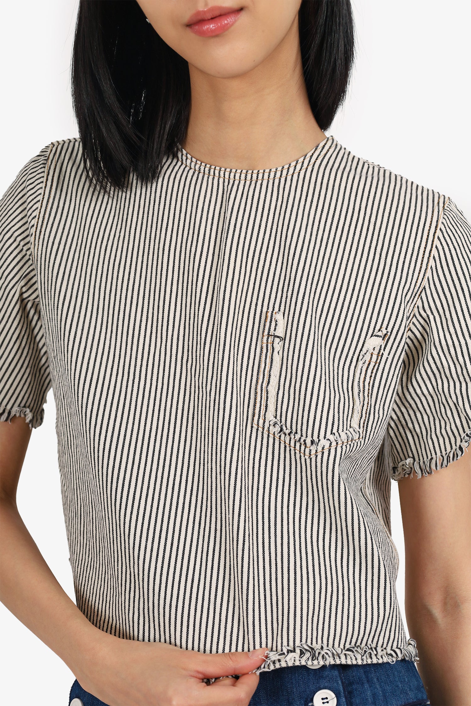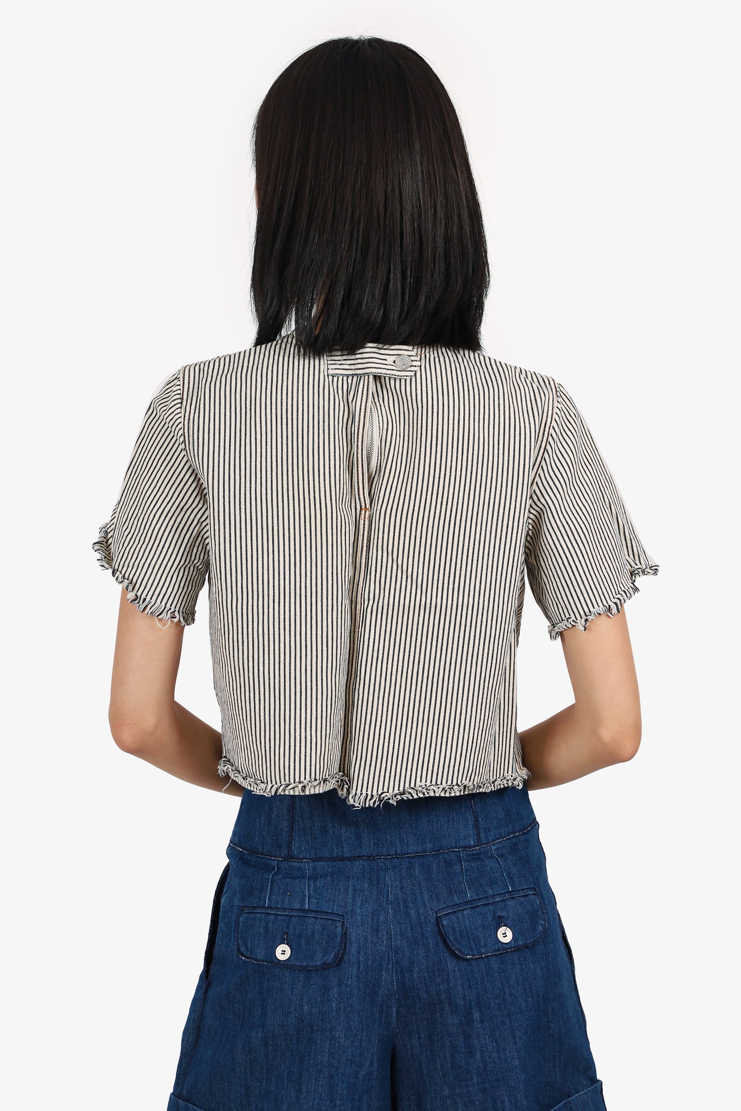Refresh availabilityT by Alexander Wang Black/White Striped Frayed Hem Sleeveless Top. Pull-on. Round-neckline. Rear zip and button-up closure. Frayed sleeve cuffs and waistband. Silver-tone hardware. Contrast and tonal stitching.