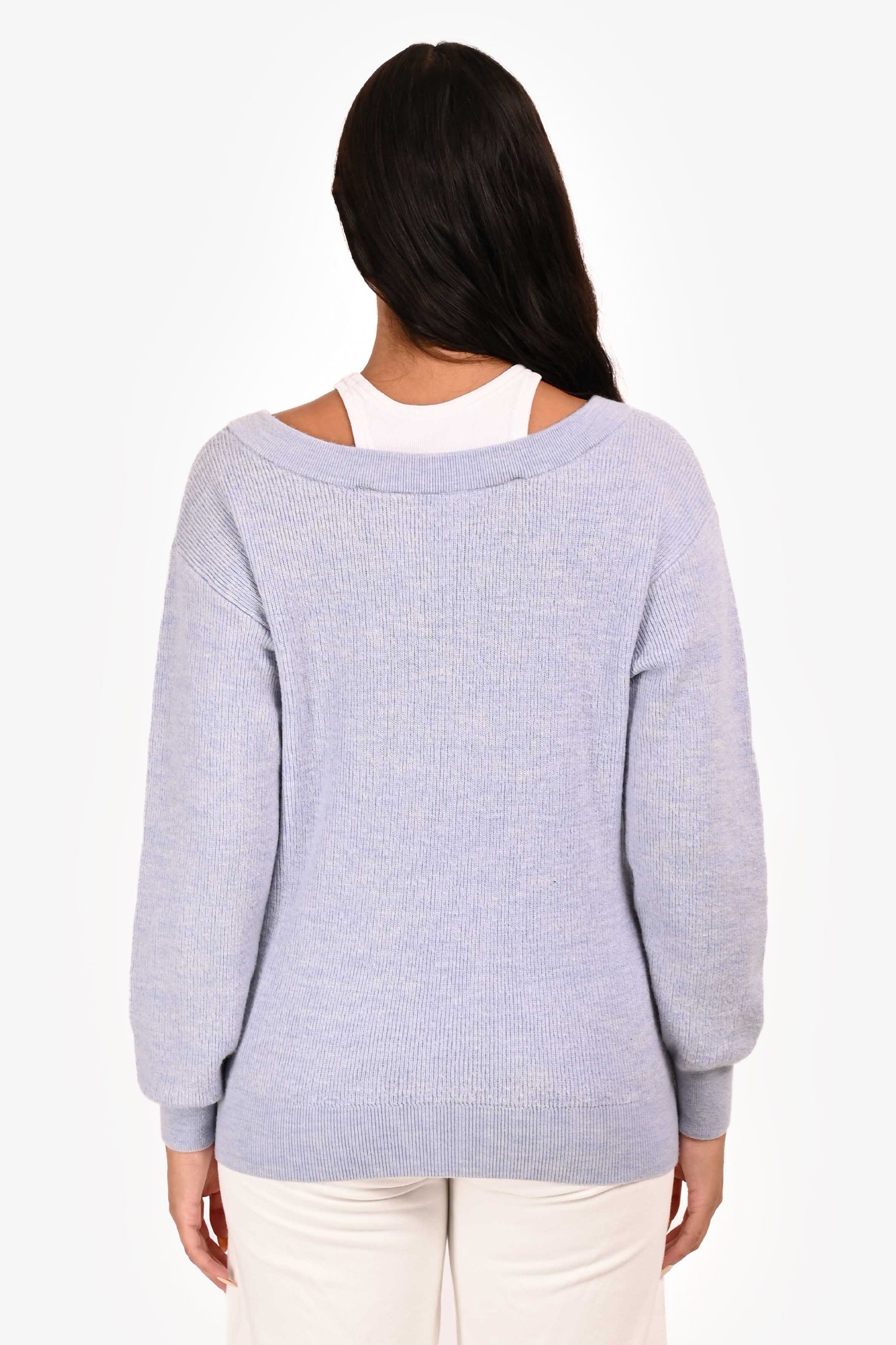 Refresh availabilityT by Alexander Wang Light Blue Merino Wool V Neck Sweater. Built-in tak top detail. Tonal stitching.