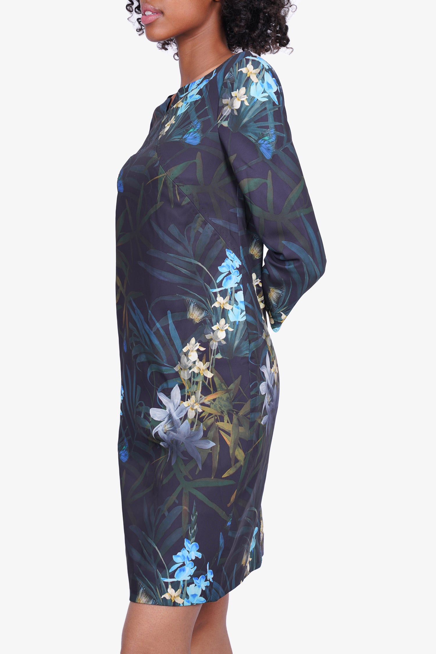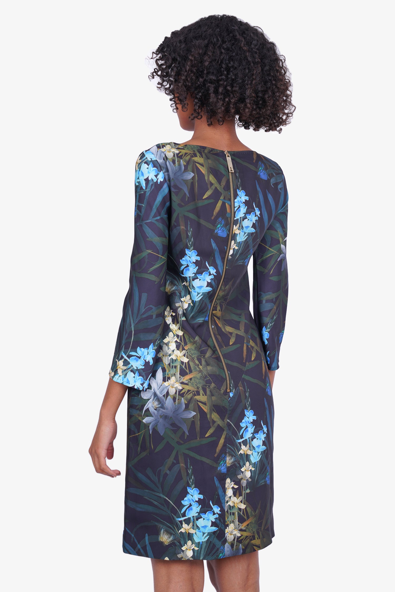 Refresh availabilityTed Baker Multicolour Three Quarter Sleeve Floral Dress. Round neckline with centre notch. Back zipper closure. Lined. Tonal stitching.