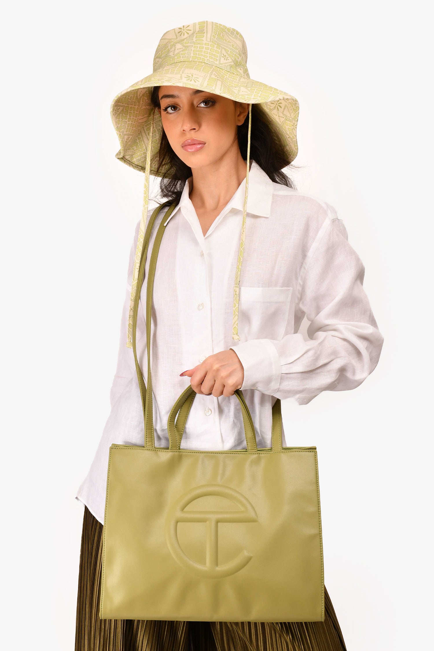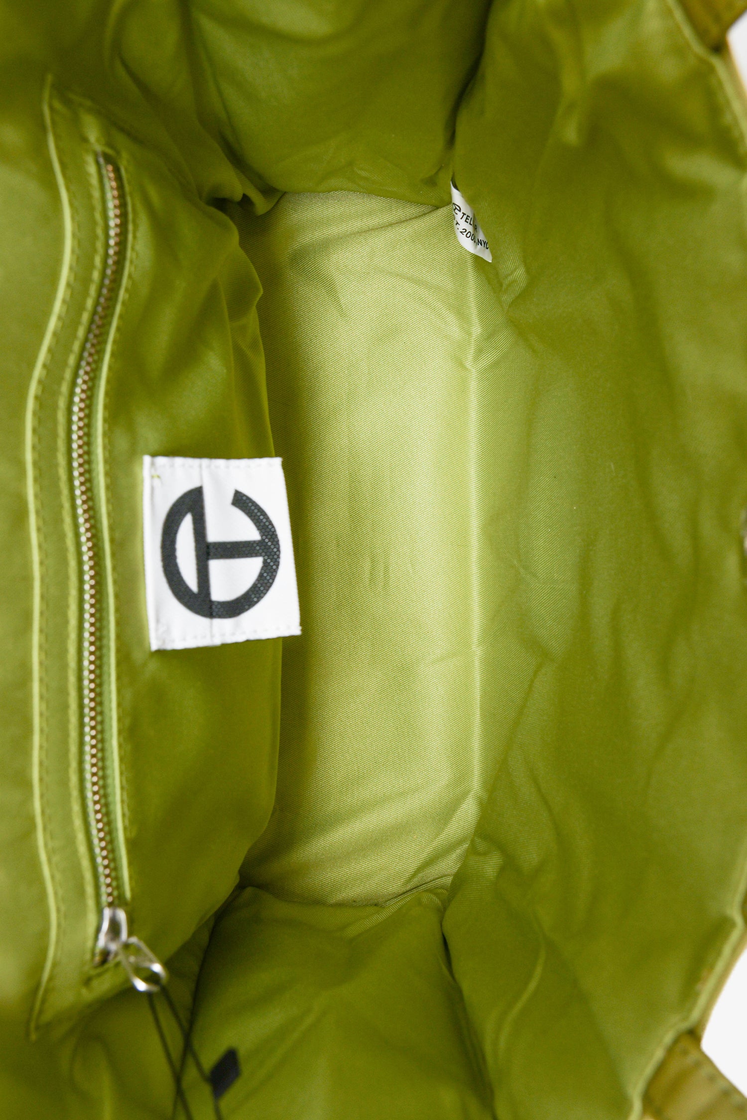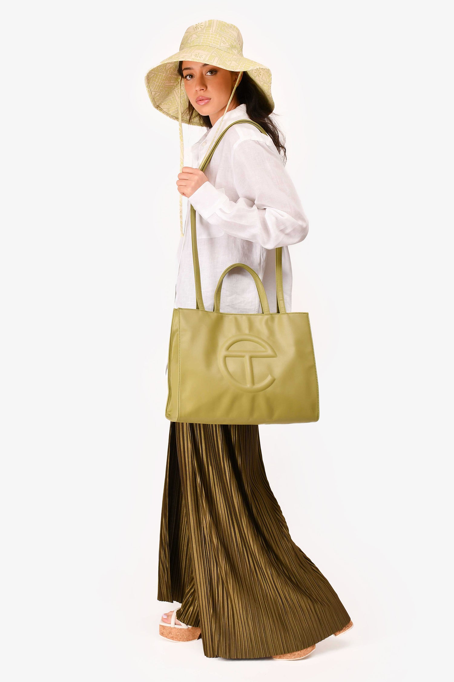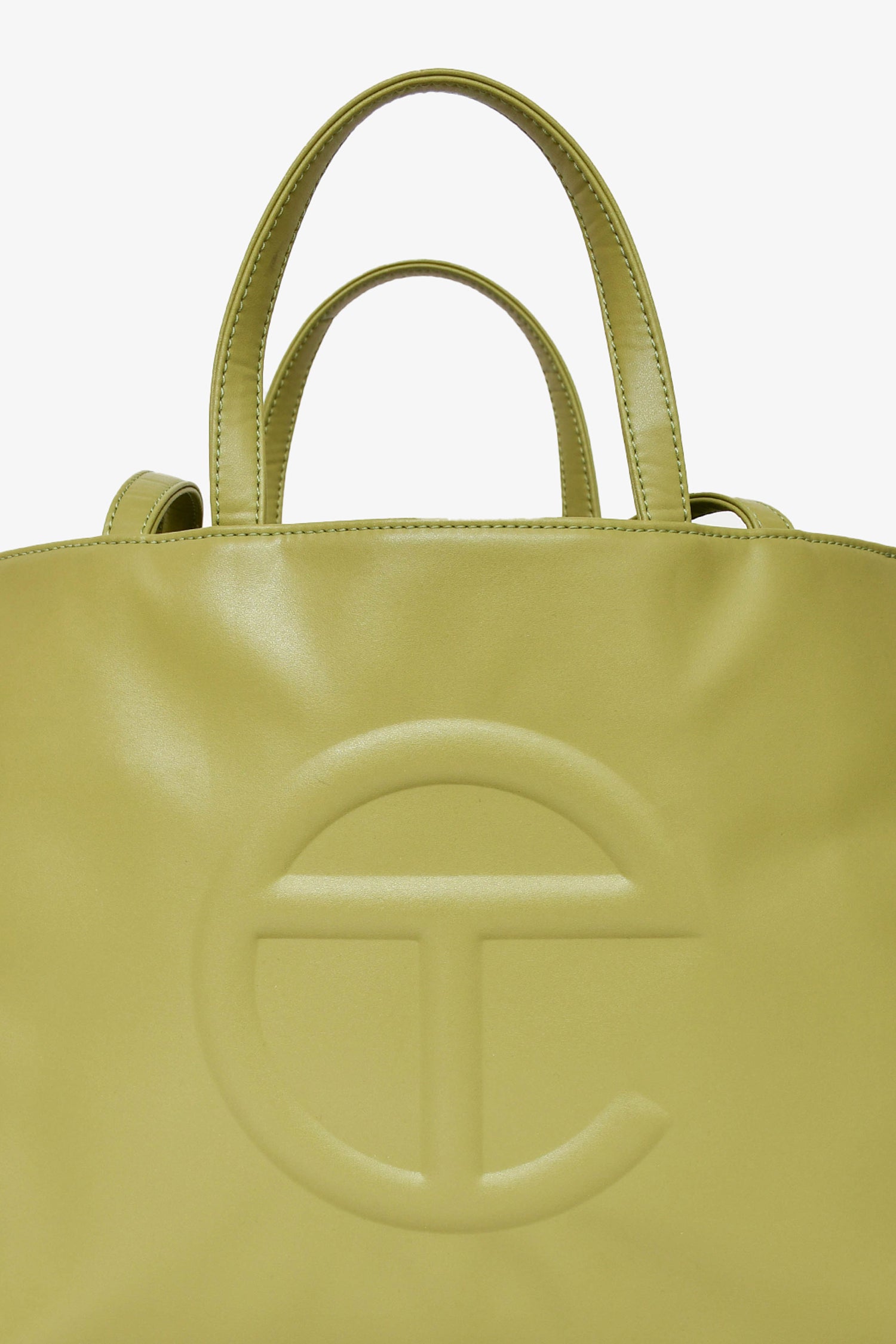 Refresh availabilityTelfar Green Faux Leather Medium Tote. Top magnet closure. Single wall pocket with zip closure on the interior. Dual top handles. Dual shoulder straps. Lined interior. Tonal stitching.