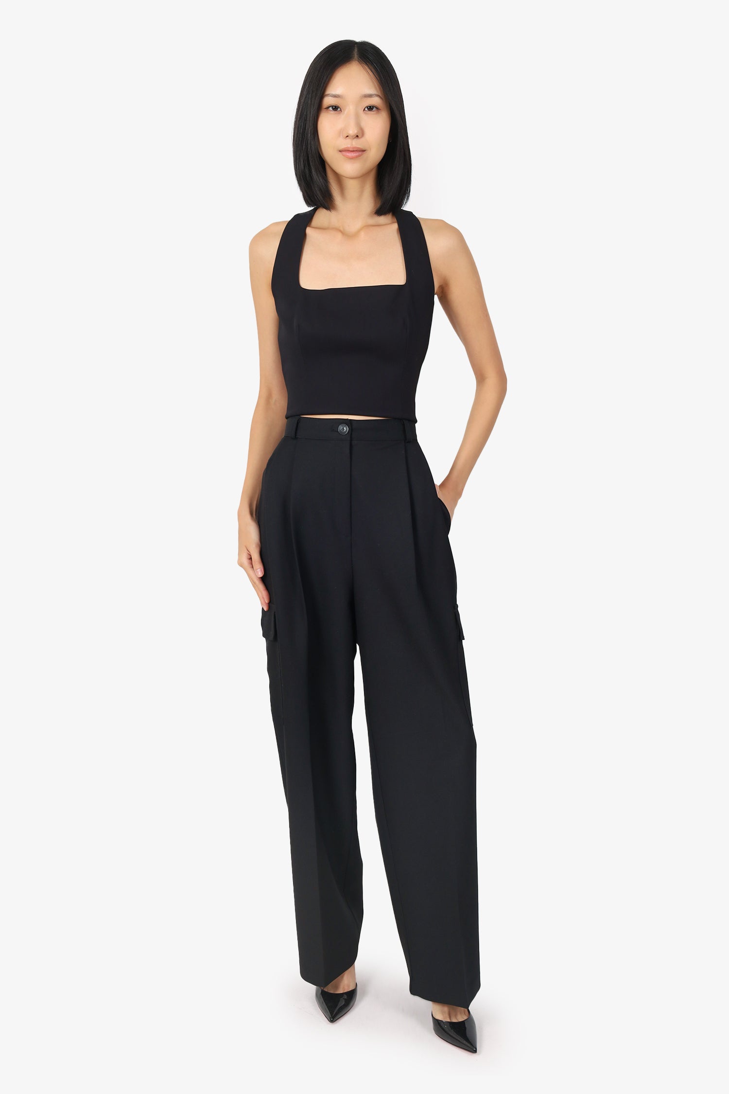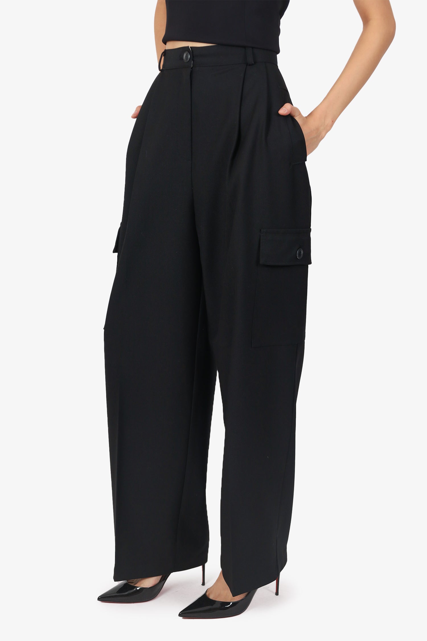 Refresh availabilityThe Frankie Shop Black Cargo Style Trousers. Slip on. Front zip with button-up closure. Waistband belt-loops. 6 exterior pockets; 2 front slip, 2 side button-up and 2 faux-rear slip. Tonal stitching.