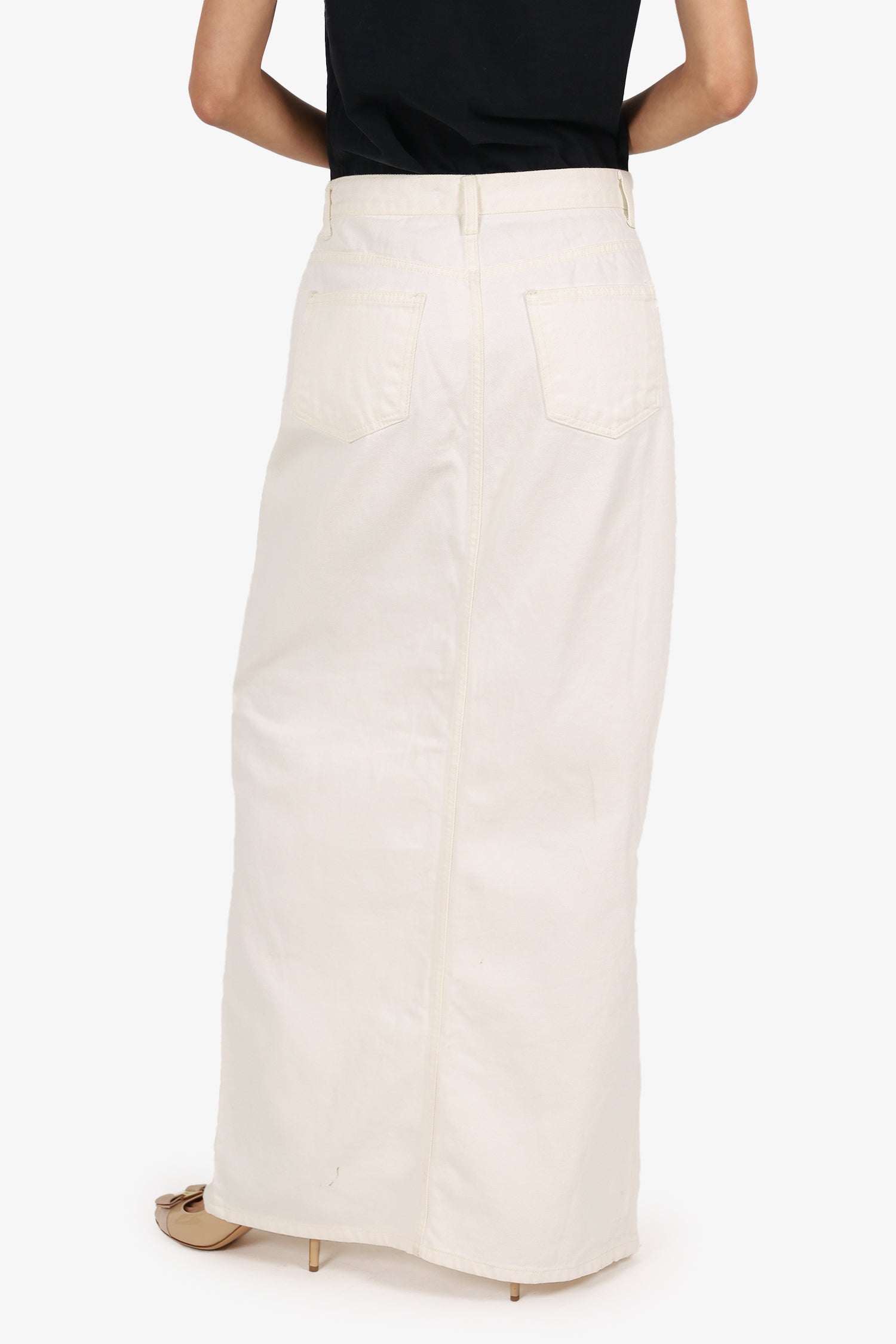 Refresh availabilityThe Frankie Shop White Denim Maxi Skirt. Slip-on. Front button-up closure. Waistband belt loops. 5 exterior pockets; 2 front side slip and 1 mini compartment, 2 rear slip. Bottom centre slit. Silver-tone hardware. Tonal stitching.
