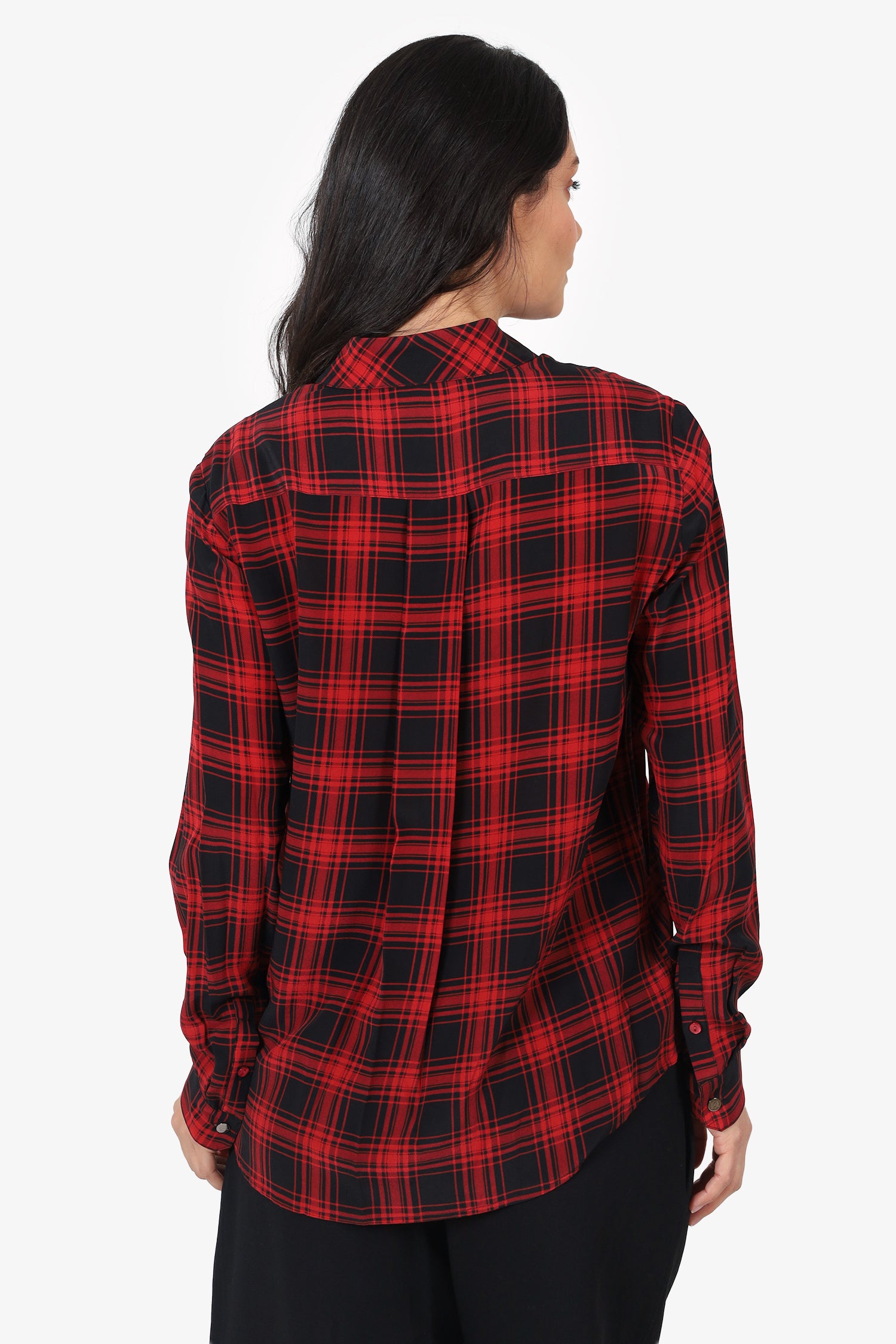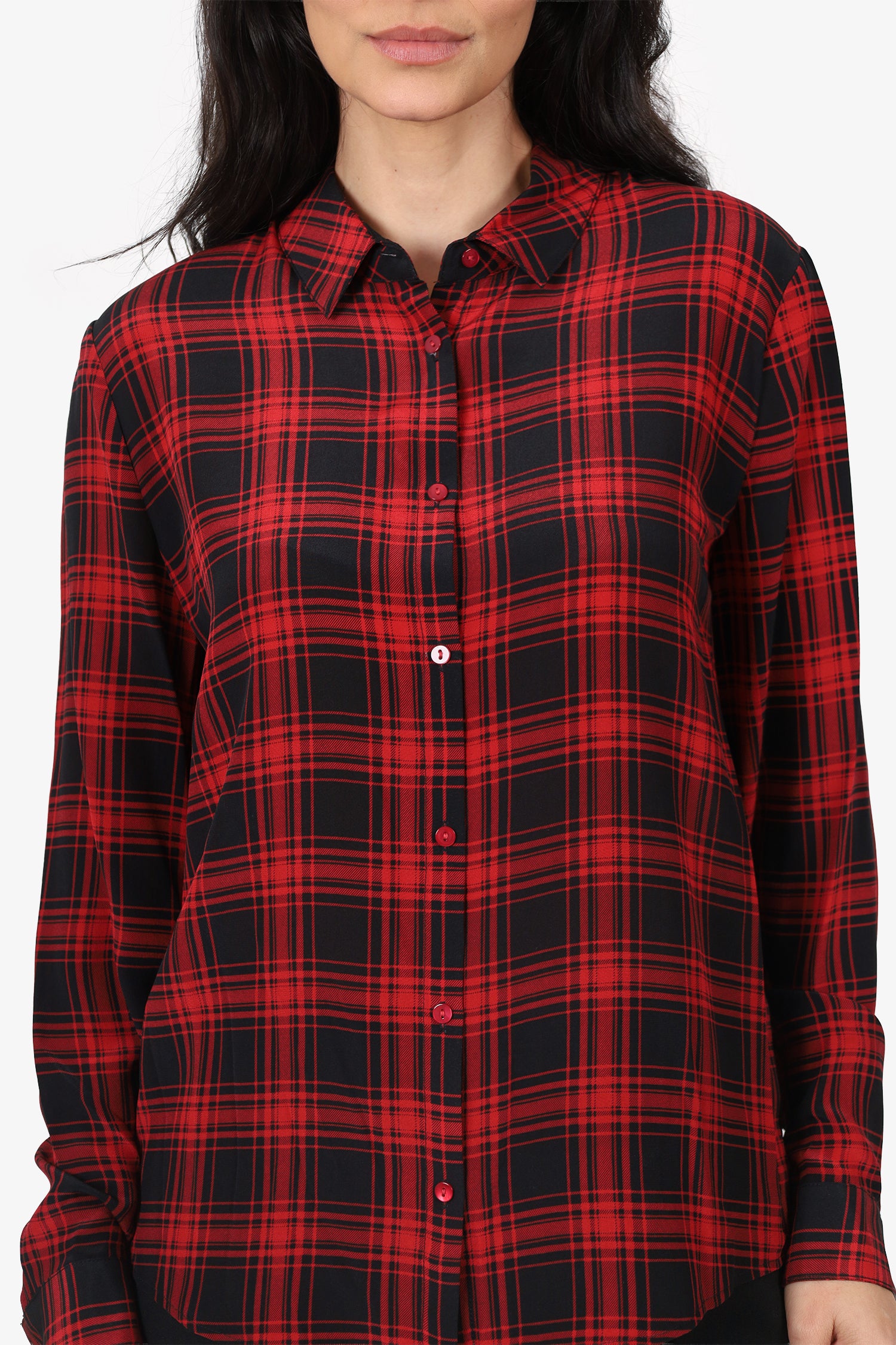 Refresh availabilityThe Kooples Black/Red Plaid Silk Plaid Print Blouse. Pull-on. Collared neckline. Front button-up closure. Sleeve cuffs with button-up closure. Tonal stitching.