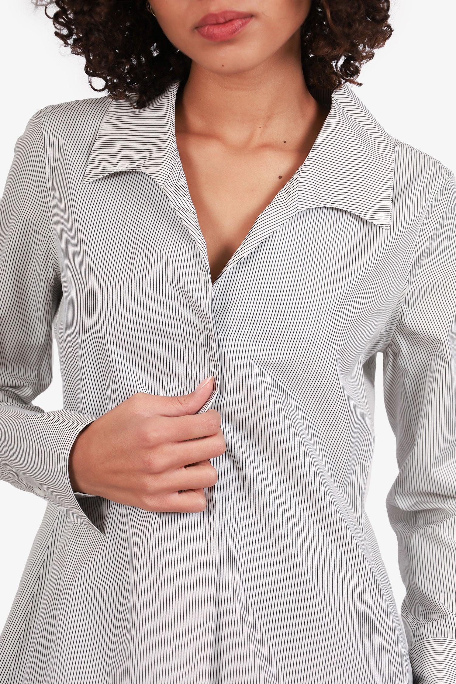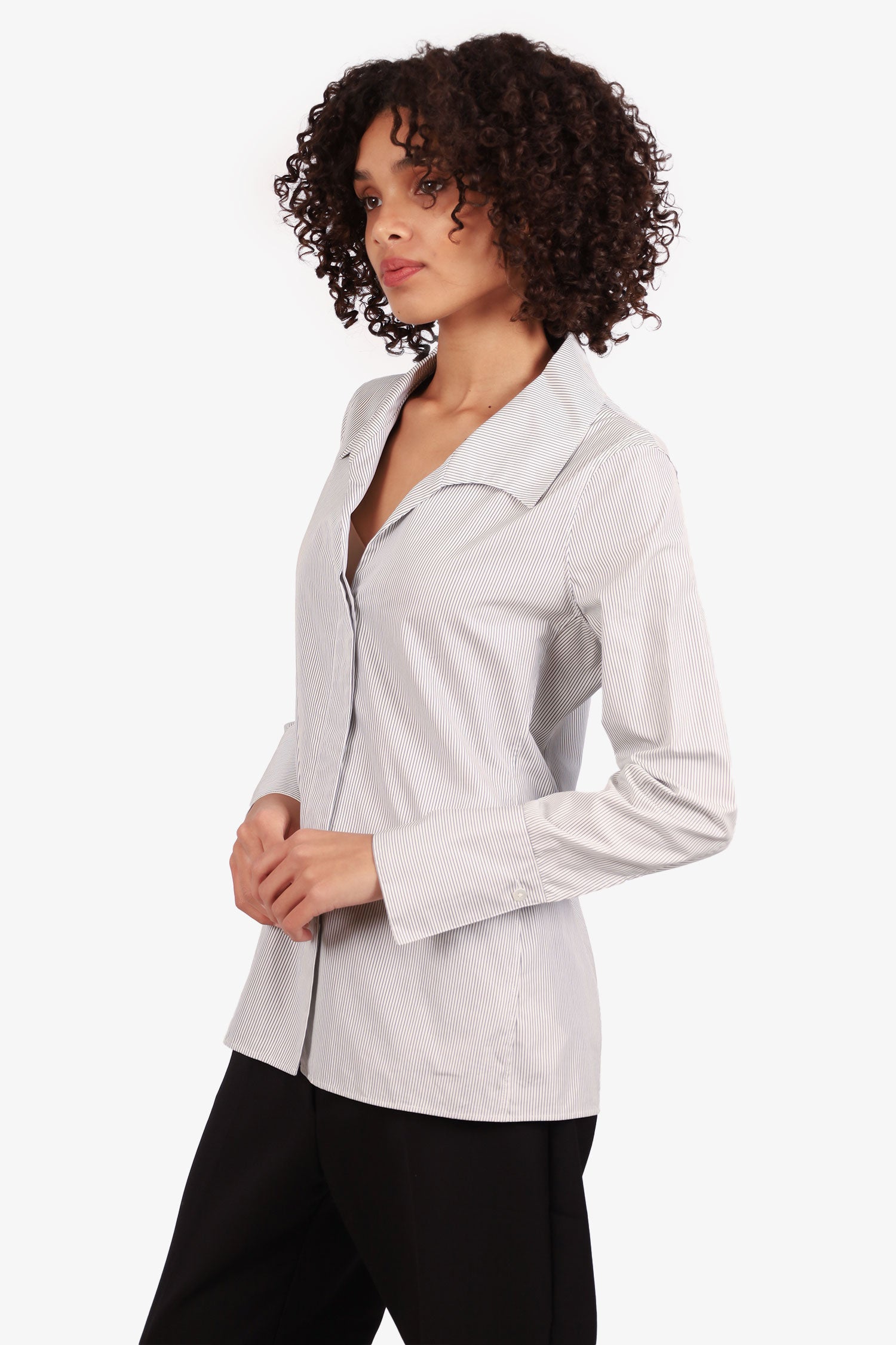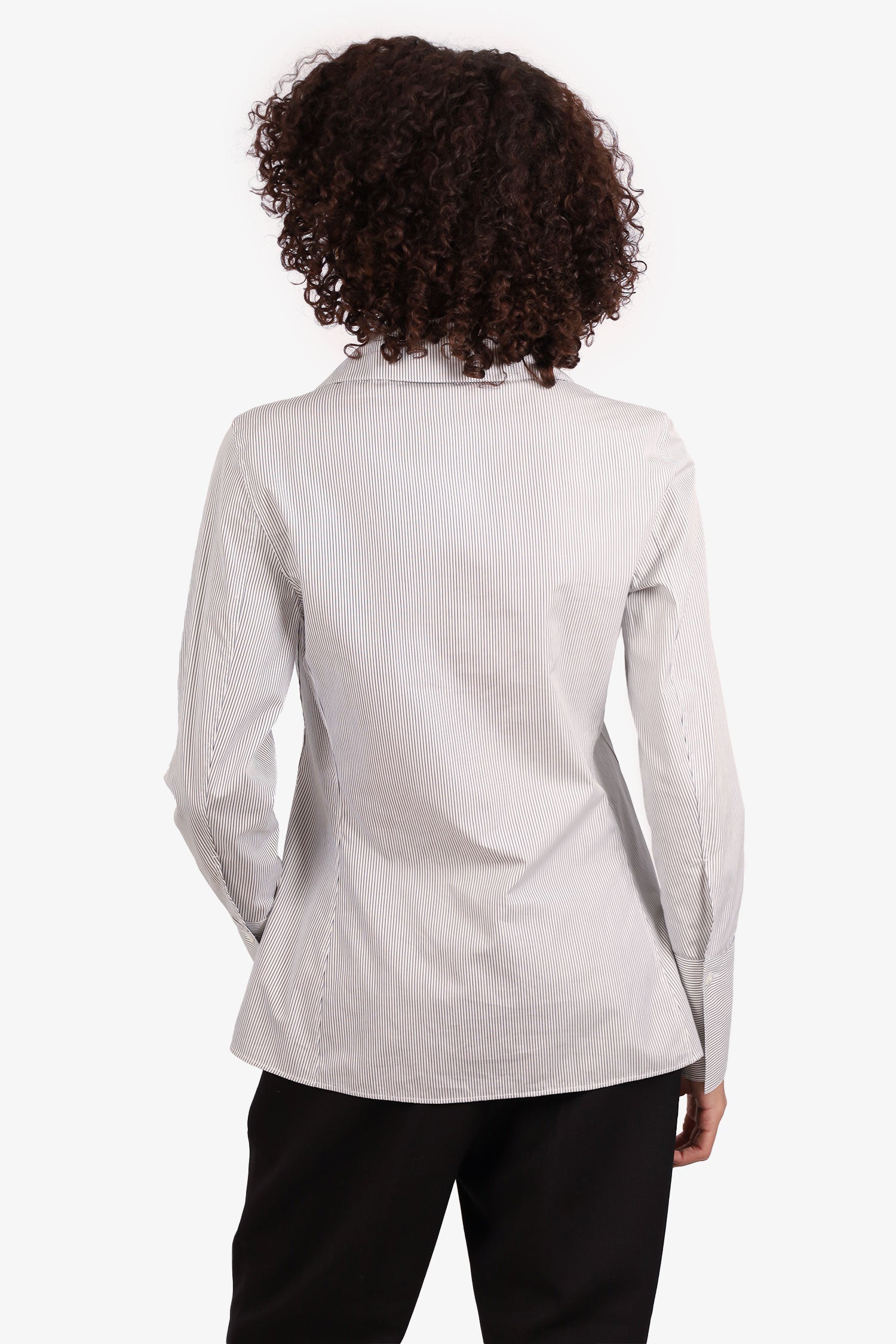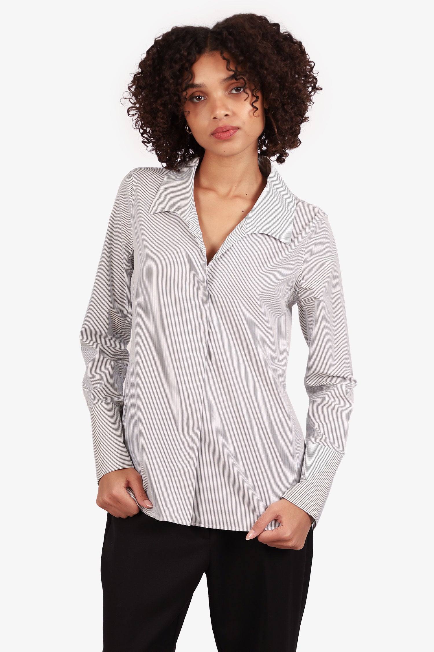 Refresh availabilityThe Row White/Black Stripes Long Sleeve Shirt. Collared neckline. Front and sleeve cuff button-up closure. Unlined. Tonal stitching.