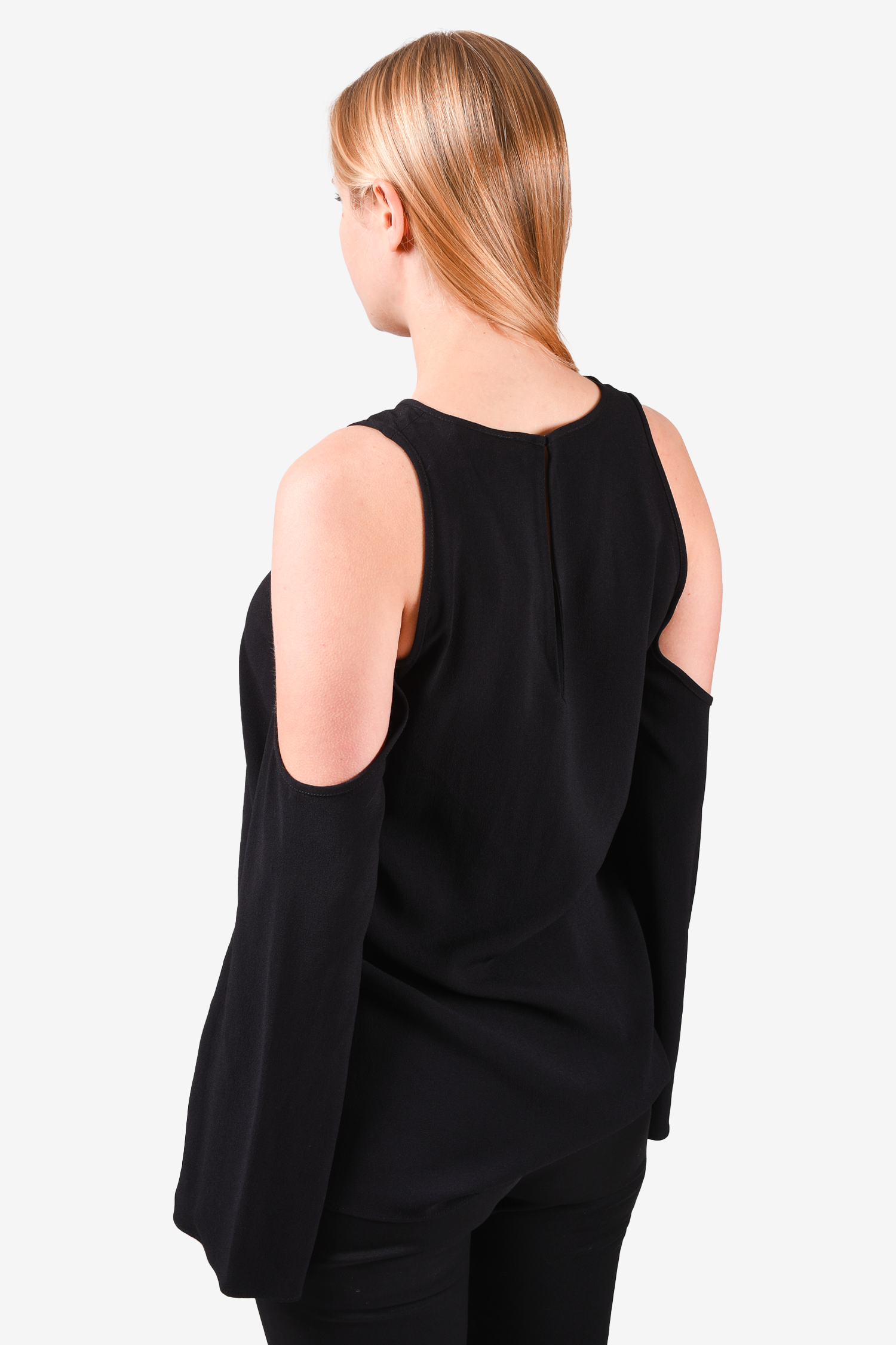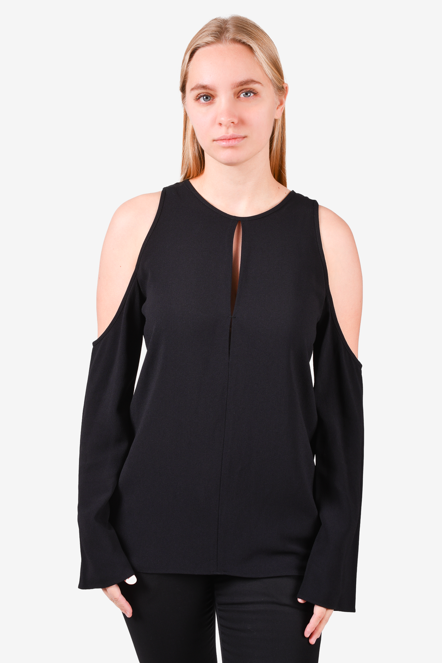 Refresh availabilityTheory Black Cold Shoulder Blouse. Round neck. Rear hook closure. Tonal stitching.