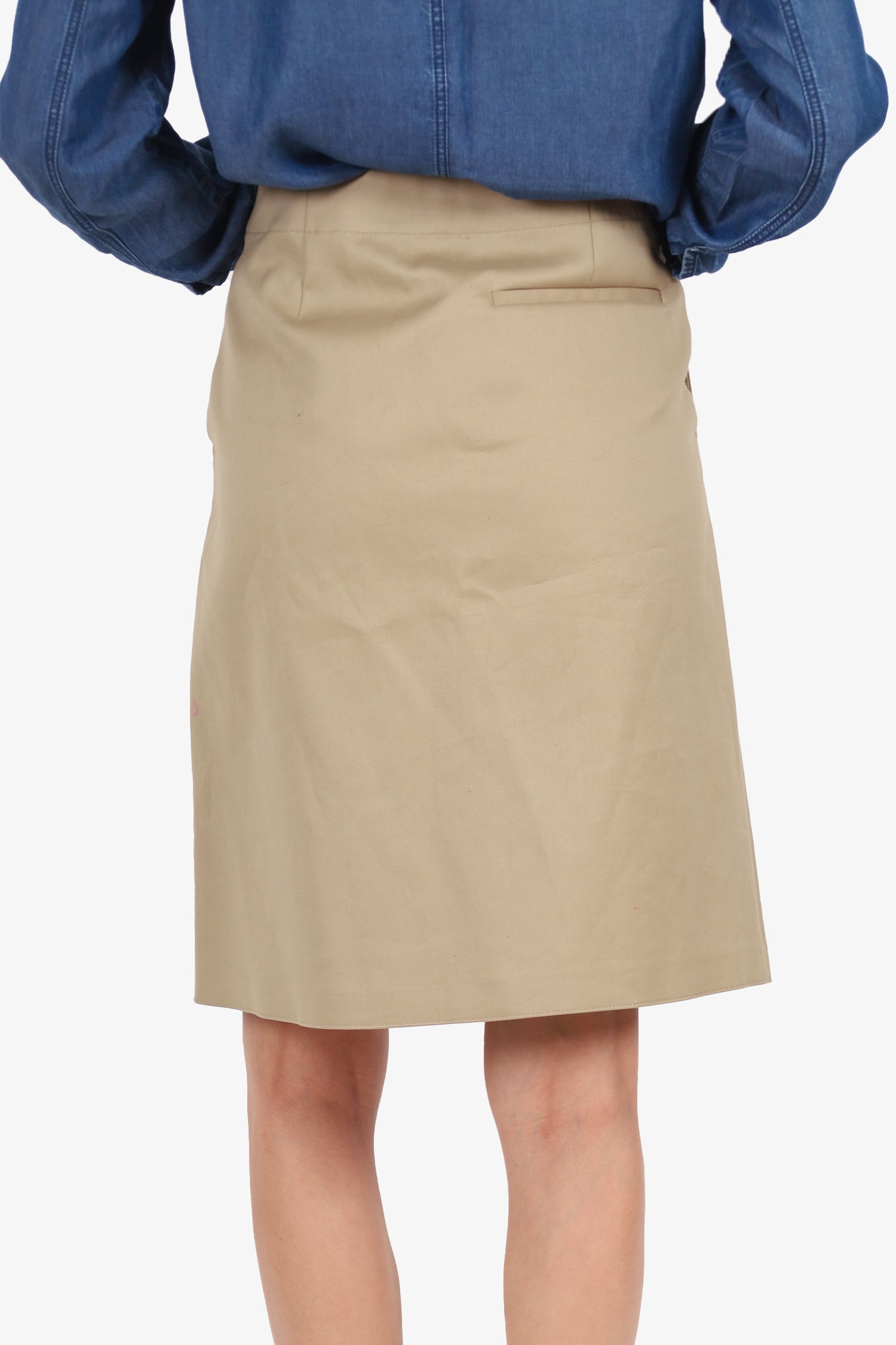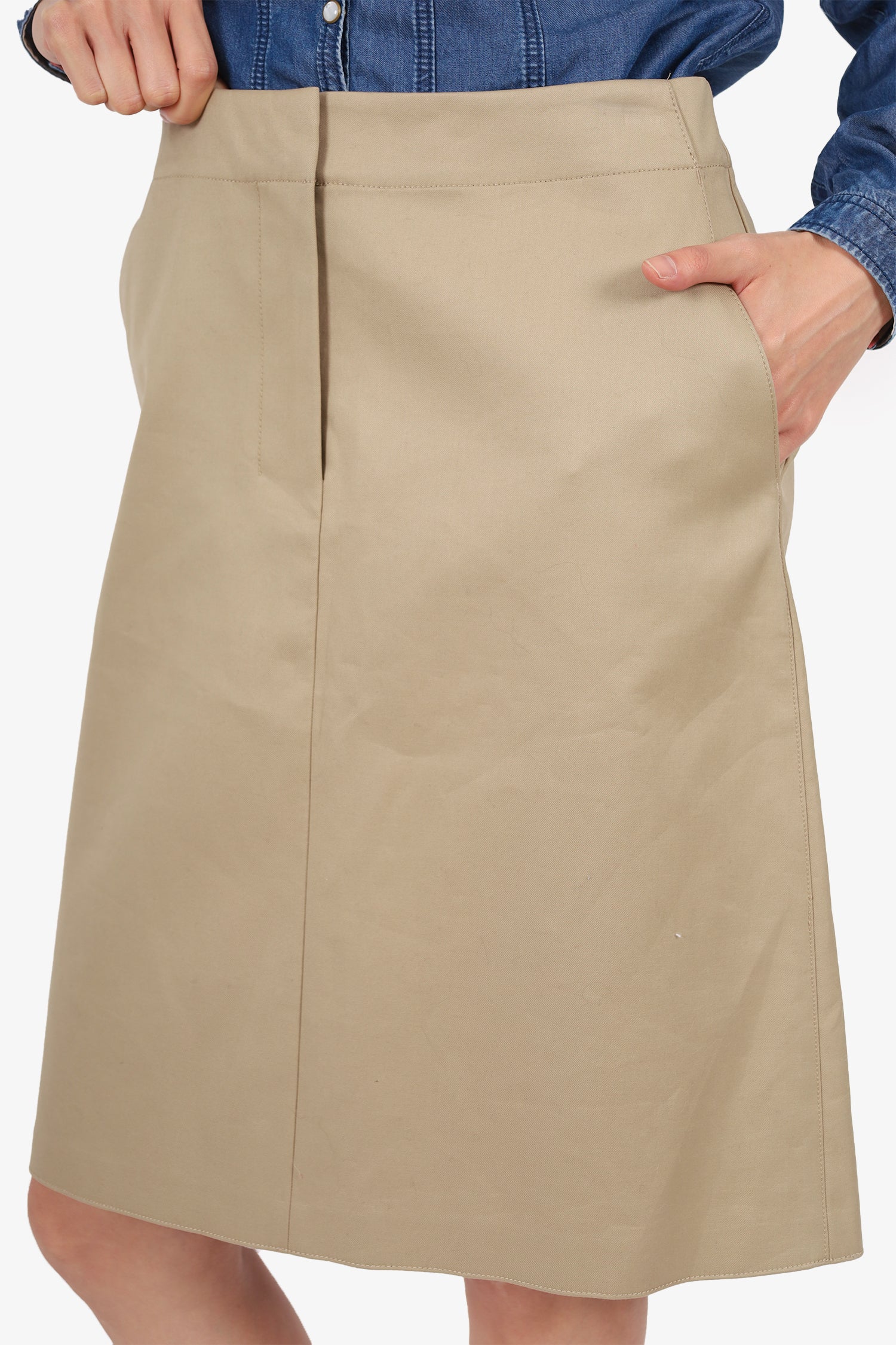Refresh availabilityTheory Khaki Midi Skirt. Slip-on. Front zip and hook closure. 3 exterior pockets; 2 side slip and 1 rear slip. Unlined. Tonal stitching.