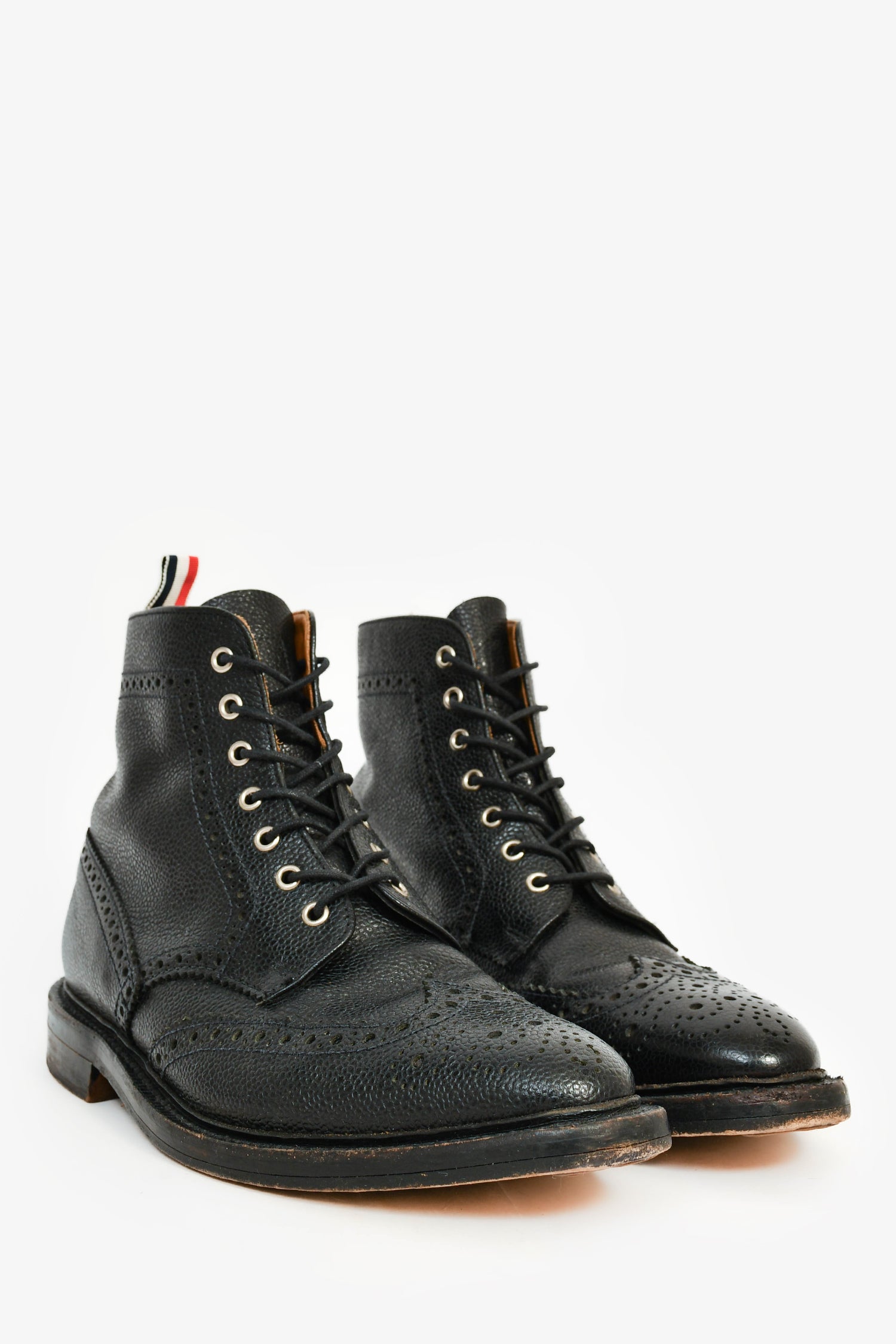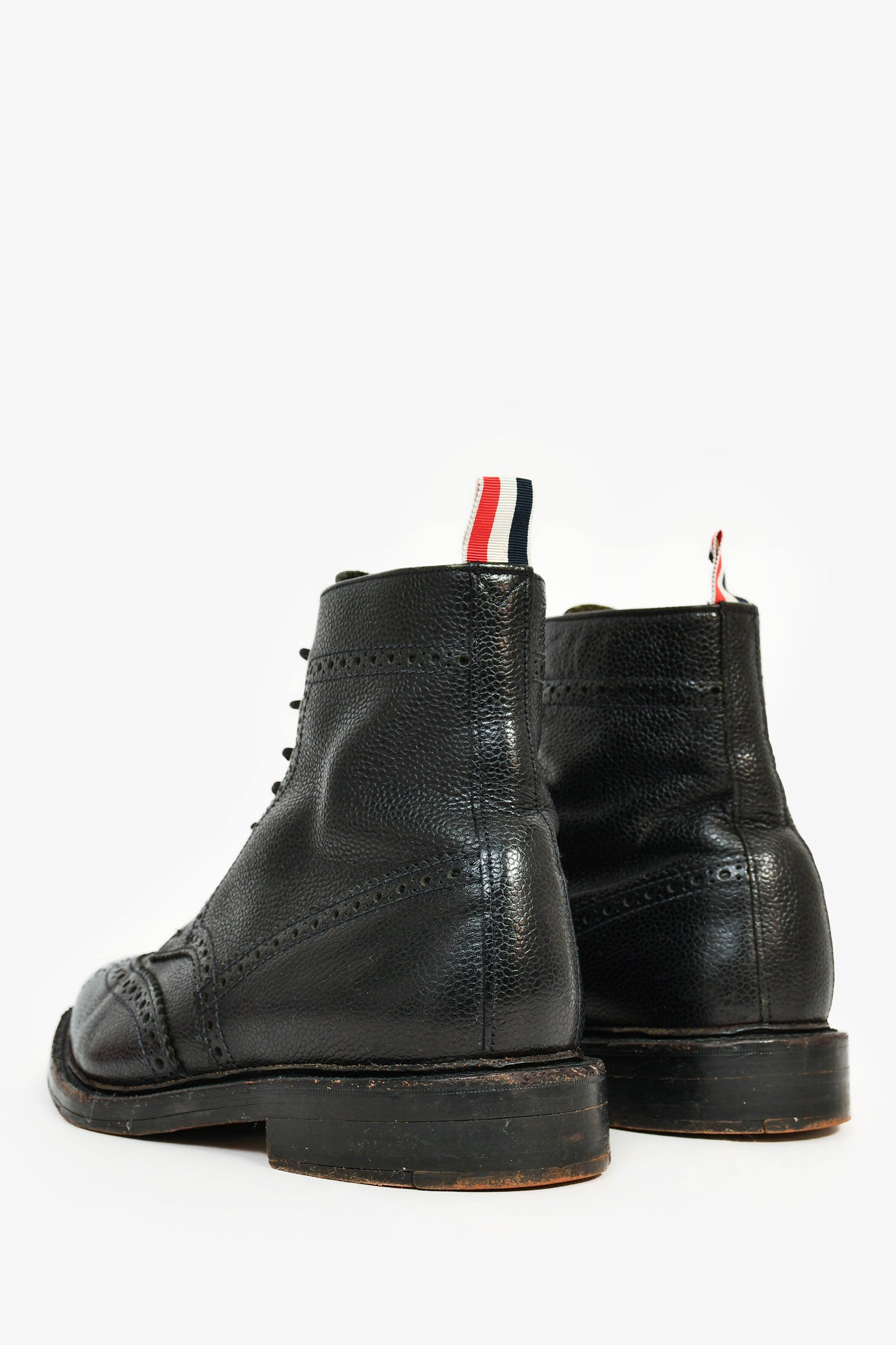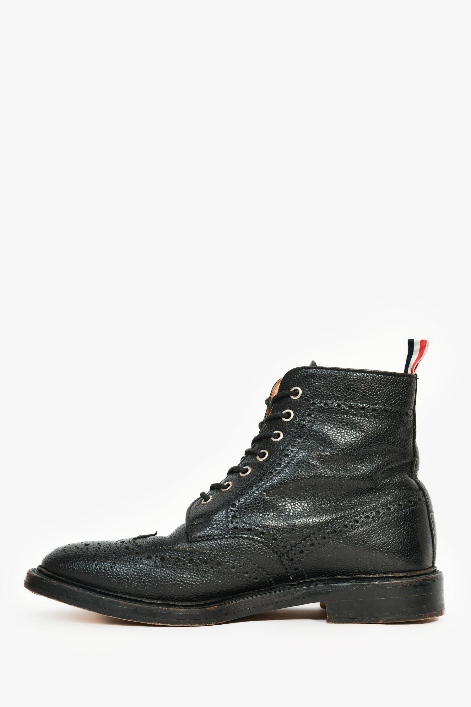 Refresh availabilityThom Browne Black Pebbled Leather Lace-Up Boots. Leather lined interior. Wooden soles. Lace-up front. Tonal stitching.