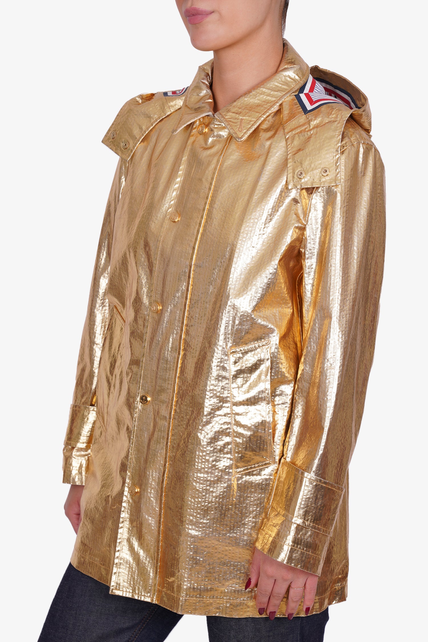 Thom Browne Gold Metallic Hooded Jacket with Stripes. Collared neckline with removable hood. Front zip-up and button closure. 2 front pockets. Adjustable button detailing on cuffs. Interior lining. Anchor detailing on buttons. Gold-toned hardware. Tonal stitching.