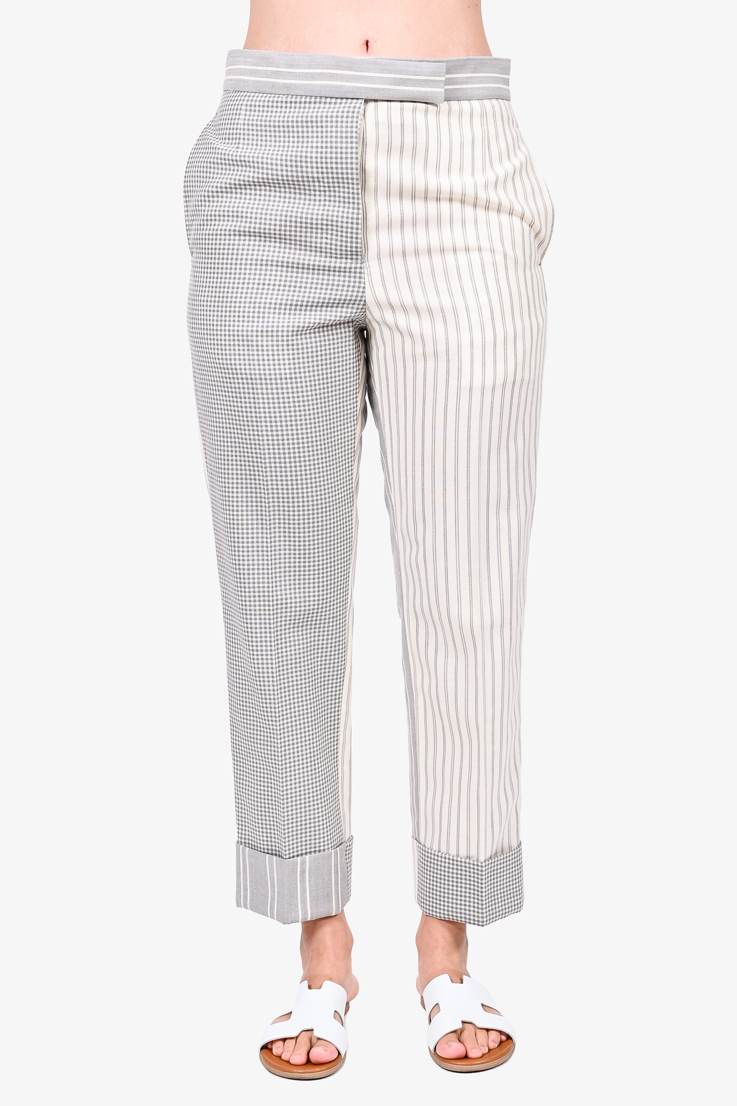 Refresh availabilityThom Browne Grey/Cream Multi-Striped Cuffed Trousers. Front zip and hook closures. Front pockets. Tonal stitching.
