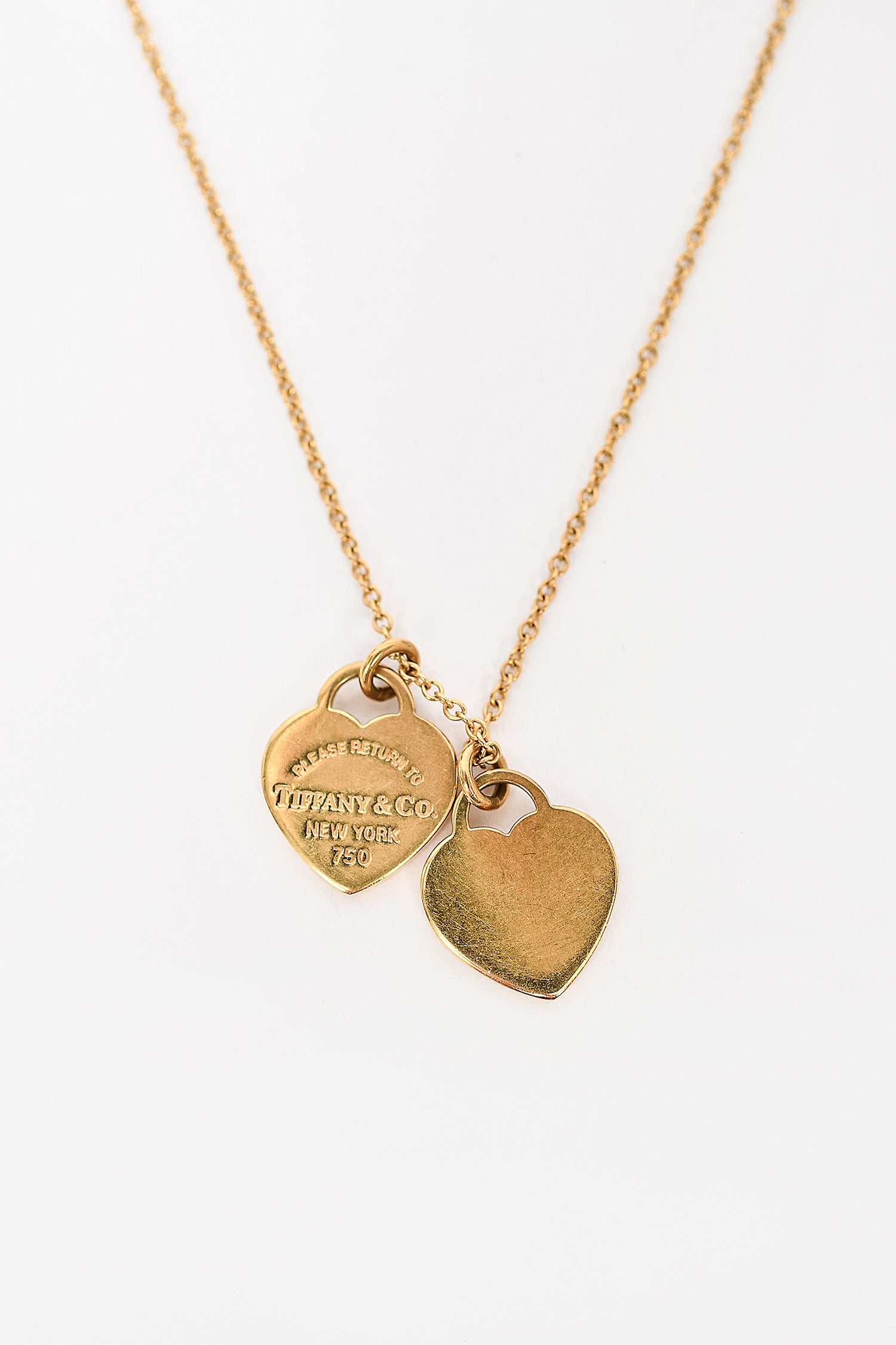 Tiffany & Co. 18K Yellow Gold Mini Double Heart Necklace. Spring ring closure.