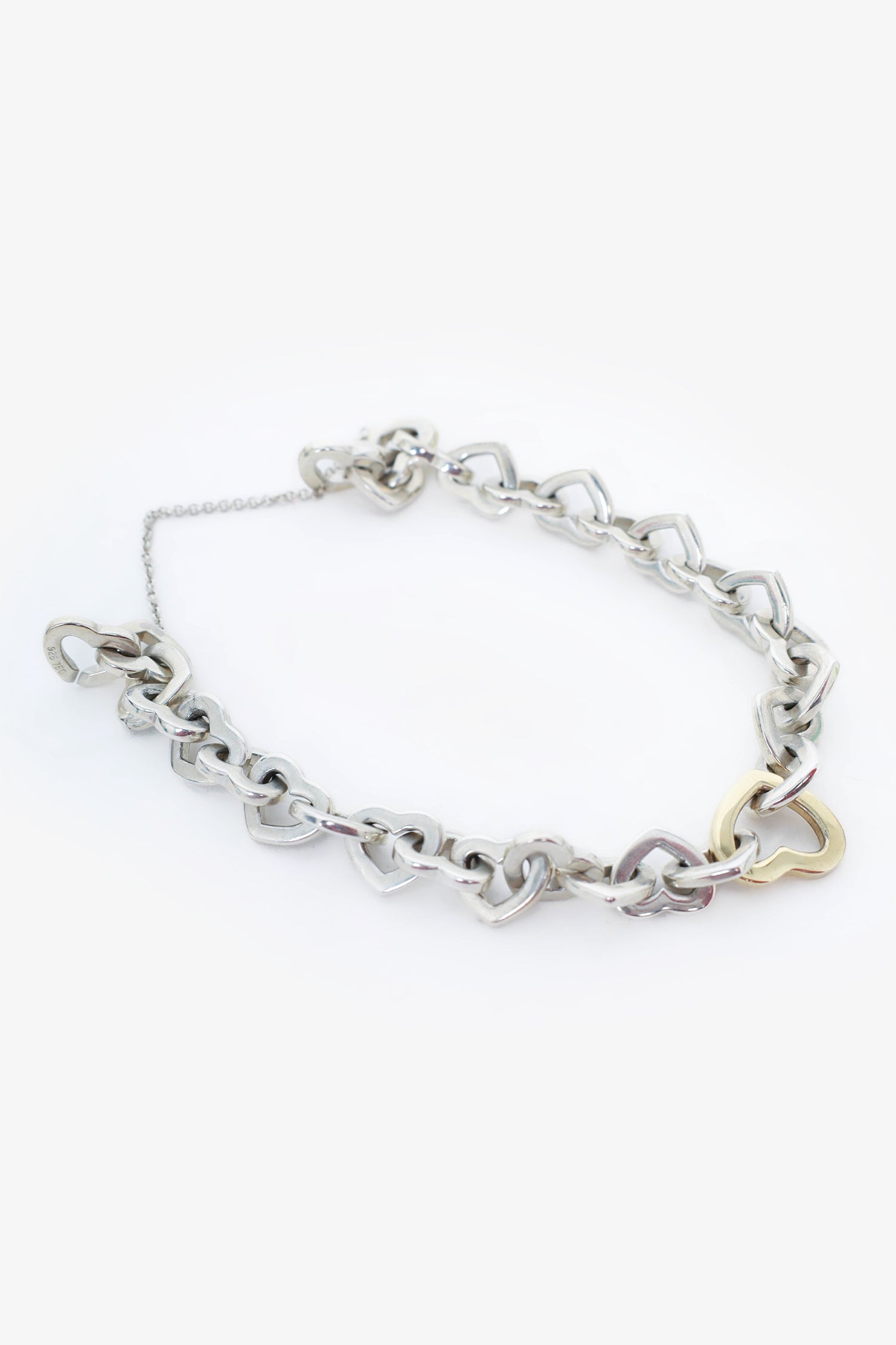 Refresh availabilityTiffany & Co. Sterling Silver/18K Gold Heart Link Bracelet. Interlocking heart closure. Safety chain. Silver and gold-tone hardware.