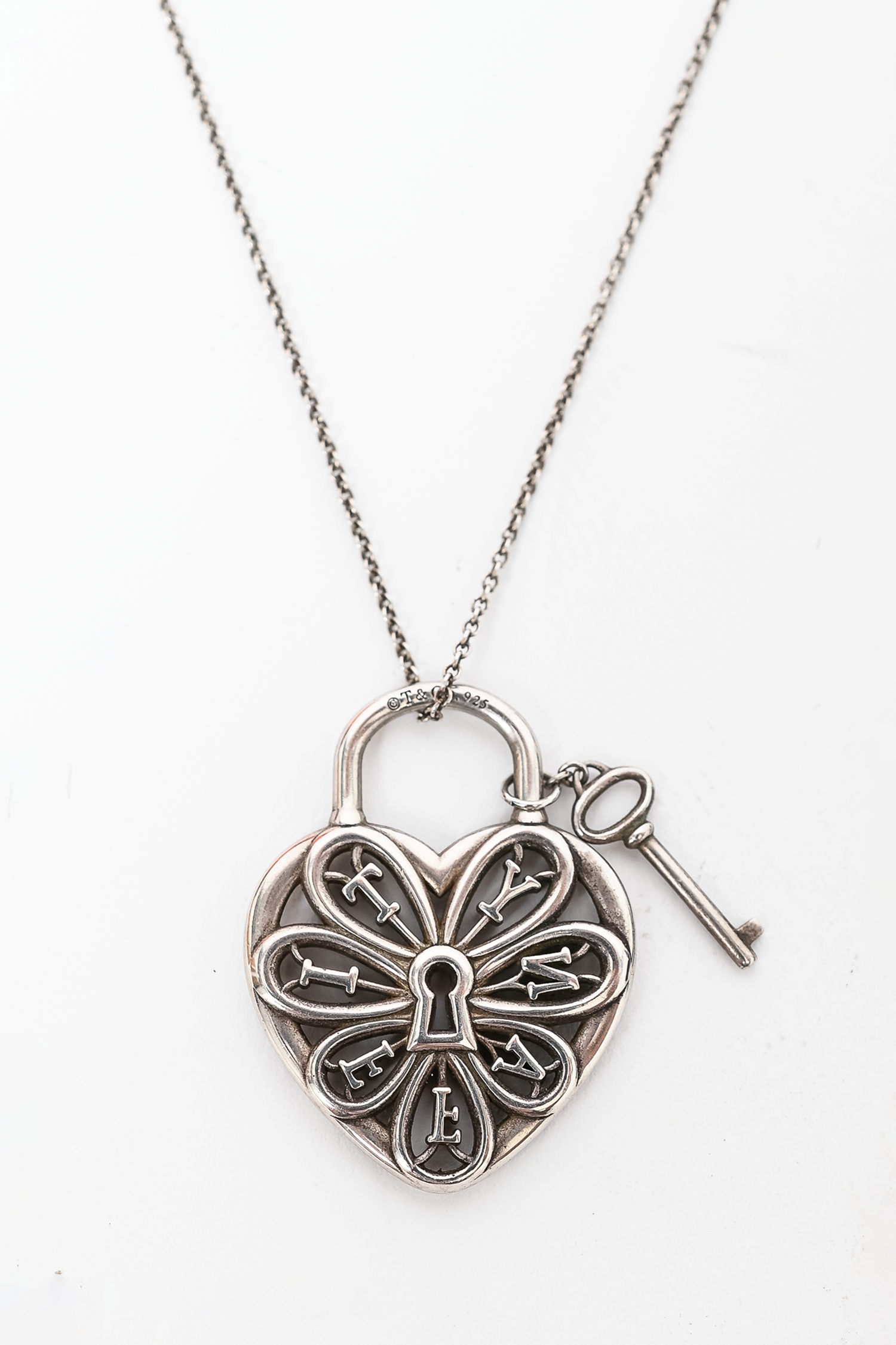 Refresh availabilityTiffany & Co. Sterling Silver Heart Lock & Key Pendant Necklace. Lobster clasp closure.