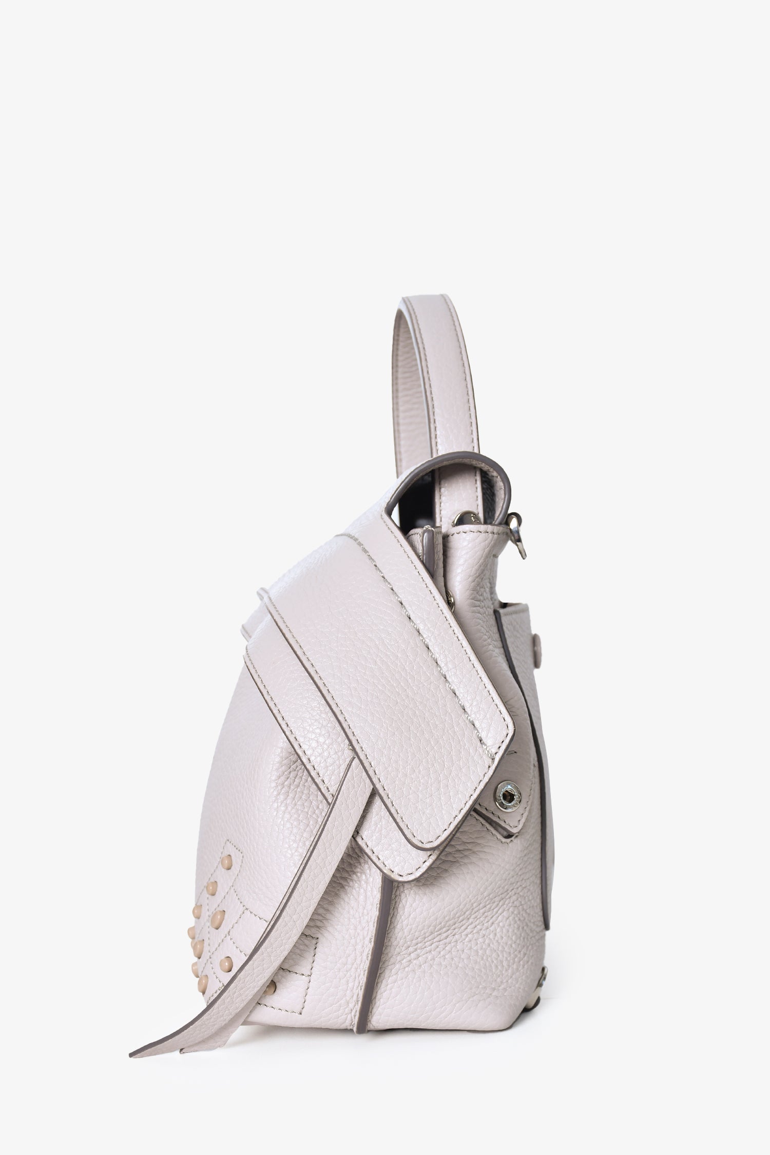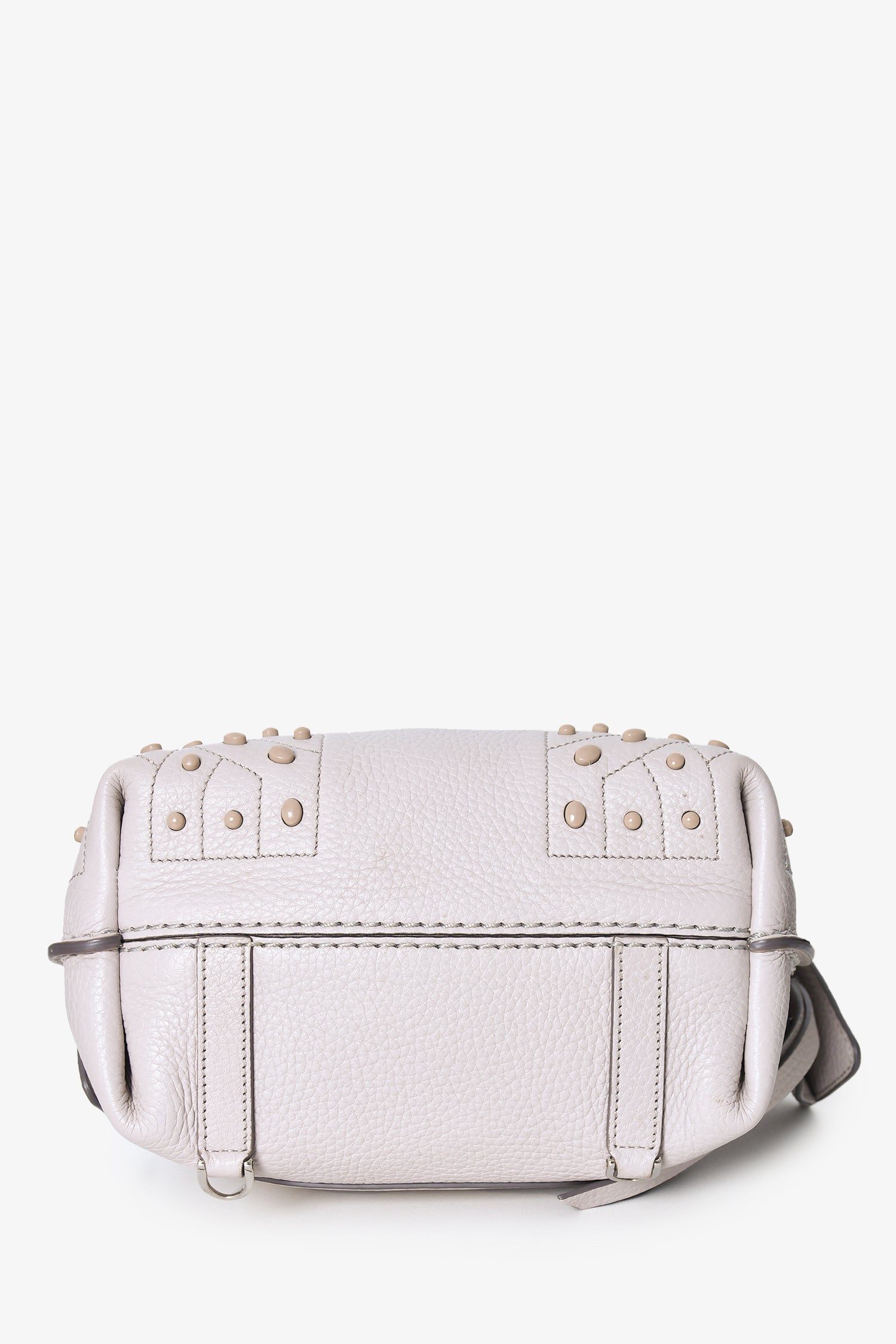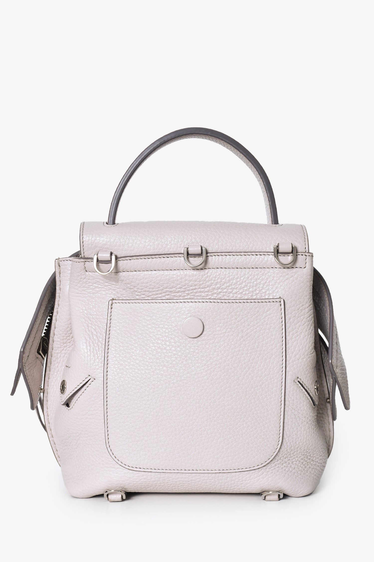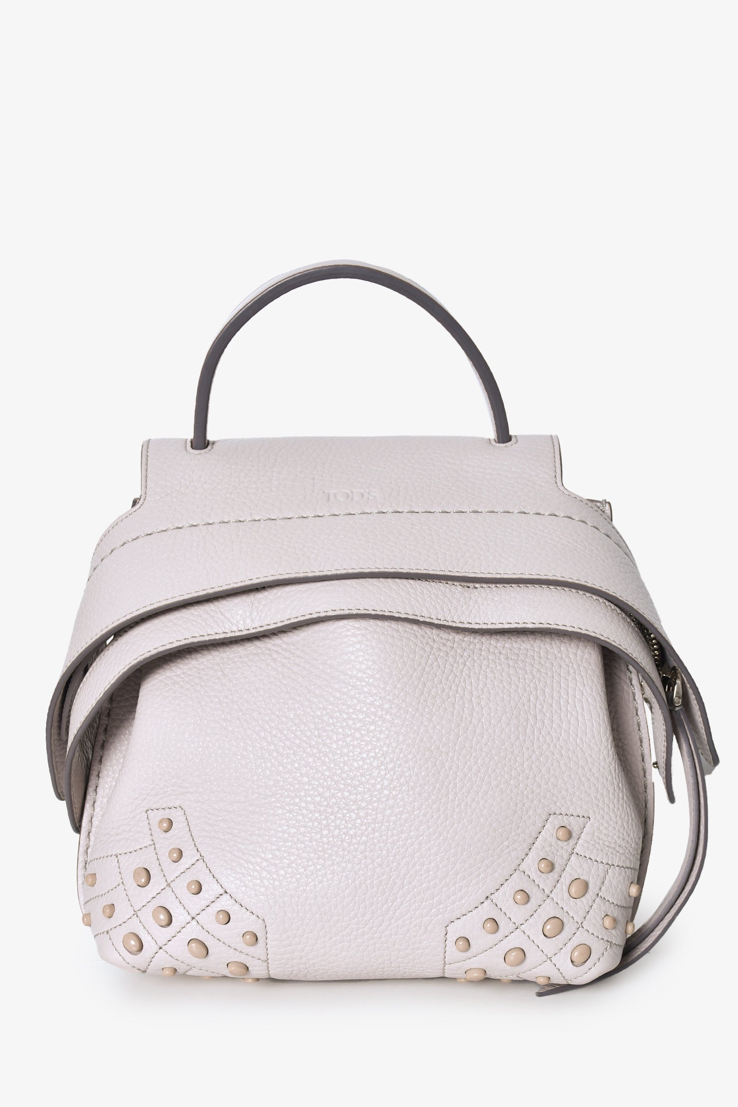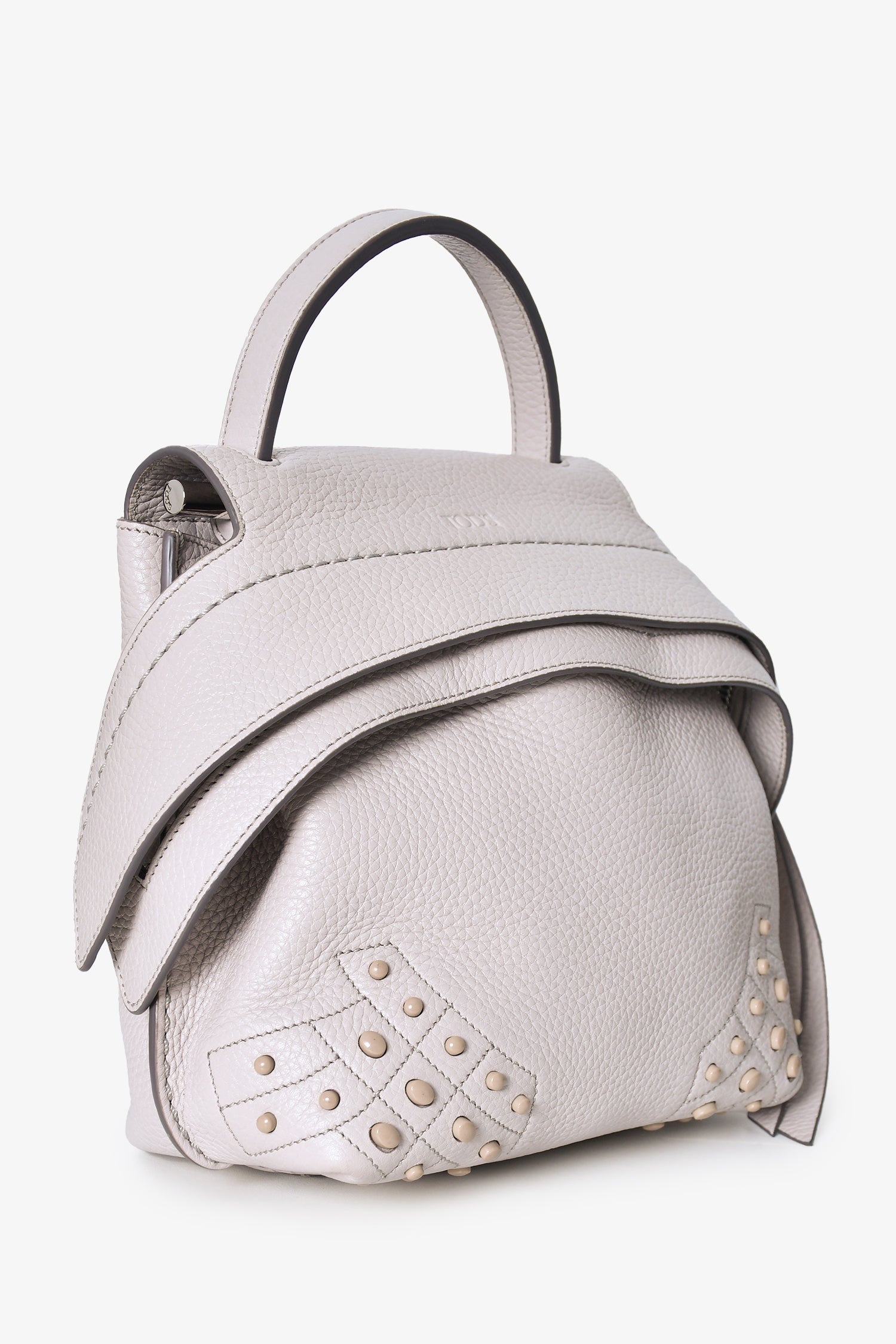 Refresh availabilityTod's Grey Leather Mini Wave Backpack. Front fold-over flap with zip closure. Pale pink suede interior. Interior wall flap with zip pocket. Removable and adjustable straps. Top handle. Outer rear slip pocket with snap-button closure. Silver-tone hardware.