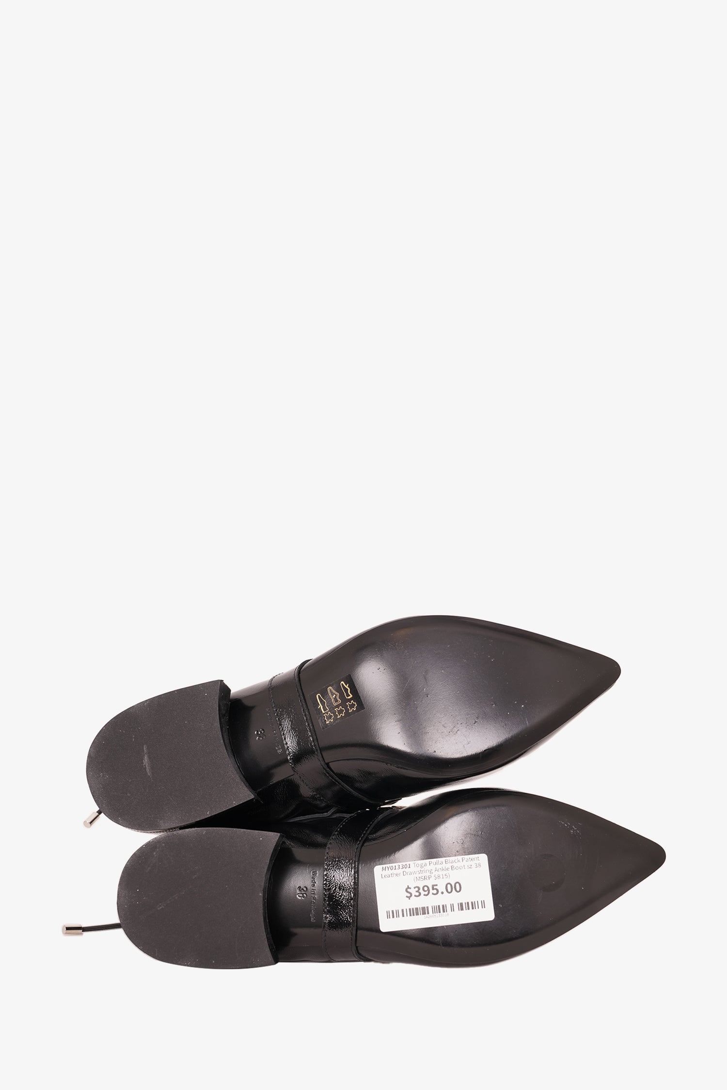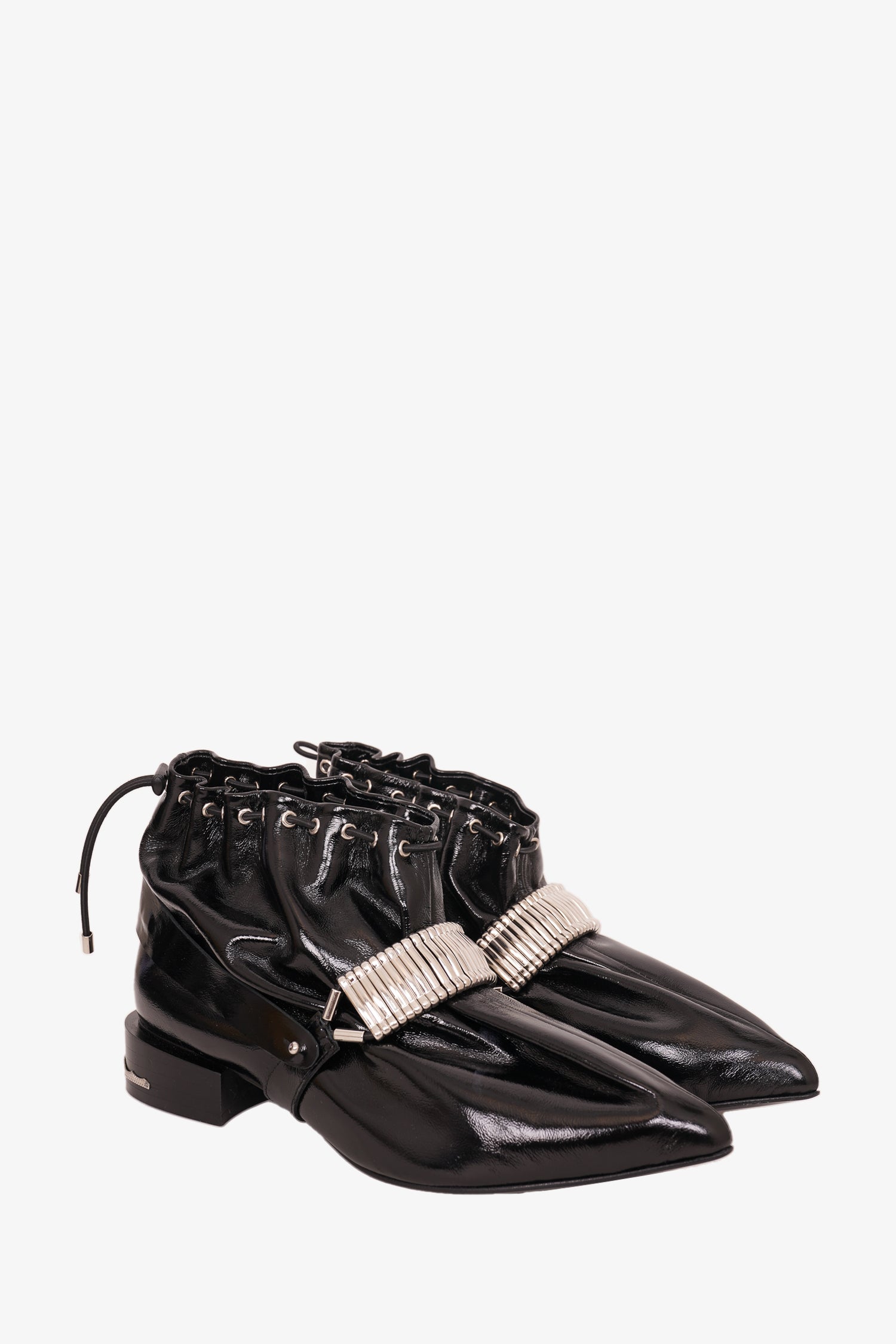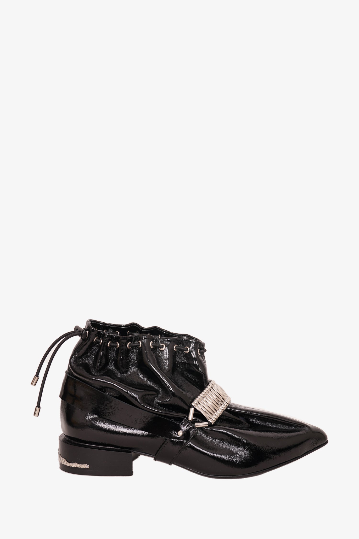Refresh availabilityToga Pulla Black Patent Leather Drawstring Ankle Boot. Pointed toe. Elasticated hem with drawstring. Silver-toned hardware. Tonal stitching.