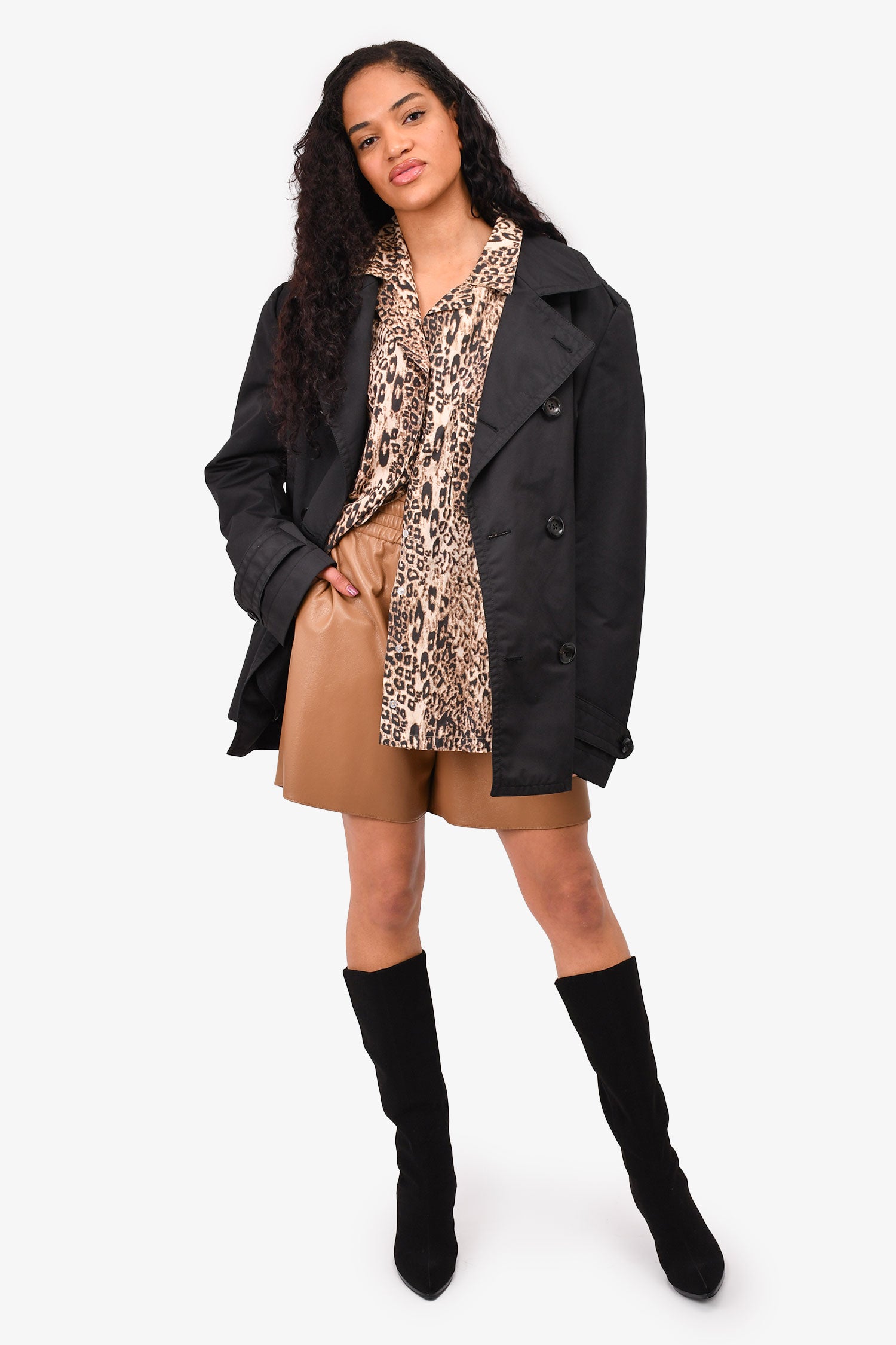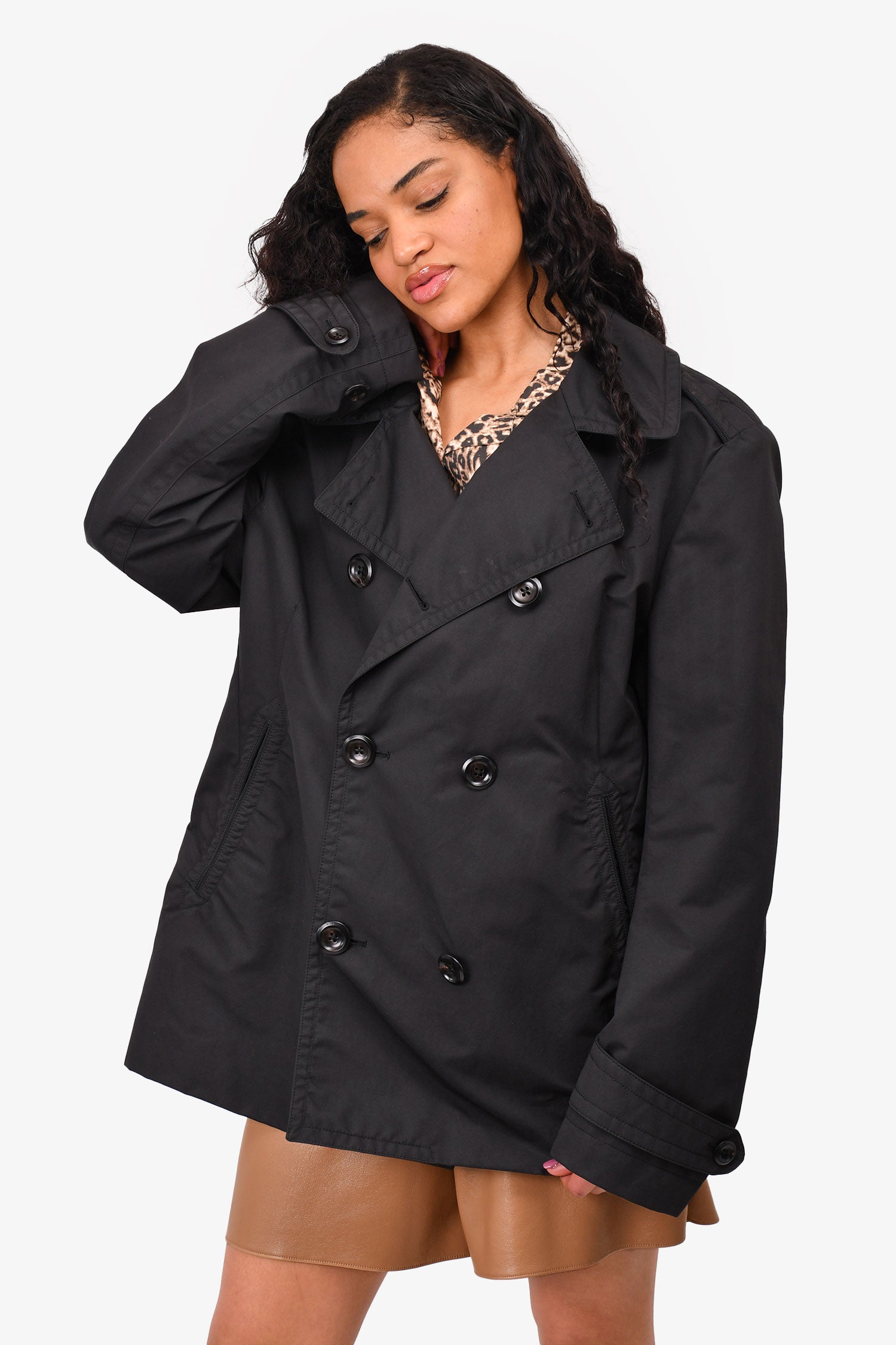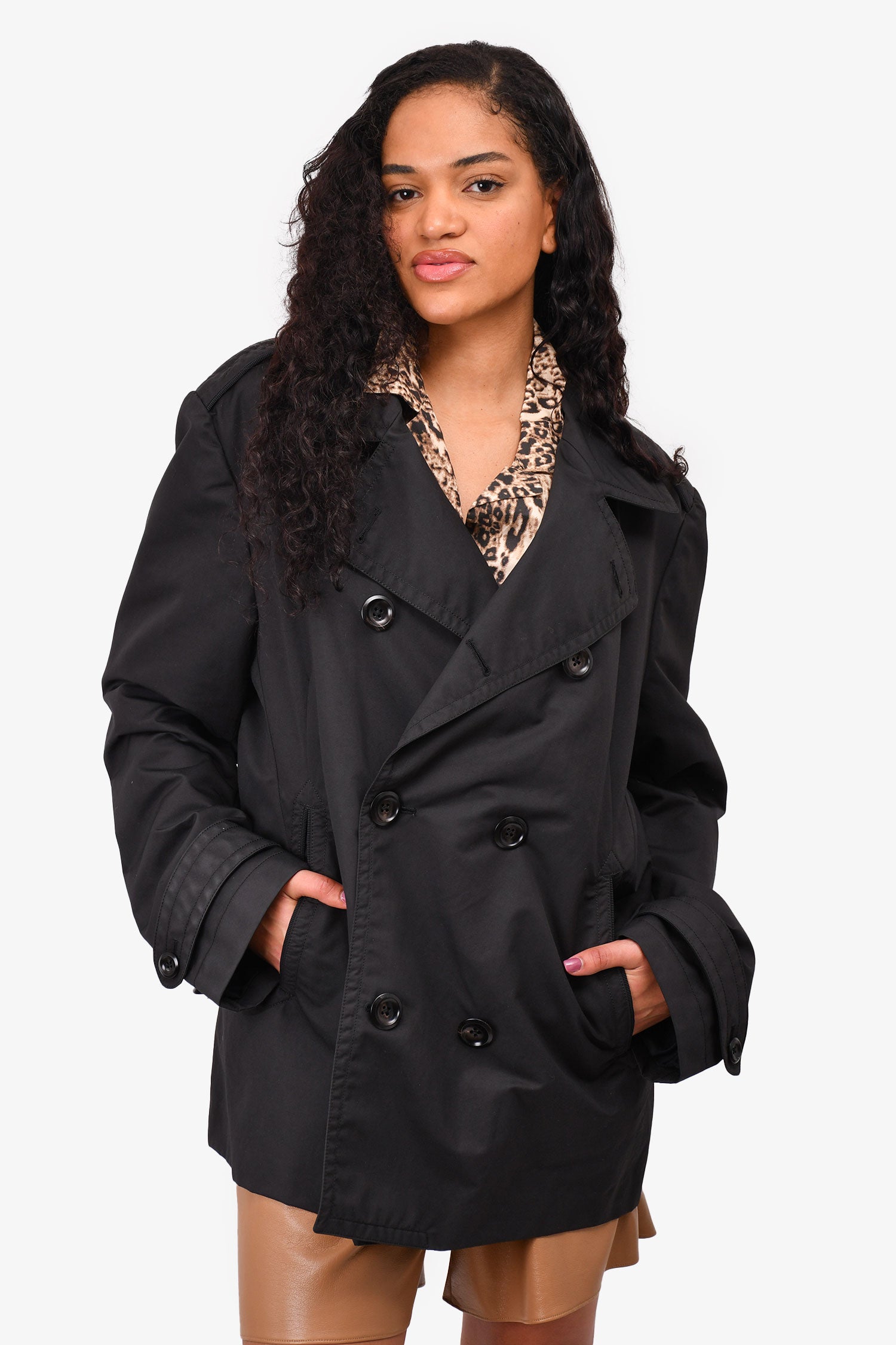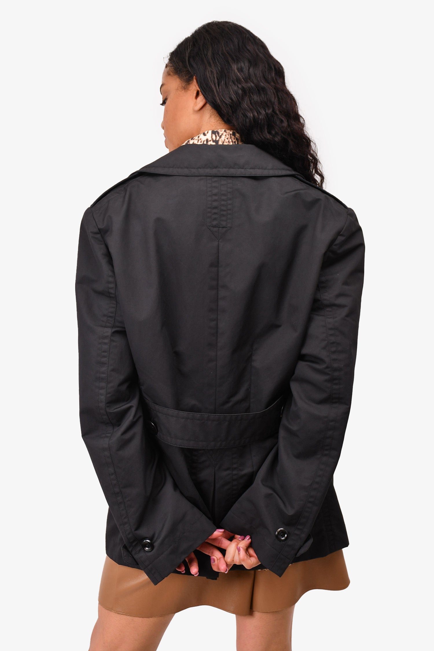 Refresh availabilityTom Ford Black Short Trench Coat. Front button-up closure. Front pockets. Lined. Button closure on the cuffs.