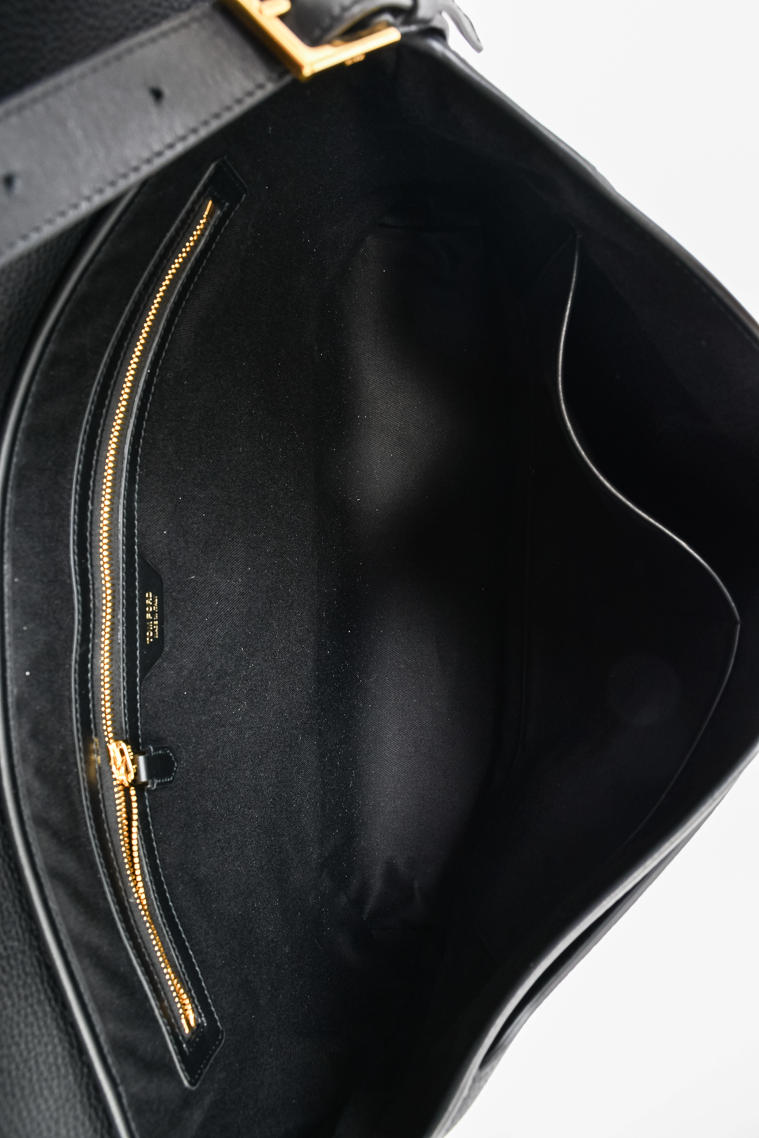 Refresh availabilityTom Ford Black Messenger Bag Men's. Front fold-over flap with magnetic closure. 1 under-flap pocket. 1 interior zip pocket. 2 interior slip pockets. Adjustable shoulder strap. Gold-toned hardware. Tonal stitching.