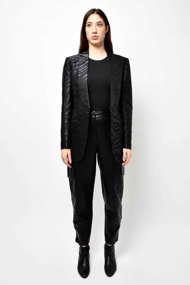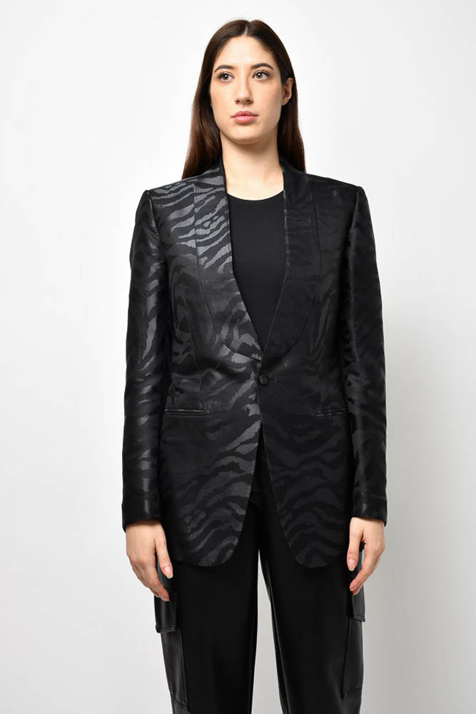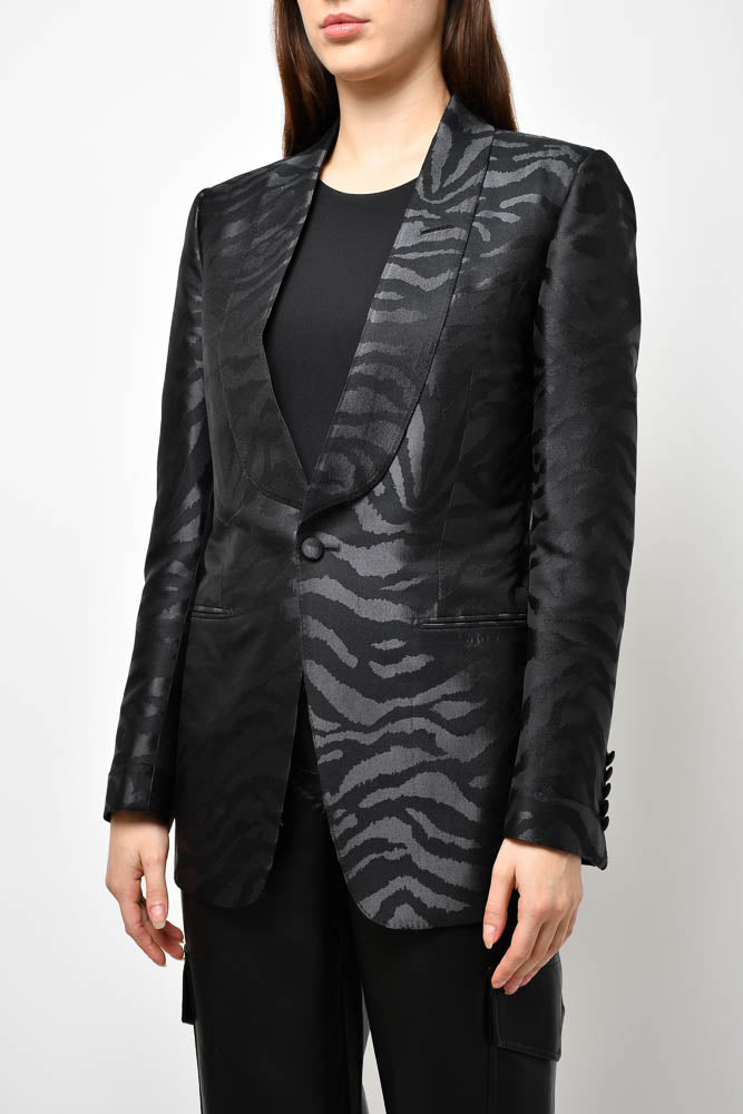 Refresh availabilityTom Ford Black Zebra Printed Silk Tuxedo Jacket. Front button closure. Padded shoulders. Lined. Tonal stitching.