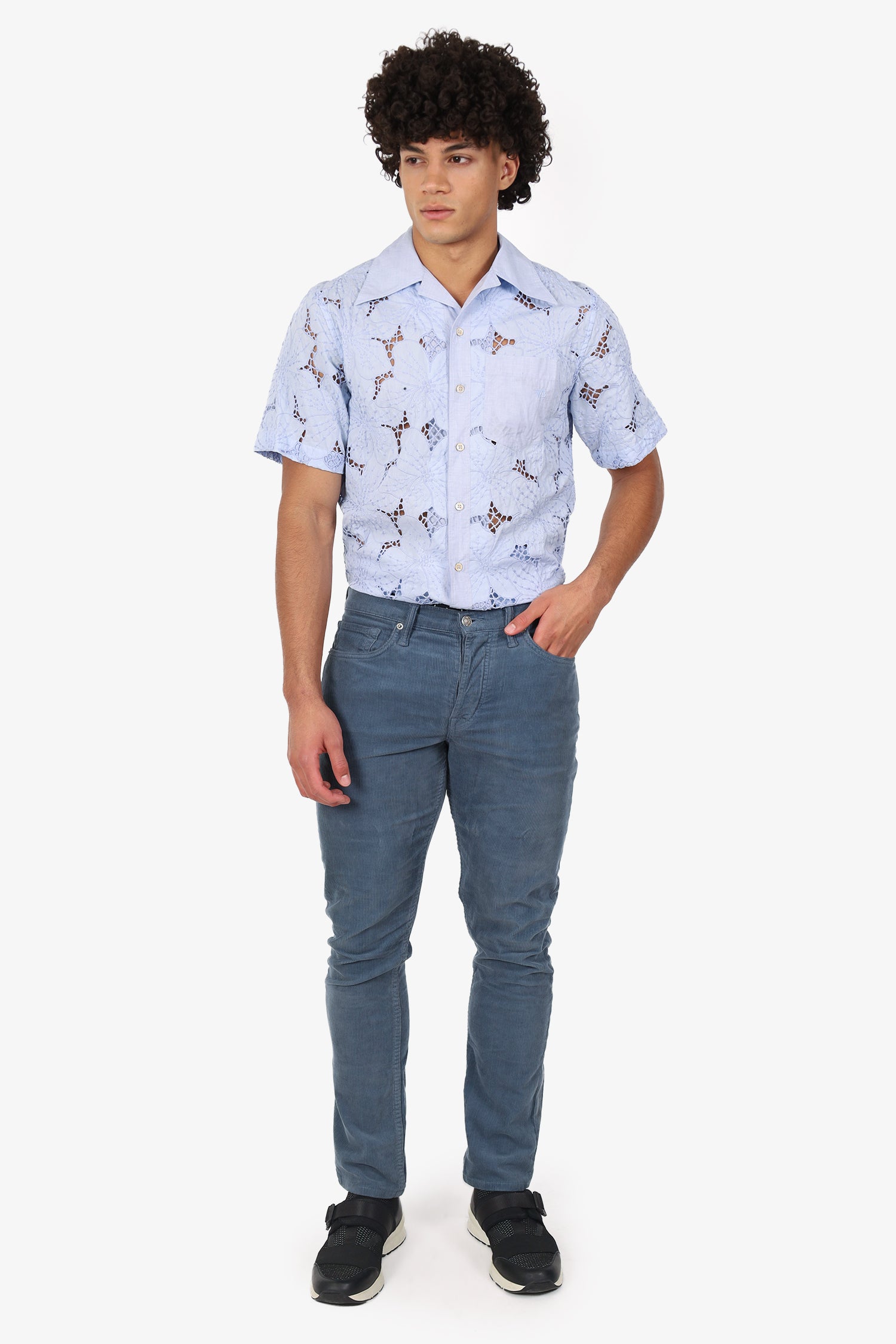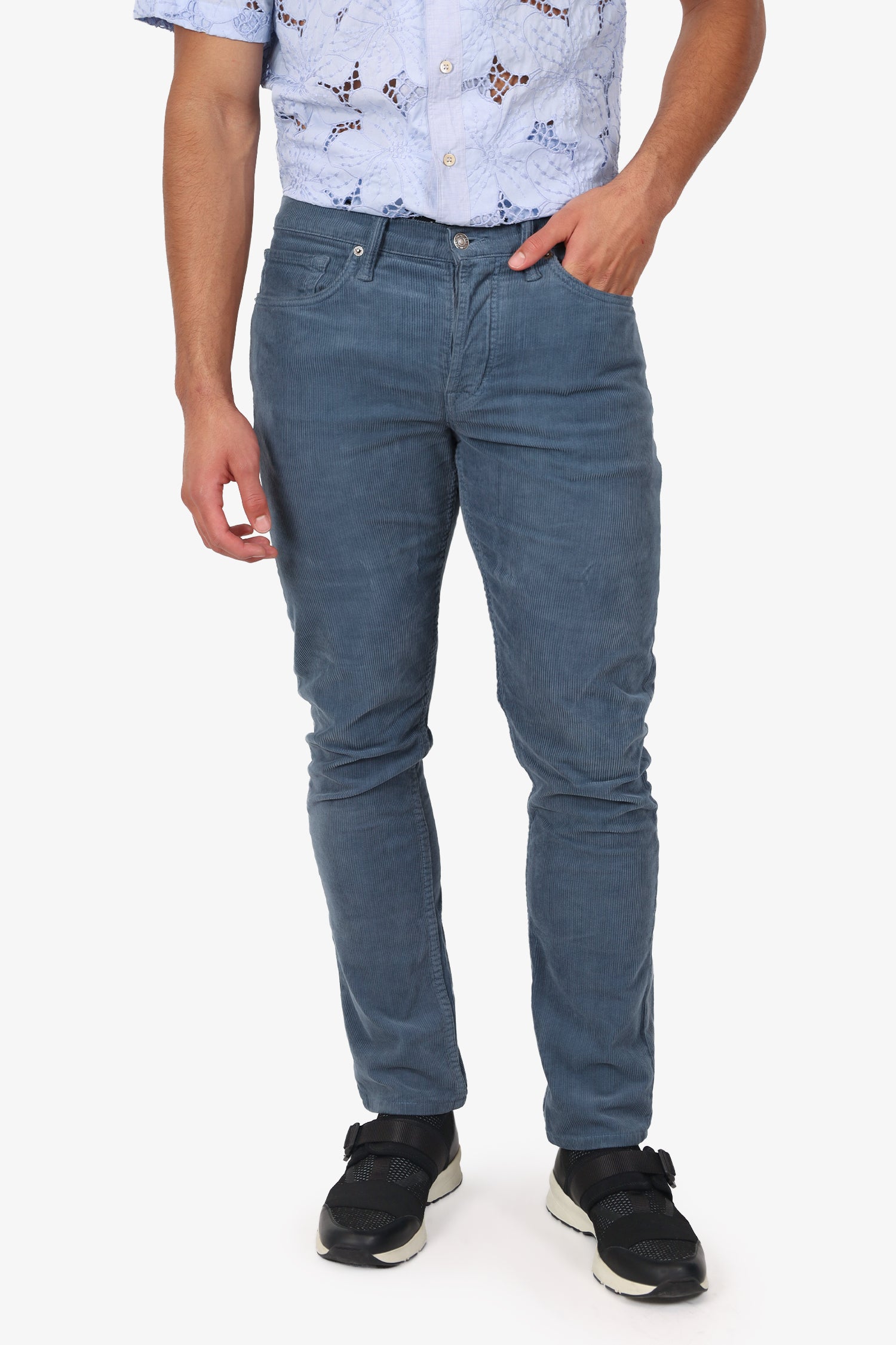 Refresh availabilityTom Ford Blue Cord Straight Leg Pants. Slip-on. Front button-up closure. Waistband belt-loops. 5 exterior pockets; 2 front slip, 1 mini compartment, and 2 rear slip. Silver-tone hardware. Tonal stitching.