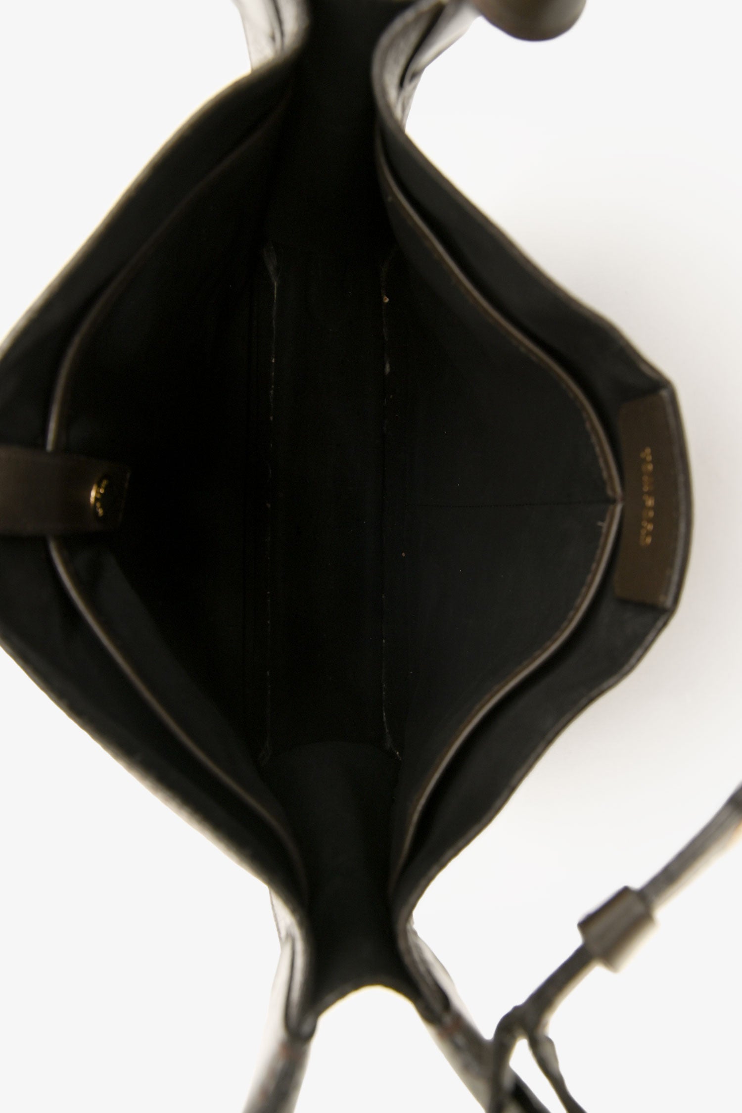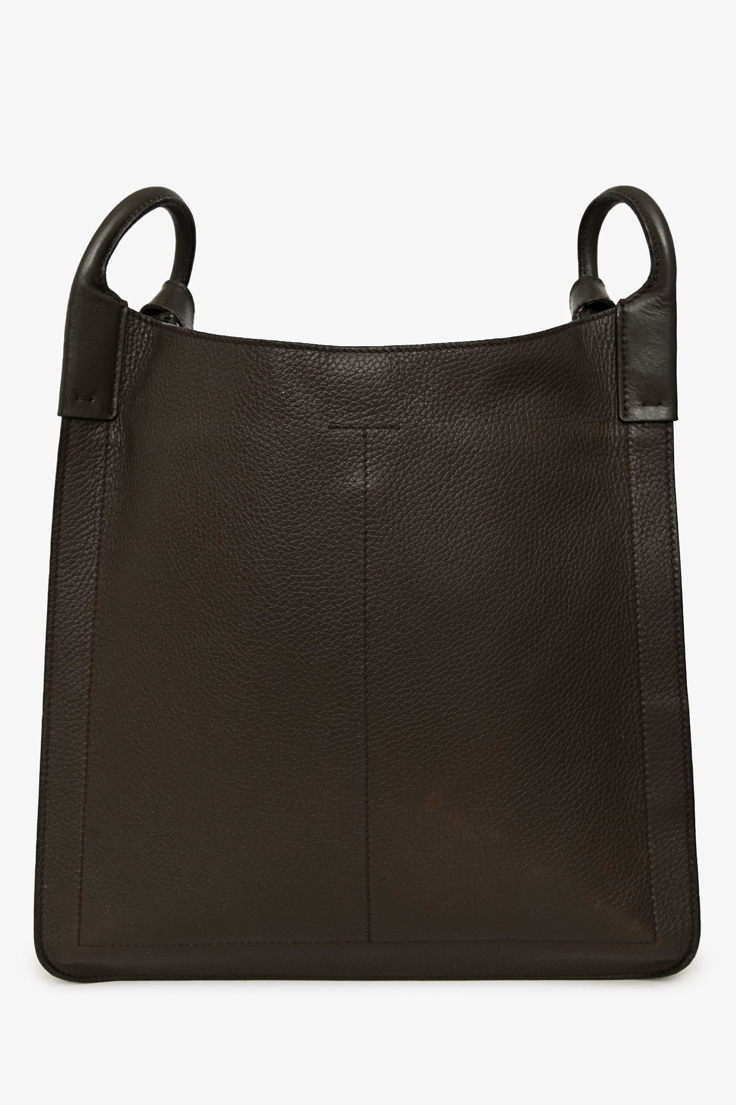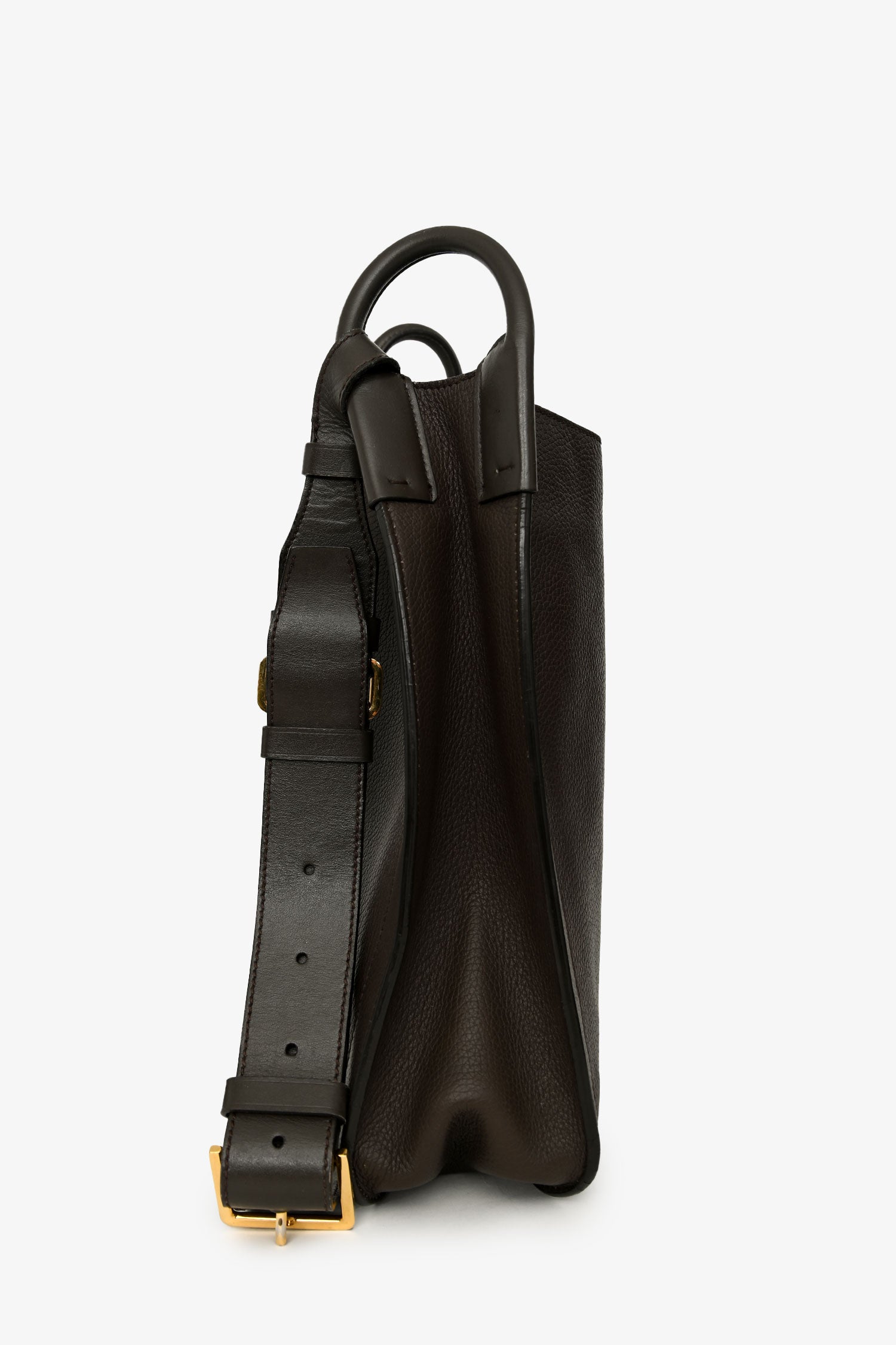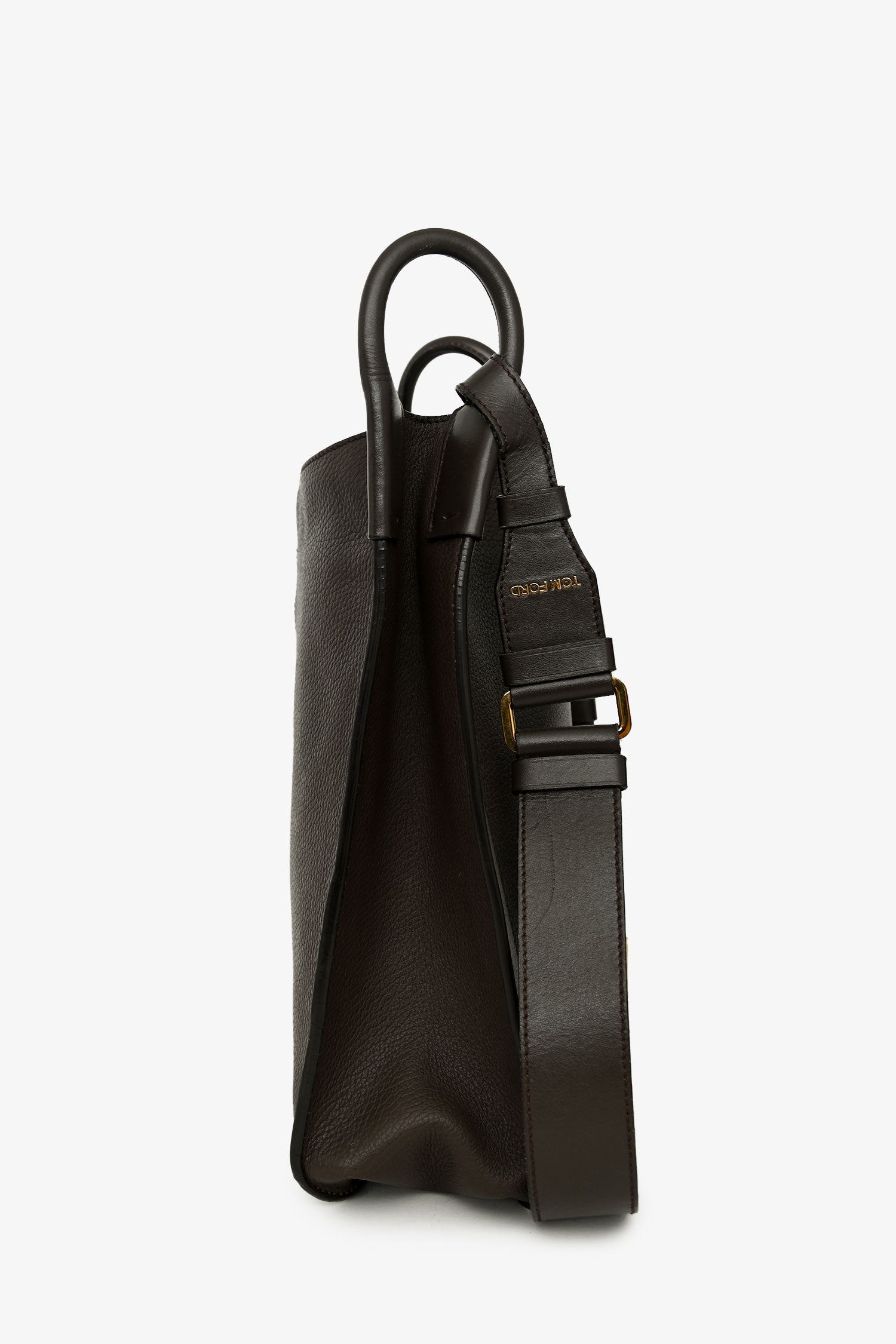 Refresh availabilityTom Ford Brown Leather Oversized Crossbody Bag. Open top. Single shoulder strap with adjustable pull-through closure. 1 interior compartment. 2 wall slip pockets. 1 pocket with snap closure. Suede-lined interior. Gold-tone hardware. Tonal stitching.