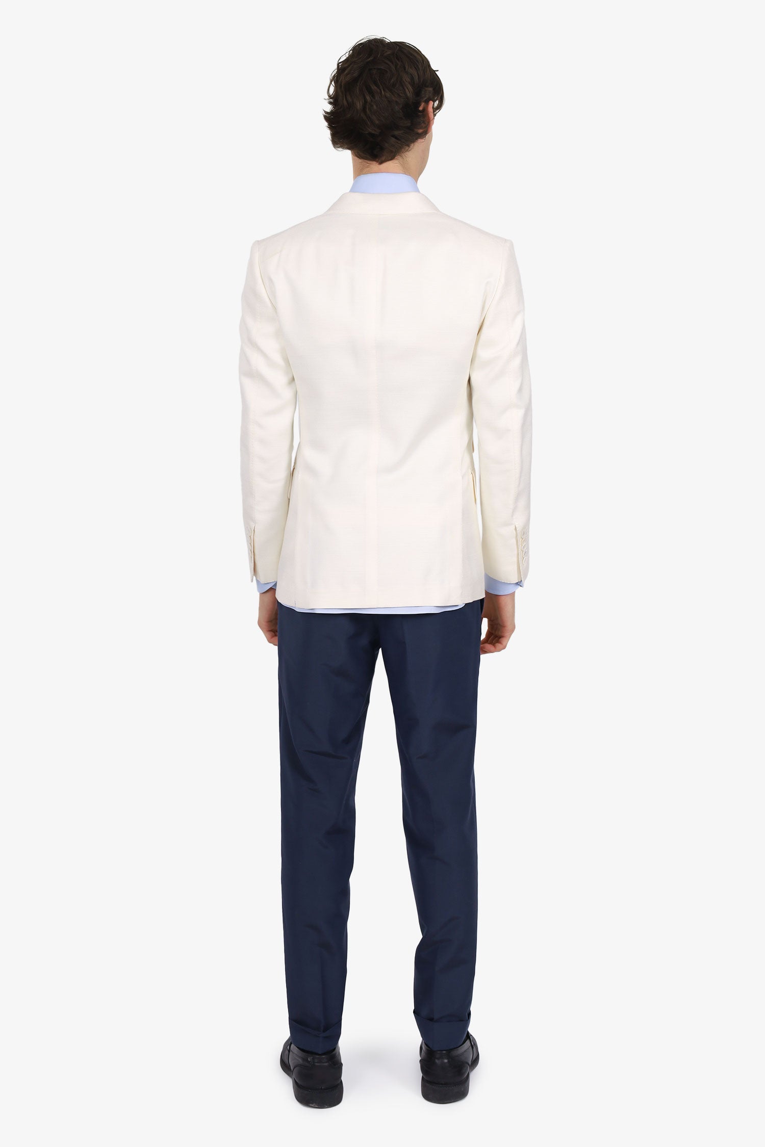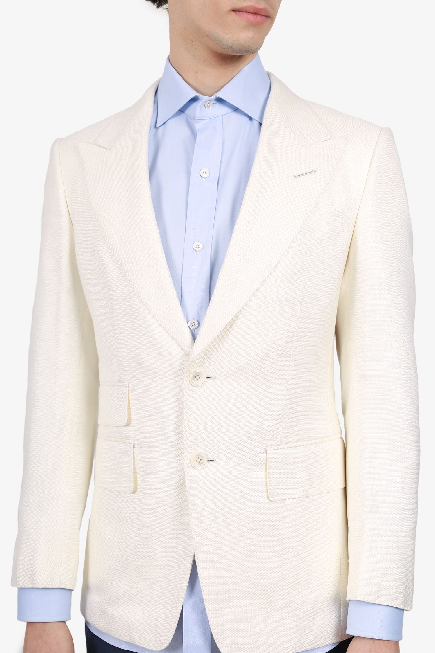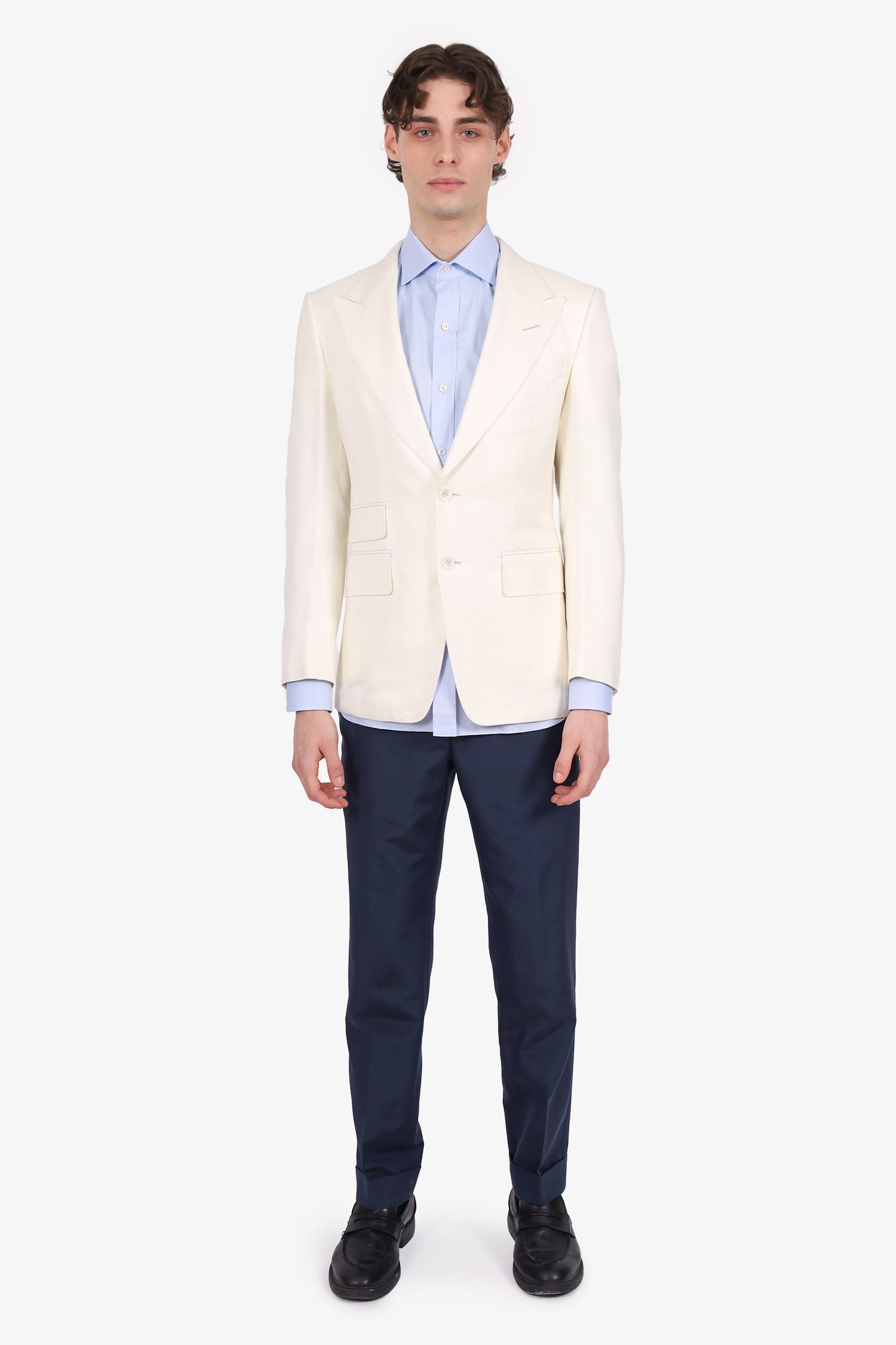 Refresh availabilityTom Ford White/Navy Two-piece Suit Set. Blazer; Peak lapel. Front button-up closure. Padding to shoulders. Sleeve cuffs with button-up closure. 4 exterior pockets; 1 chest slip, and 3 front-fold-over-flap. Double rear vent. Lined interior with 3 slip pockets. Tonal stitching. Pants; Front zip with hook and button-up closure. Adjustable pull-through buckle closure to waistband. 4 exterior pockets; 2 side slip, and 2 rear button-up. Gunmetal-tone hardware. Tonal stitching.