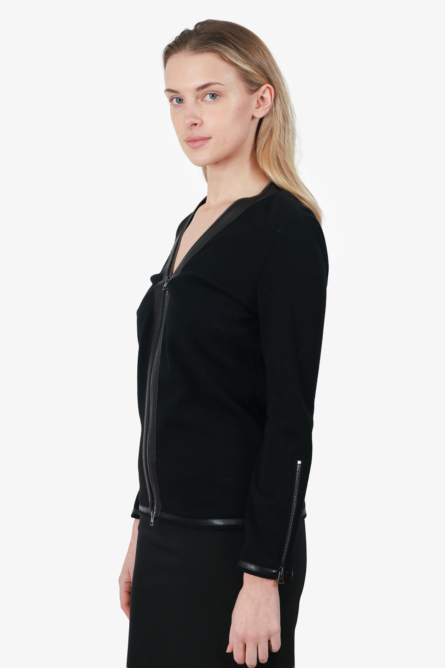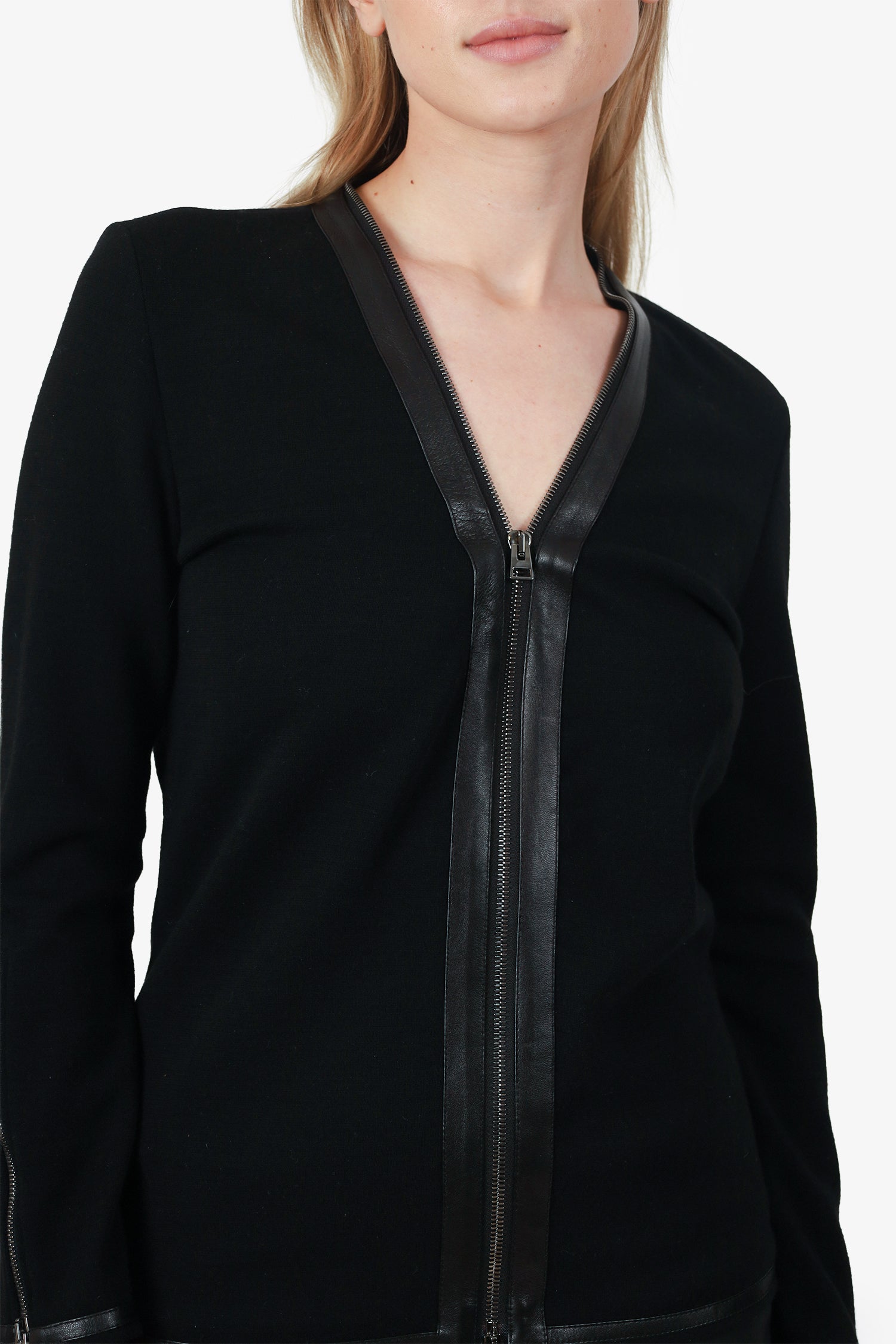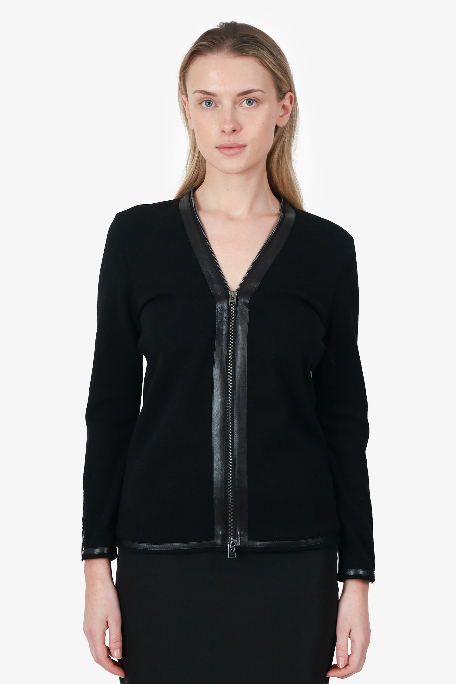 Refresh availabilityTom Ford Wool/Leather Double Zip Jacket. V-neckline. 2-way front zip closure. Sleeve cuffs with zip-up closure. Gunmetal-tone hardware. Tonal stitching.