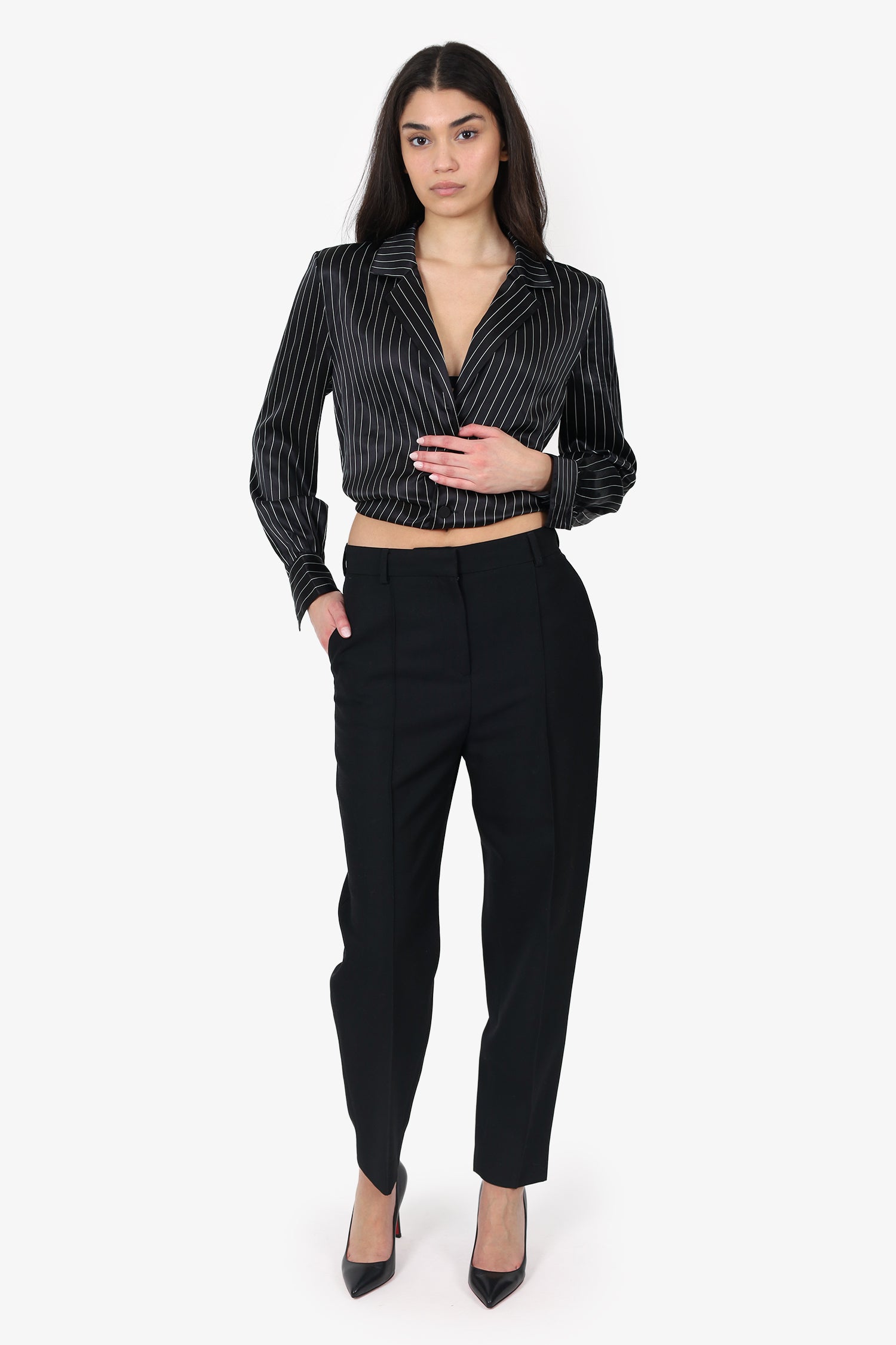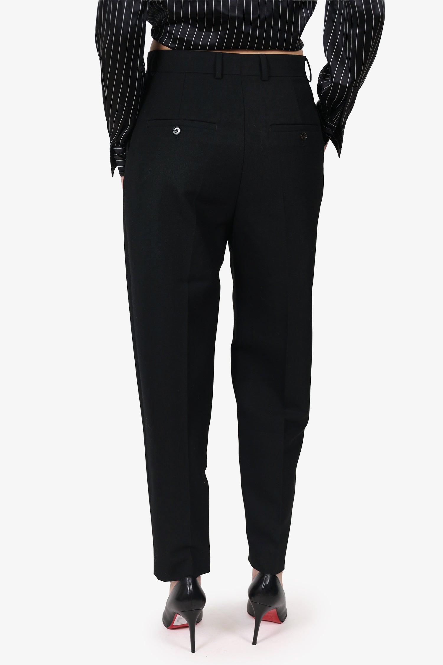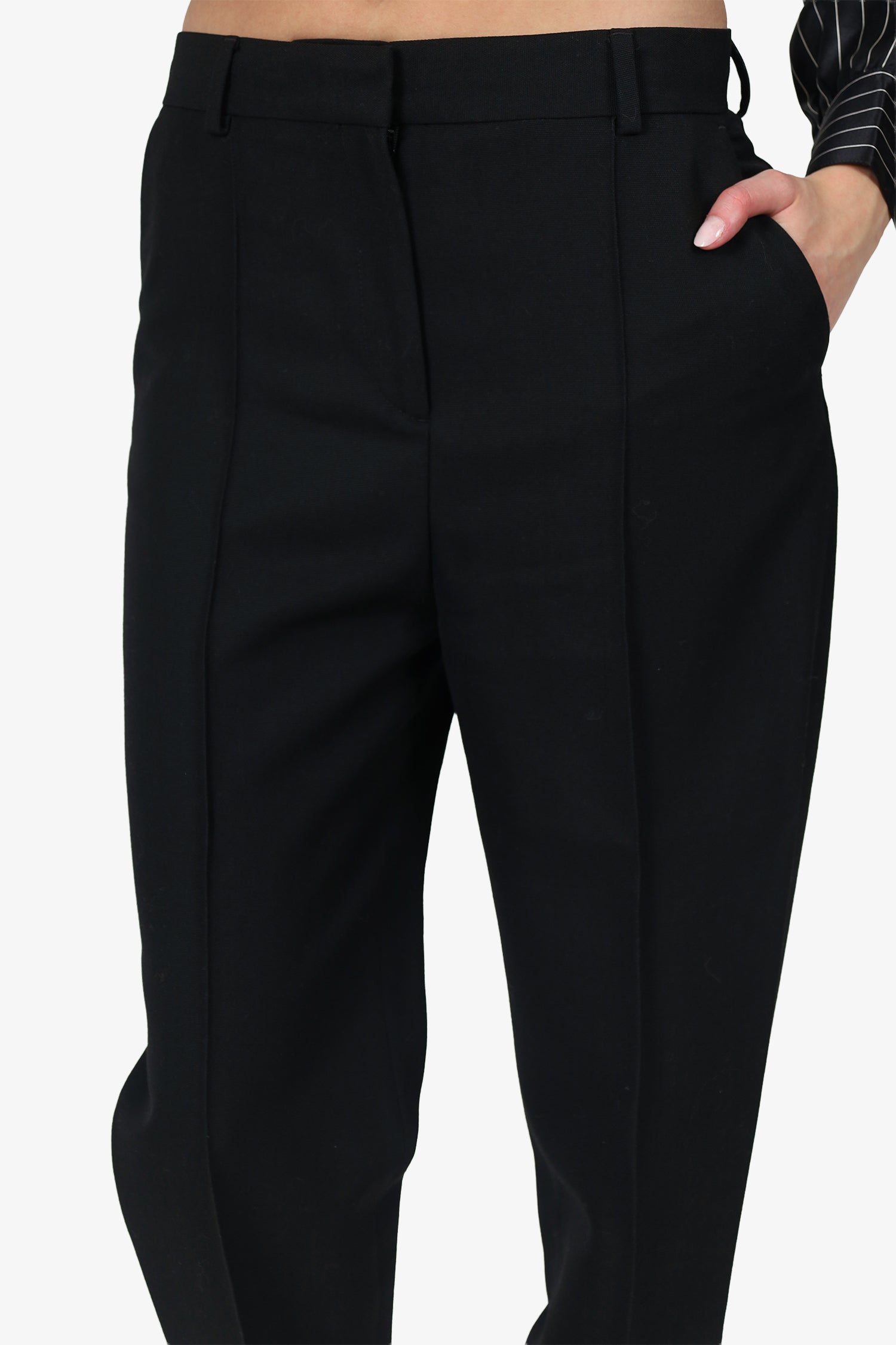 Refresh availabilityToteme Black High Waisted Pants. Slip-on. Front zip with hook-up closure. Waistband belt-loops. 4 exterior pockets; 2 front slip, and 2 rear button-up. Silver-tone hardware. Tonal stitching.
