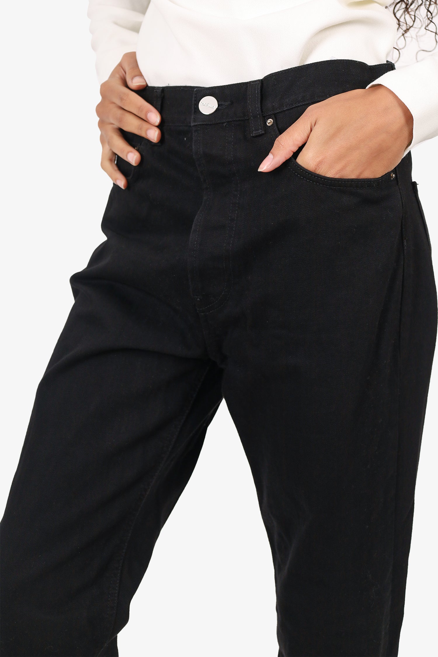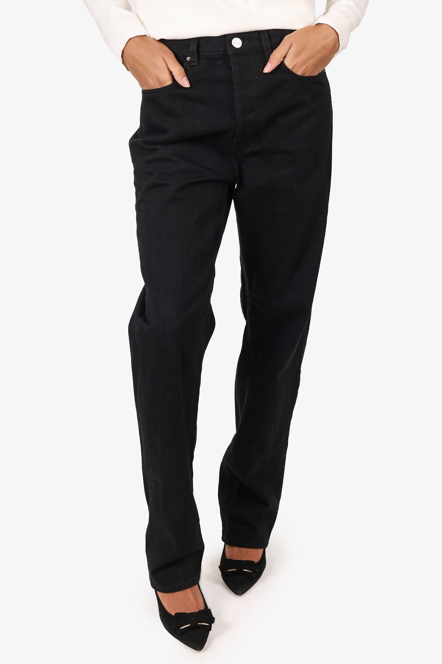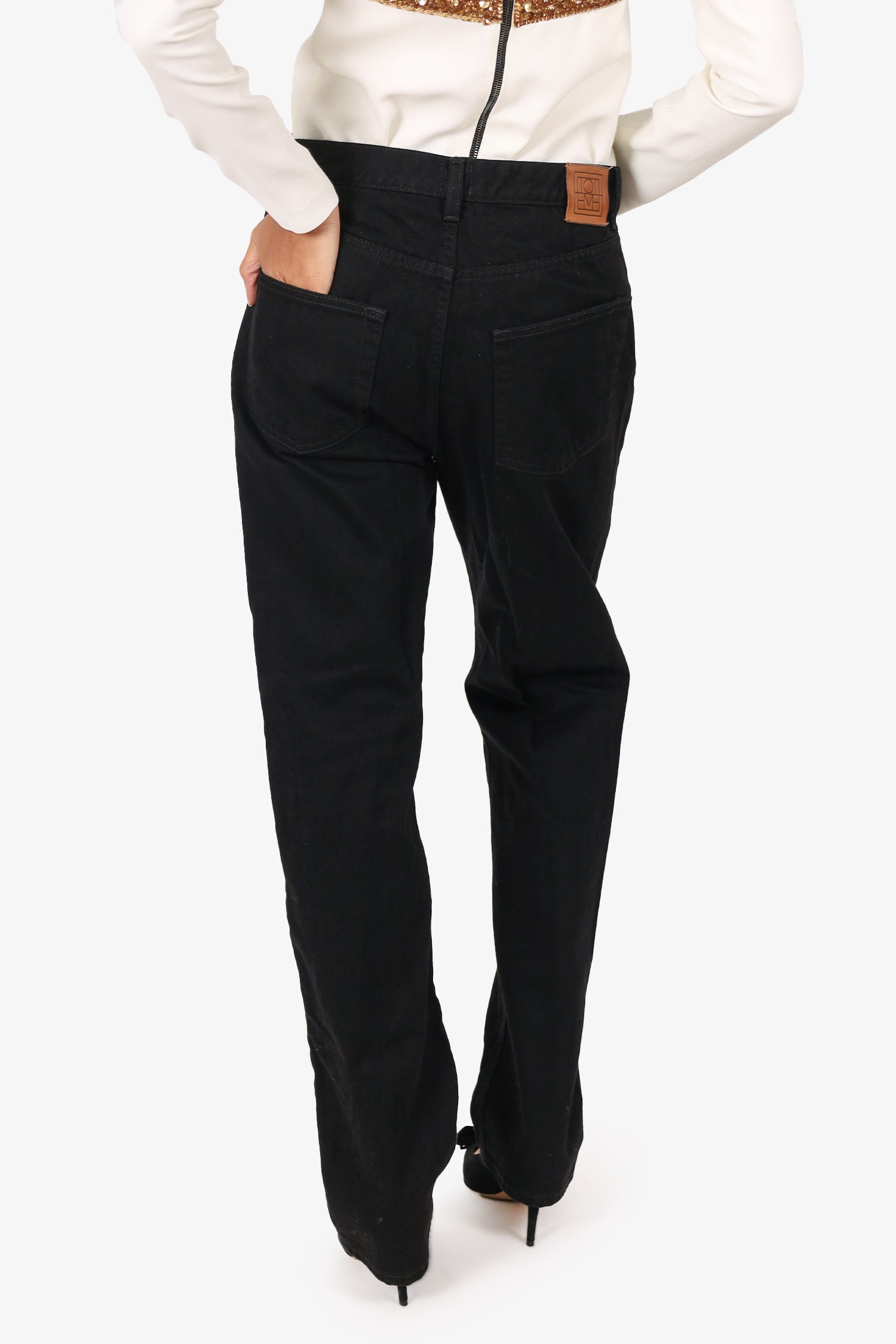 Refresh availabilityToteme Black Straight Leg Jeans. Front button-up closure. Waistband belt loops. 5 exterior pockets; 2 front side slip and 1 mini compartment, 2 rear slip. Contrast stitching.