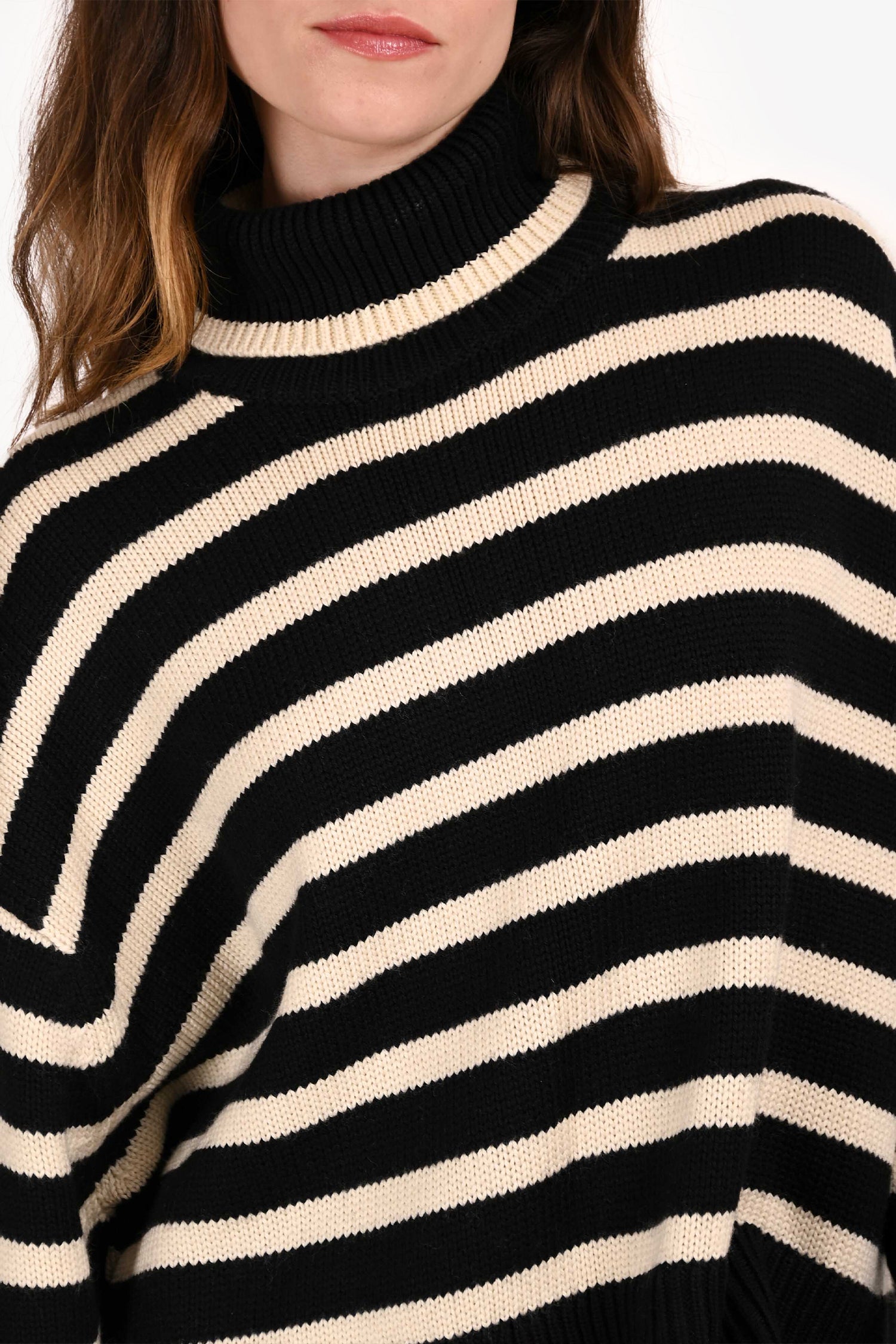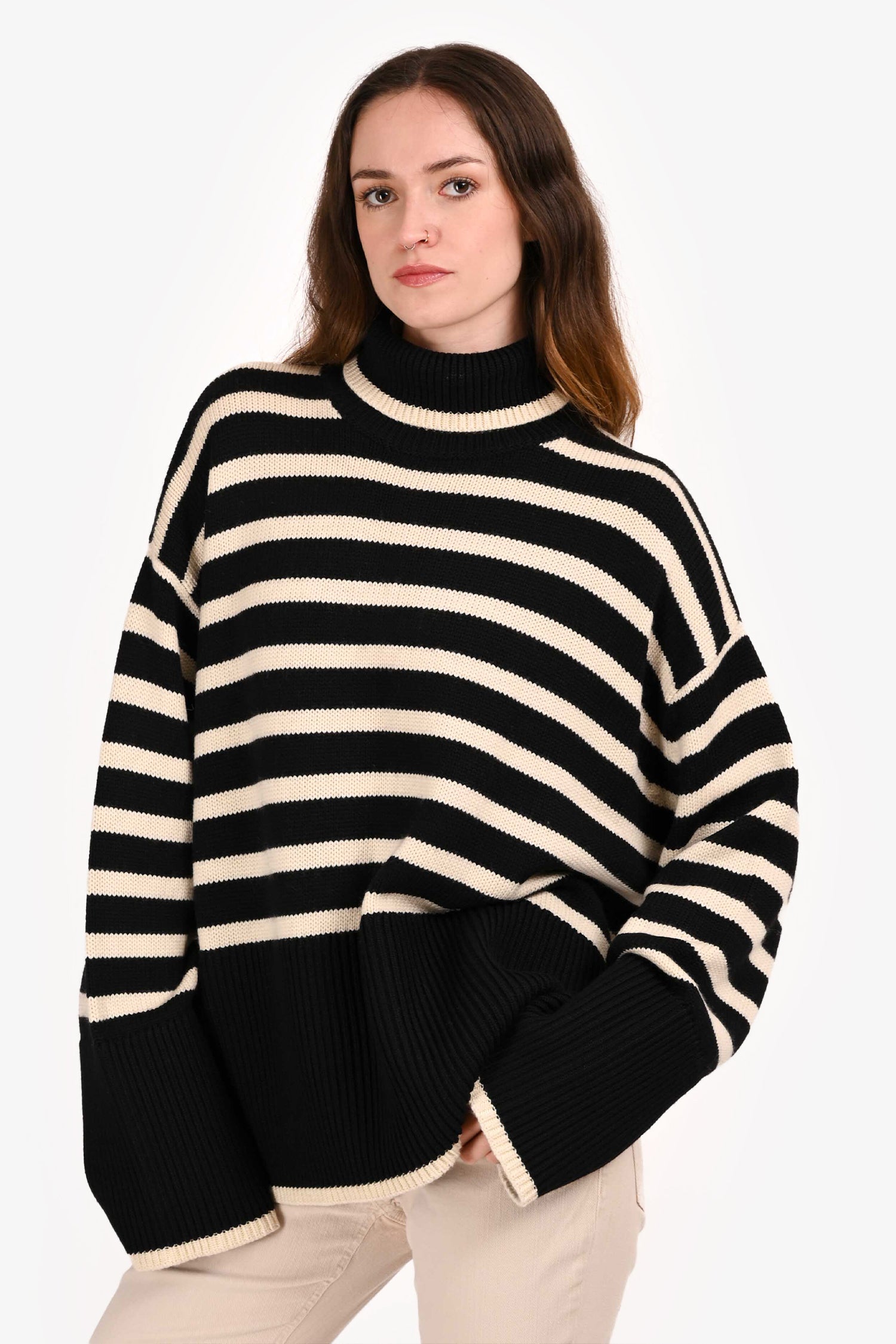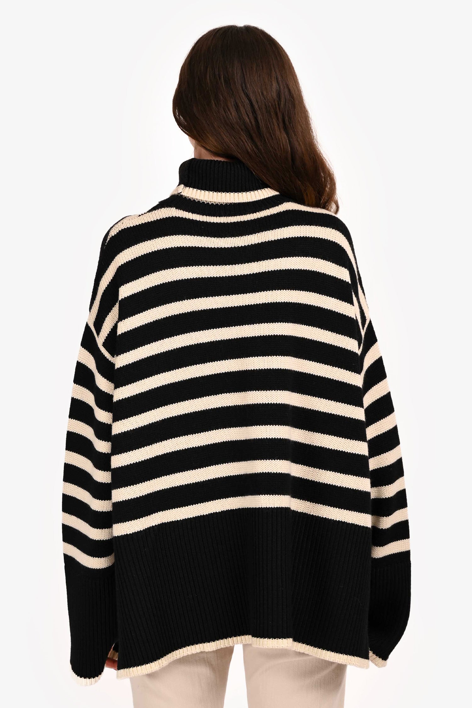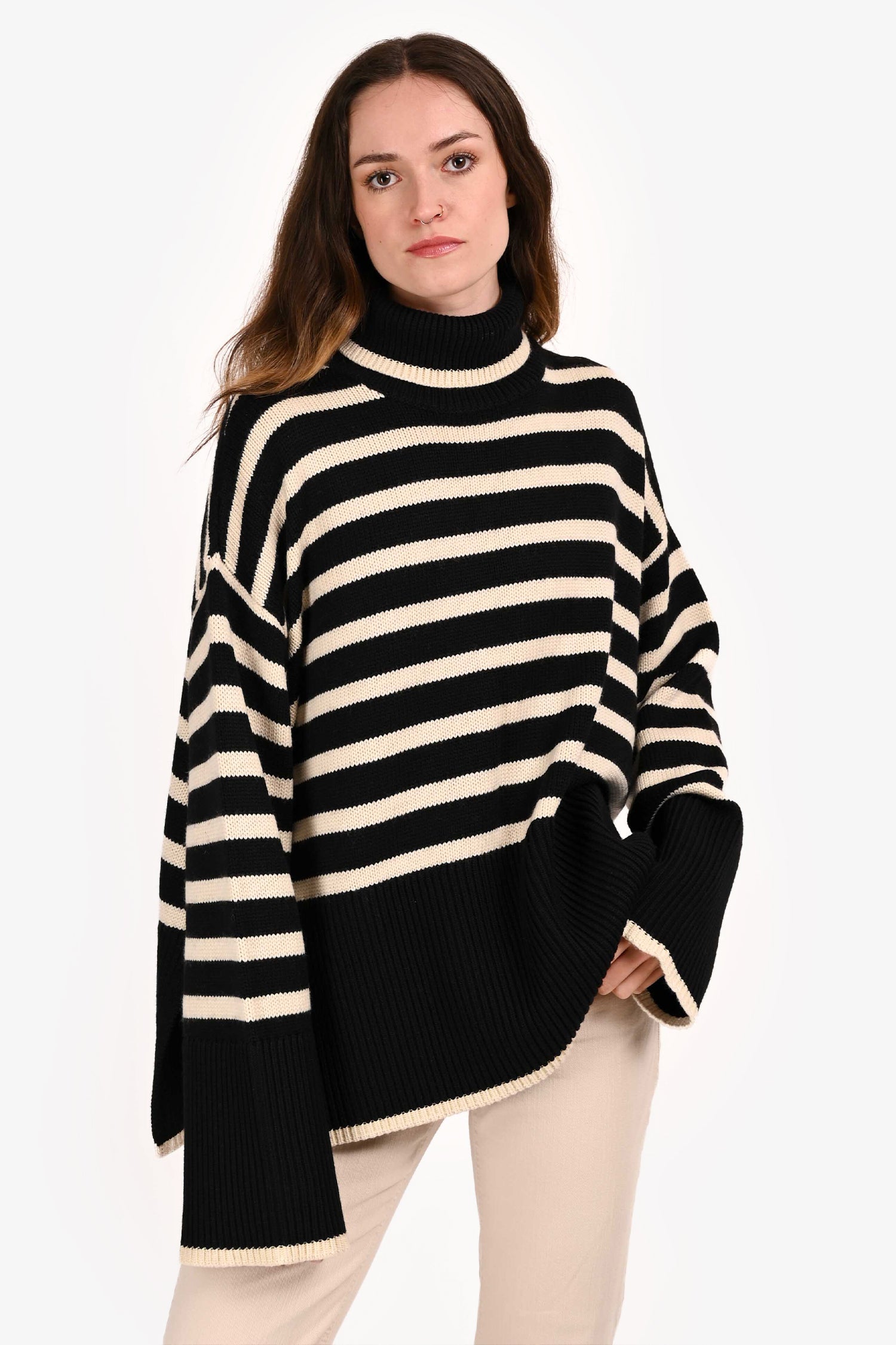 Refresh availabilityToteme Black/White Wool Striped Turtleneck Sweater. Pull-on. Fold-over turtleneck. Ribbed cuffs and hem. Side slit detail. Tonal stitching.