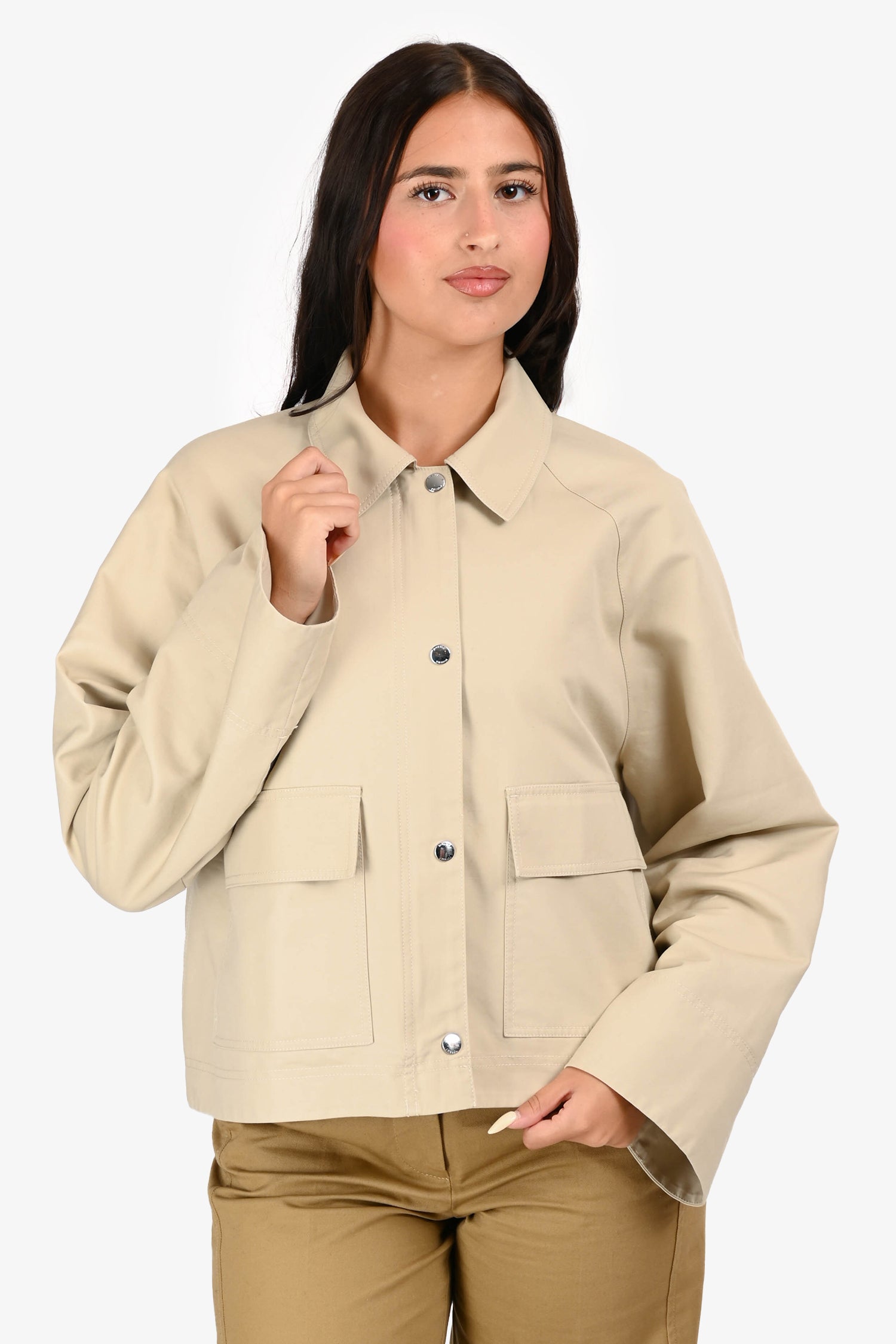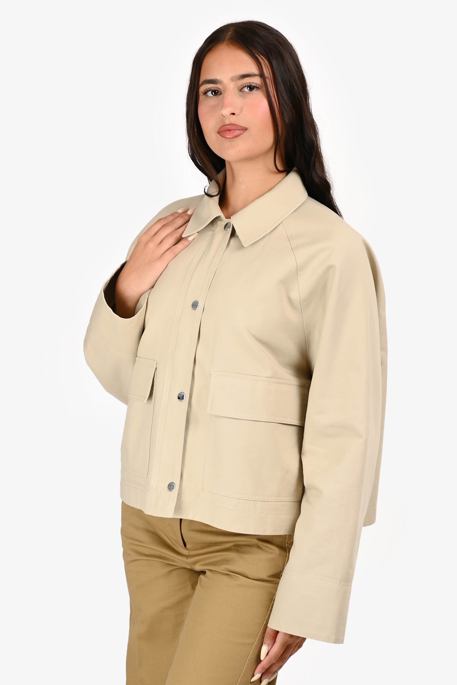 Refresh availabilityToteme Brown Cotton Cropped Zip Up Jacket. Pull-on. Collared-neckline. Front snap-button closure. Two front exterior flap pockets. Lined interior. Silver-tone hardware. Tonal stitching.