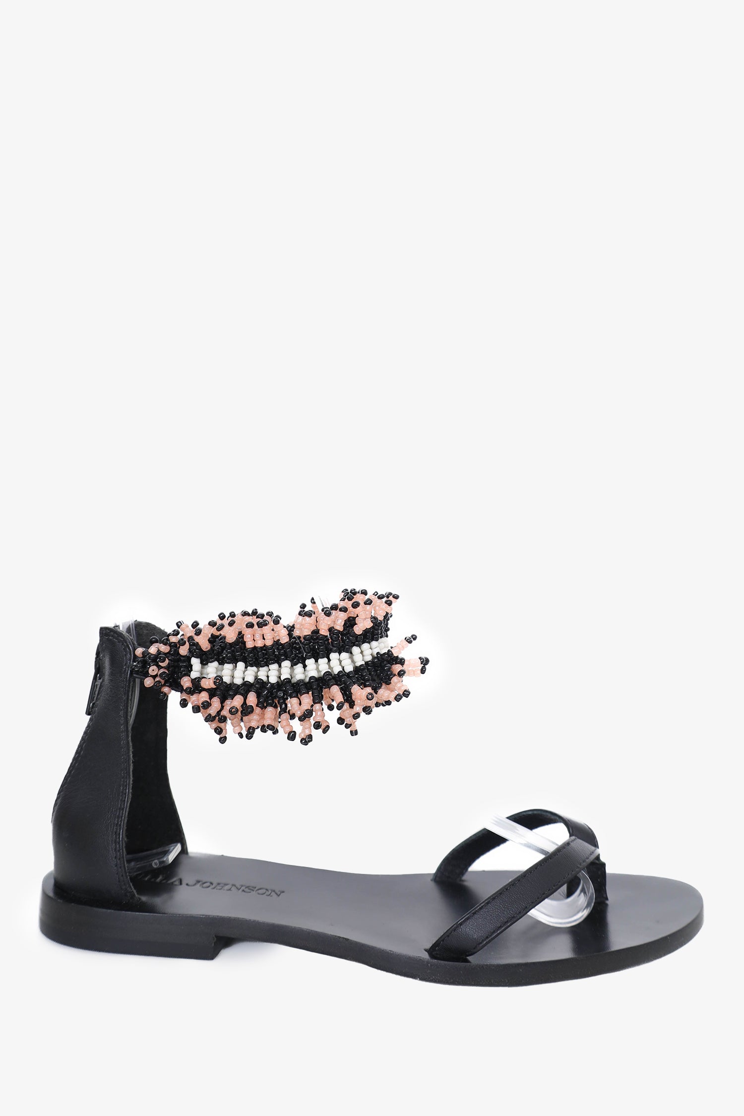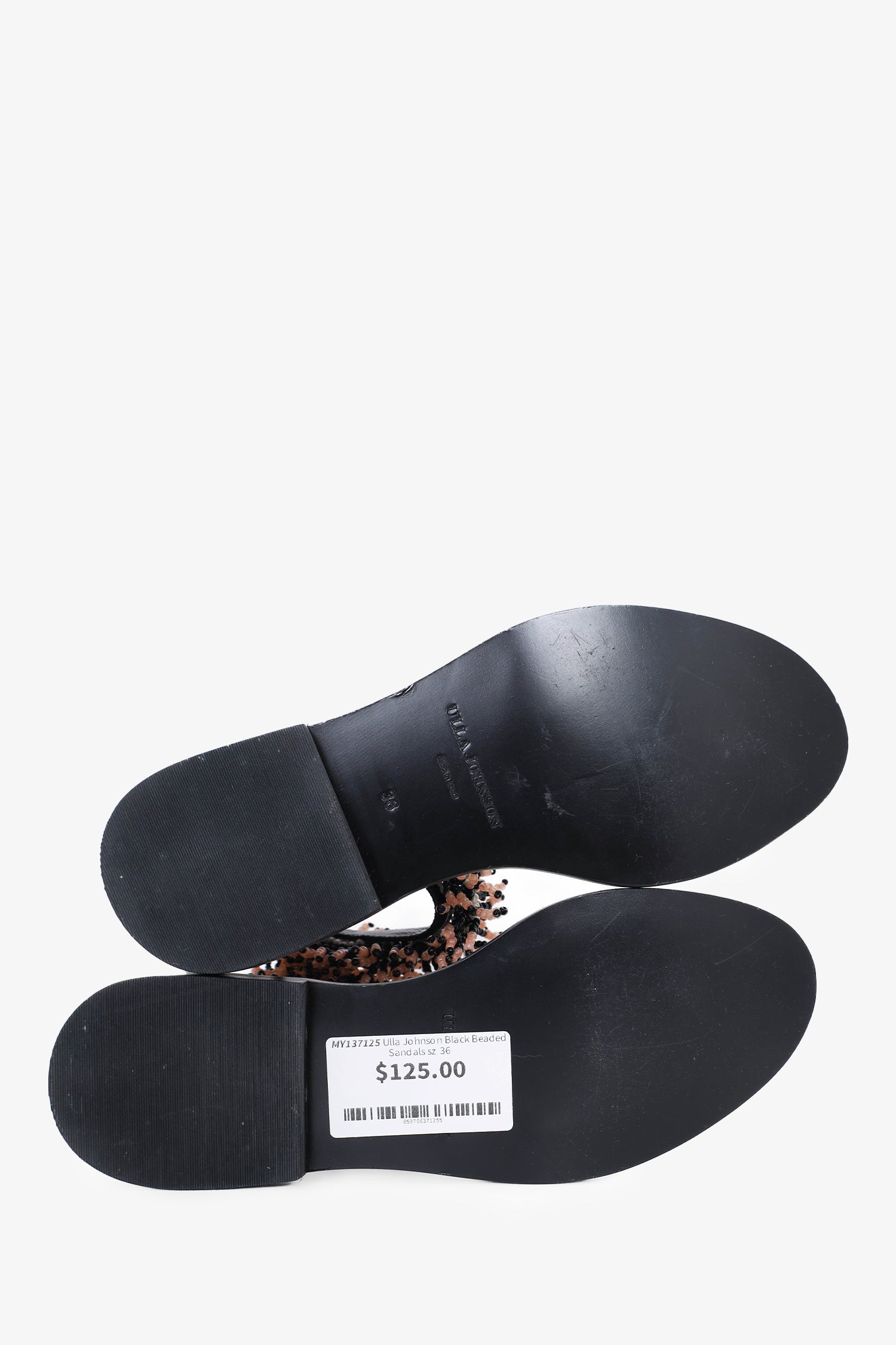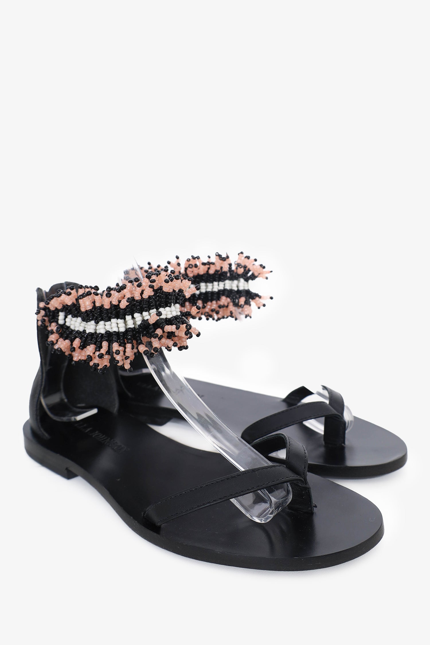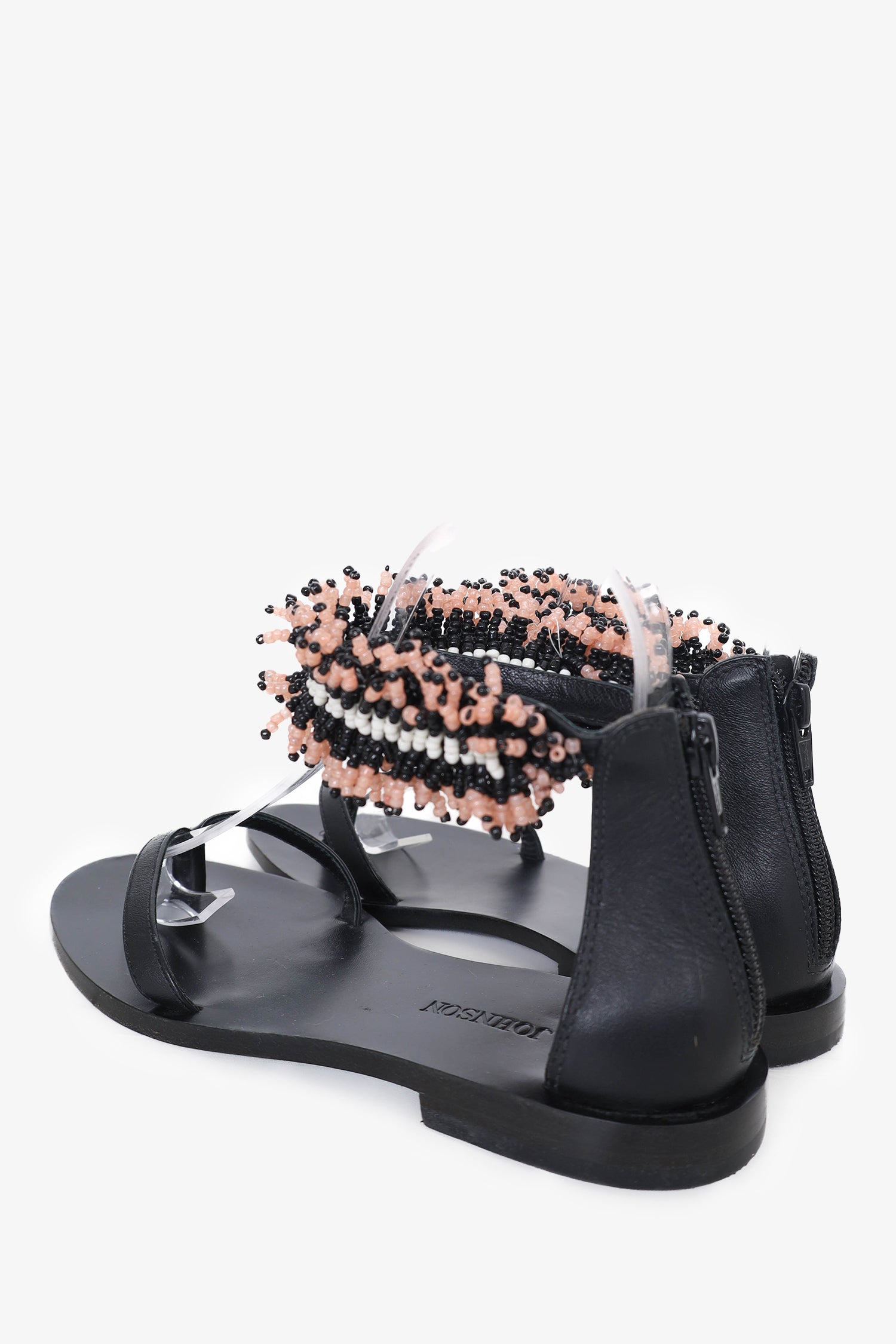 Refresh availabilityUlla Johnson Black Beaded Sandals. Round toe. T-strap. Back zipper closure. Tonal stitching.