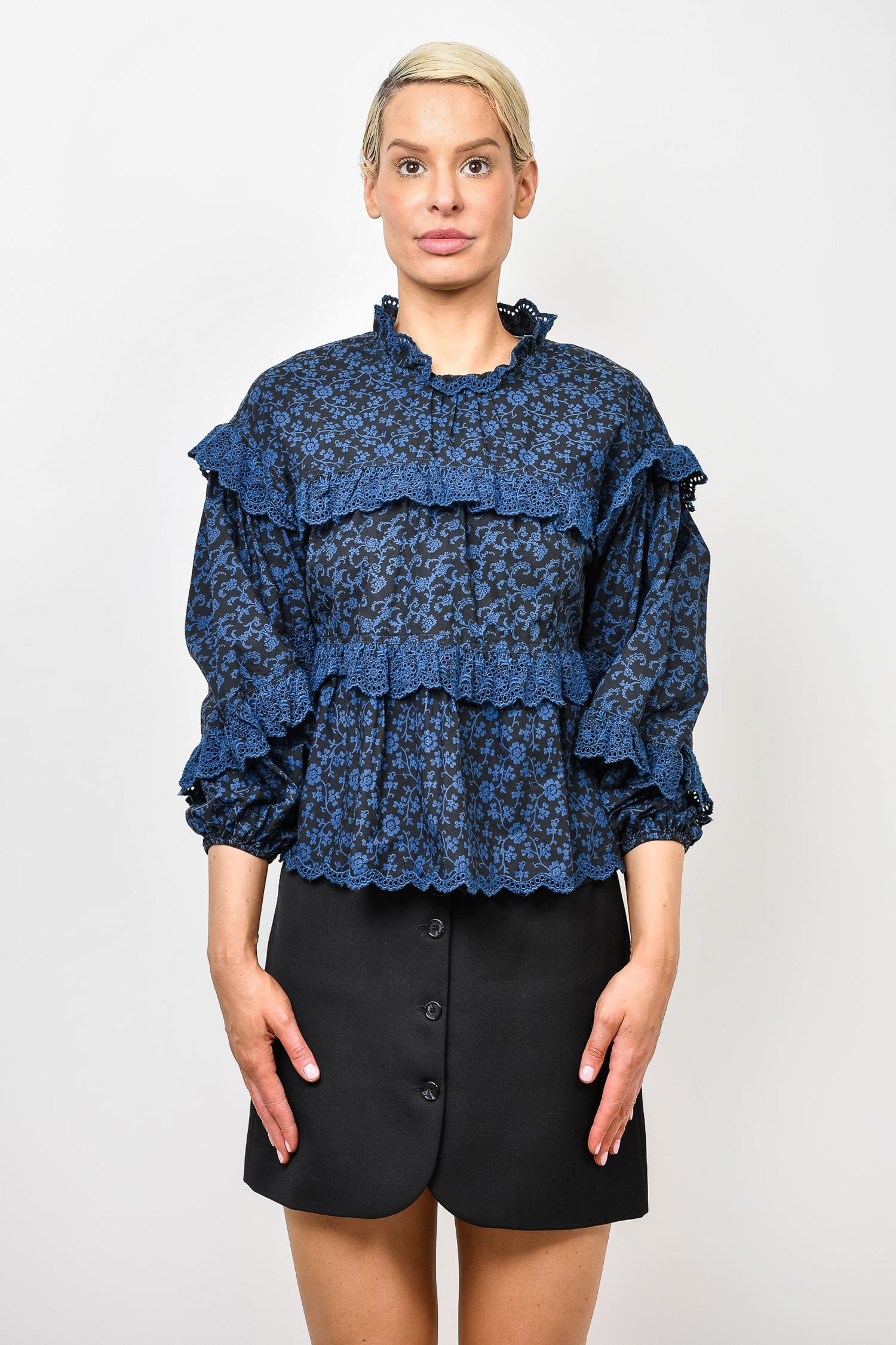 Refresh availabilityUlla Johnson Black/Navy Blue Eyelet Tiered Blouse. Round neckline. Back neckline button closure. Long-sleeve. Tonal stitching.