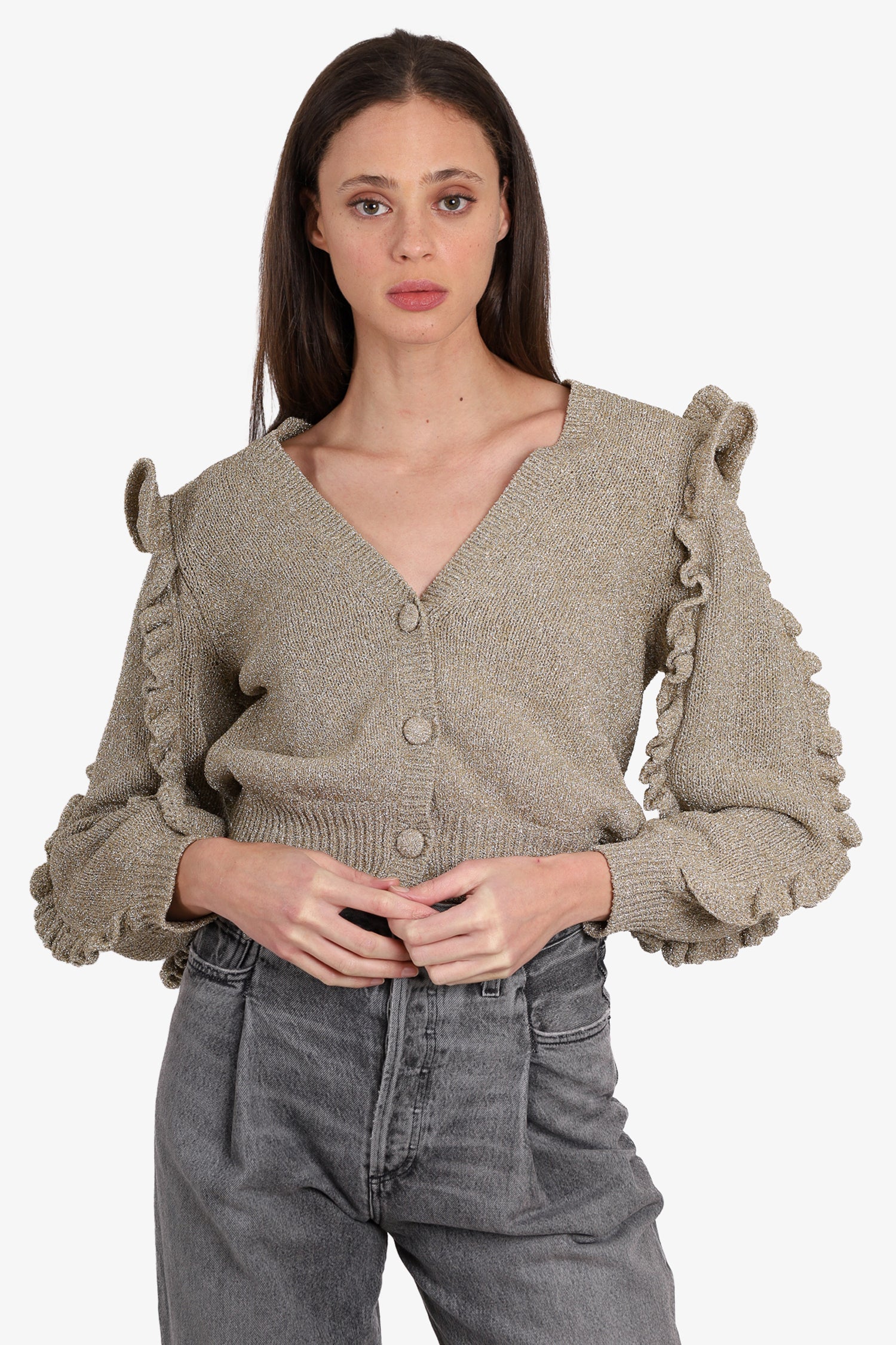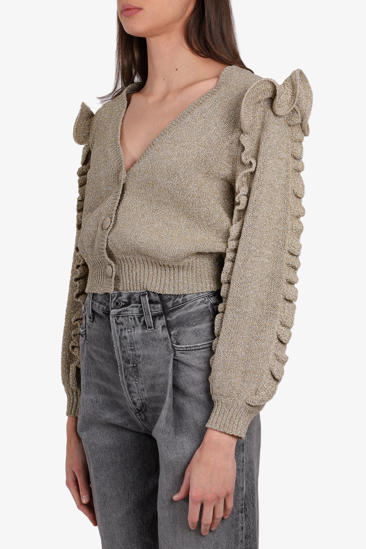 Refresh availabilityUlla Johnson Gold Ruffle Sleeve Cardigan. Button-up closure. V-neckline. Ribbed hem. Ribbed cuff sleeves. Tonal stitching.