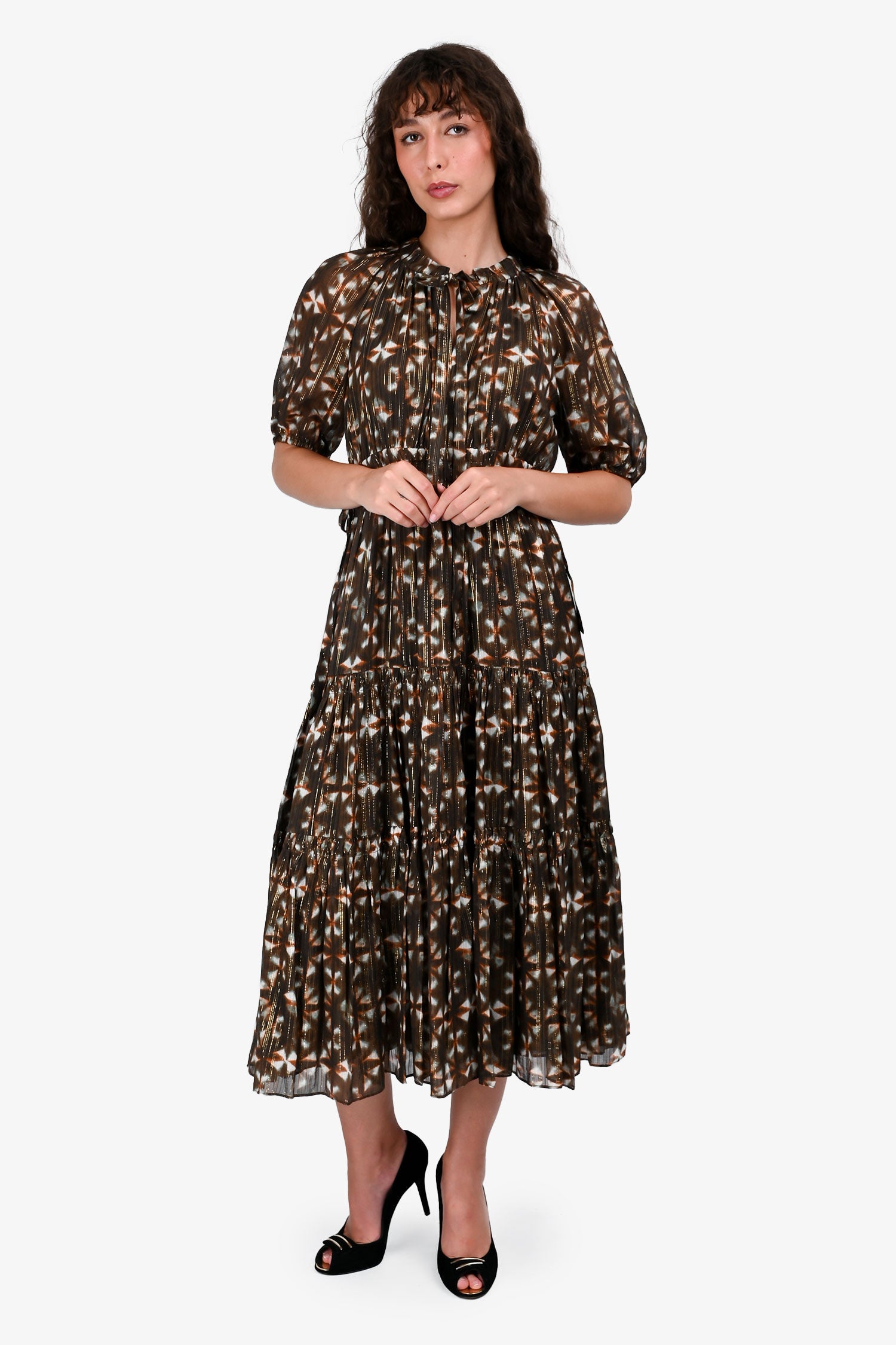 Refresh availabilityUlla Johnson Green Silk Patterned Midi Dress. V-neckline. Puff sleeves. Fitted waist with adjustable drawstring on the sides. Tonal stitching.