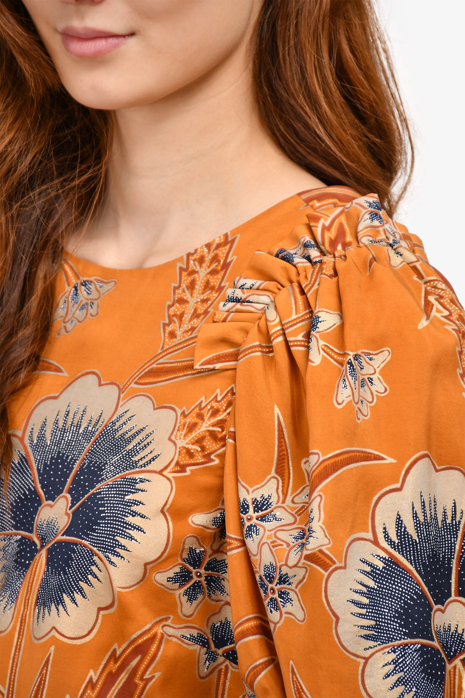Refresh availabilityUlla Johnson Orange/Blue Floral Puff Sleeve Mini Dress. Ruched at the shoulder. Back zipper closure. Tonal stitching.