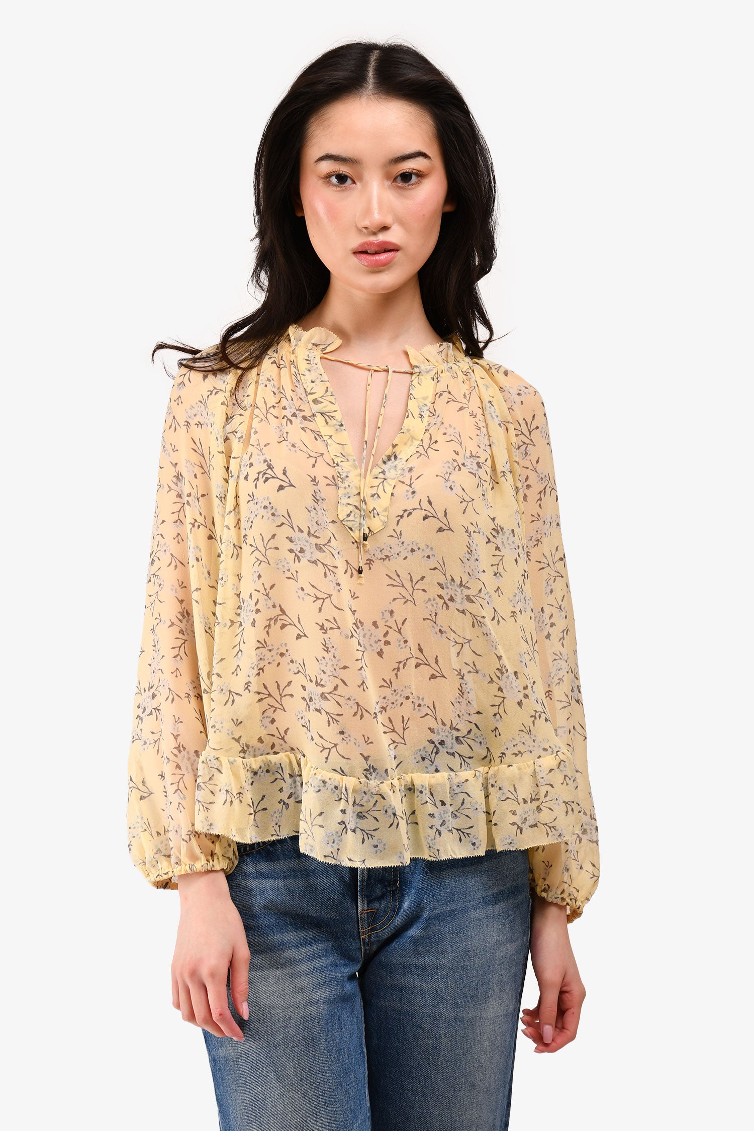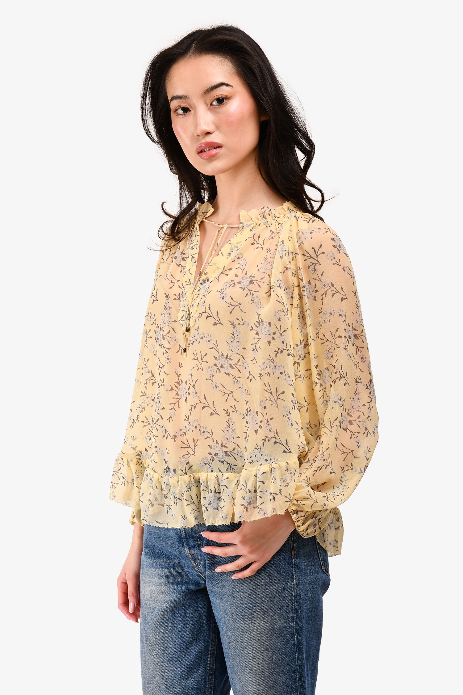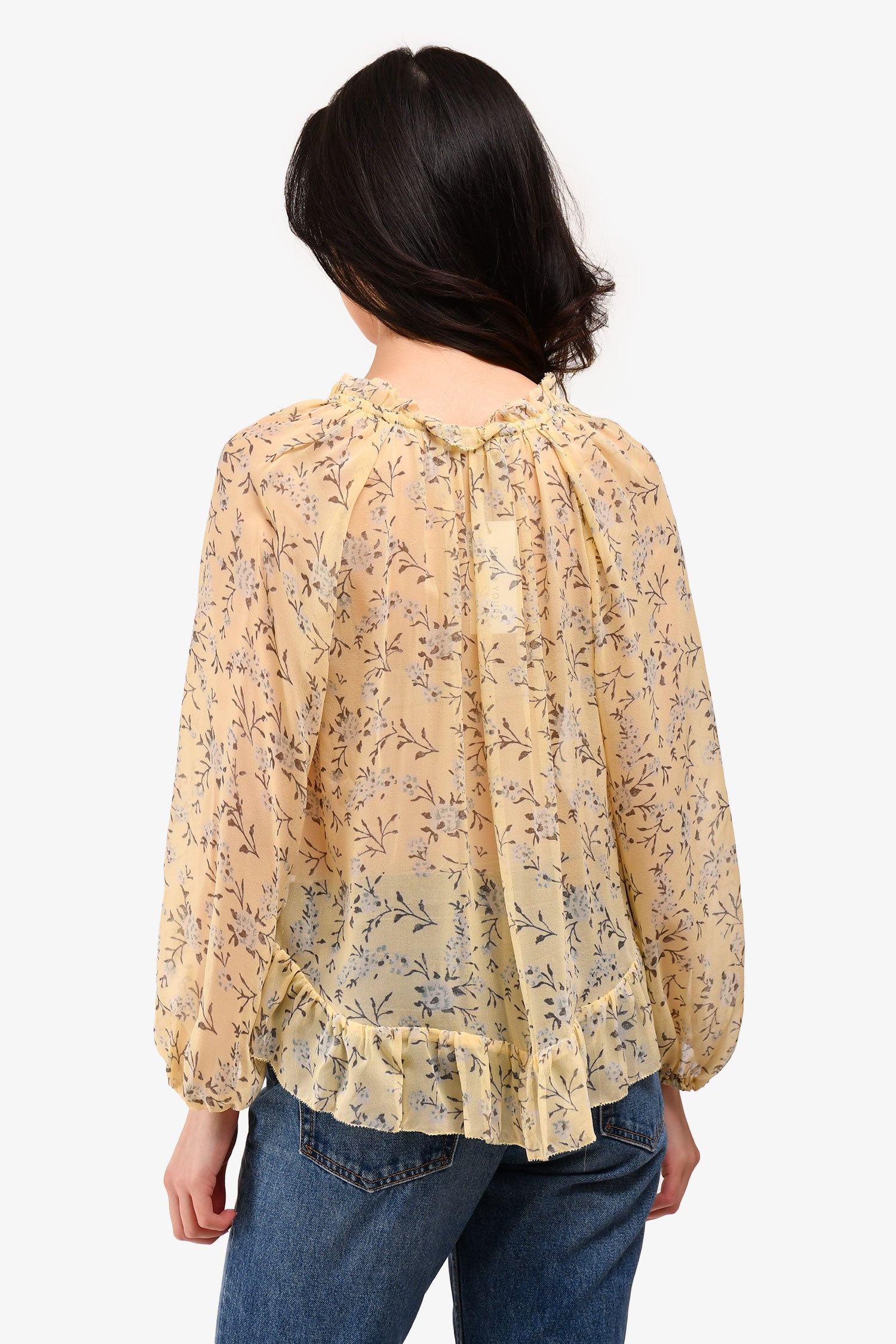 Refresh availabilityUlla Johnson Yellow Silk Floral Printed Top. Elasticated cuffs. Semi-sheer. Tonal stitching.