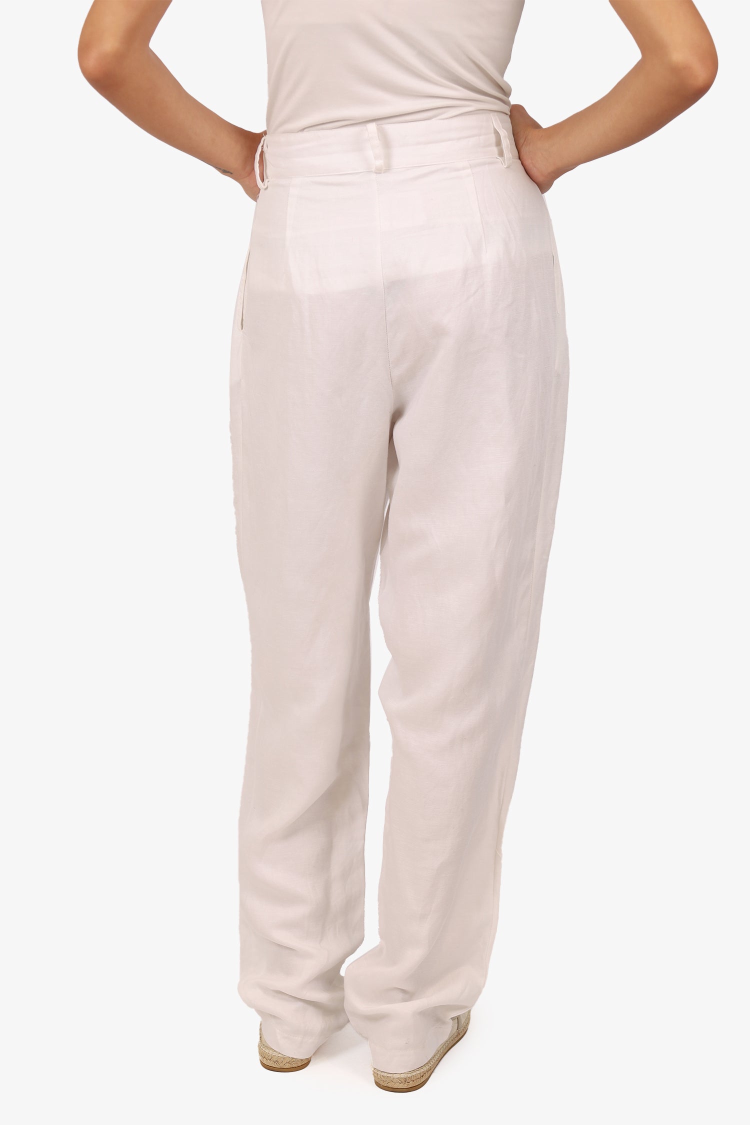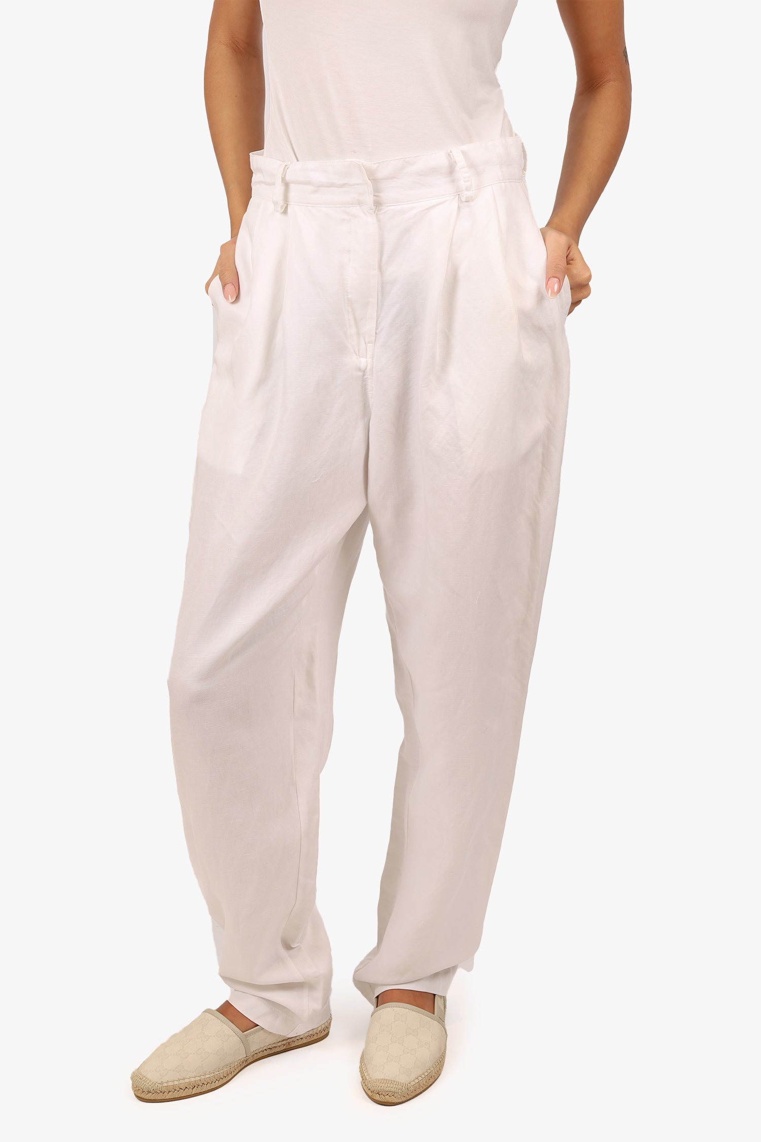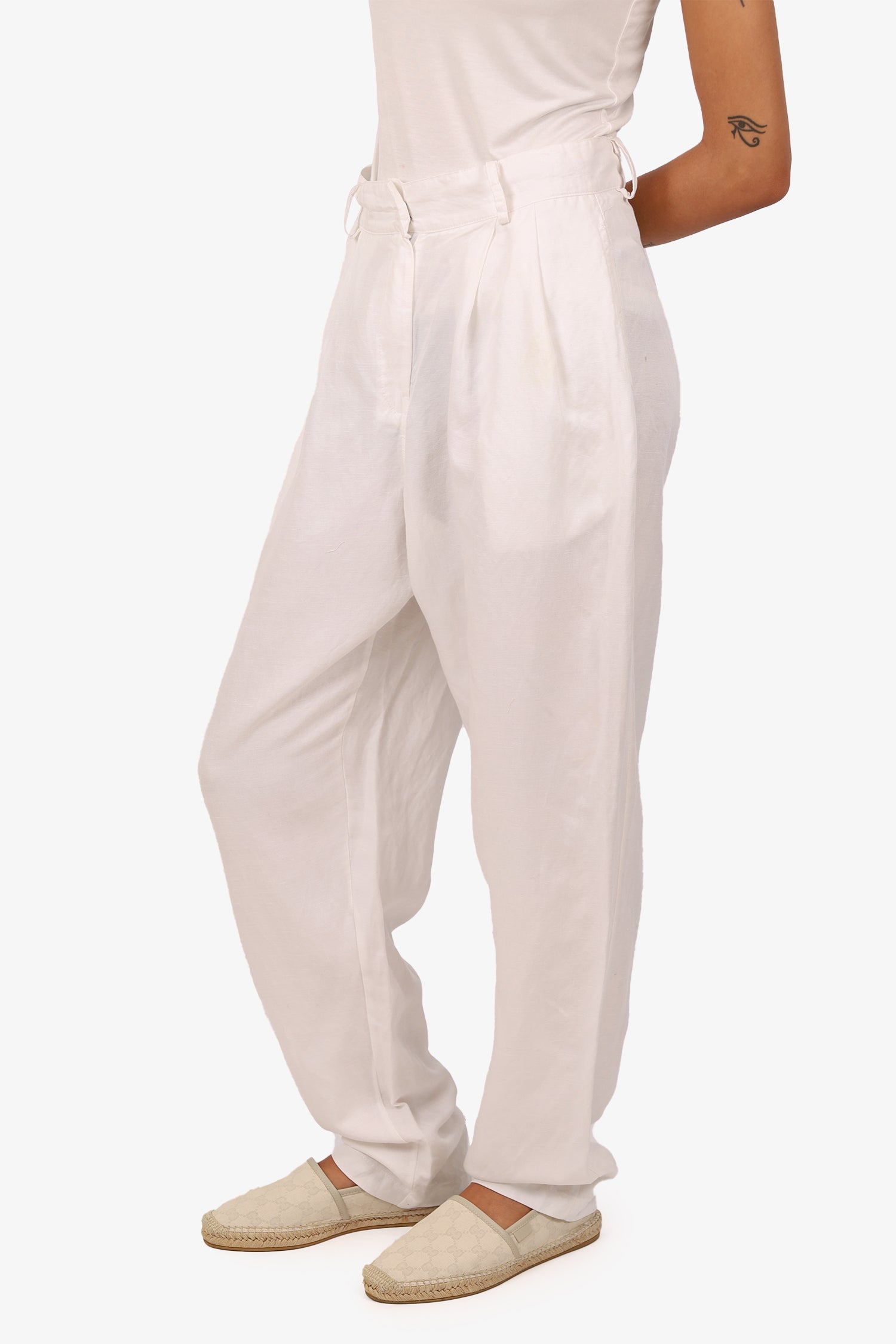 Refresh availabilityUncle Studios White Linen Pants. Slip-on. Front zip with hook closure. Waistband belt-loops. 2 exterior side slip pockets. Tonal stitching.