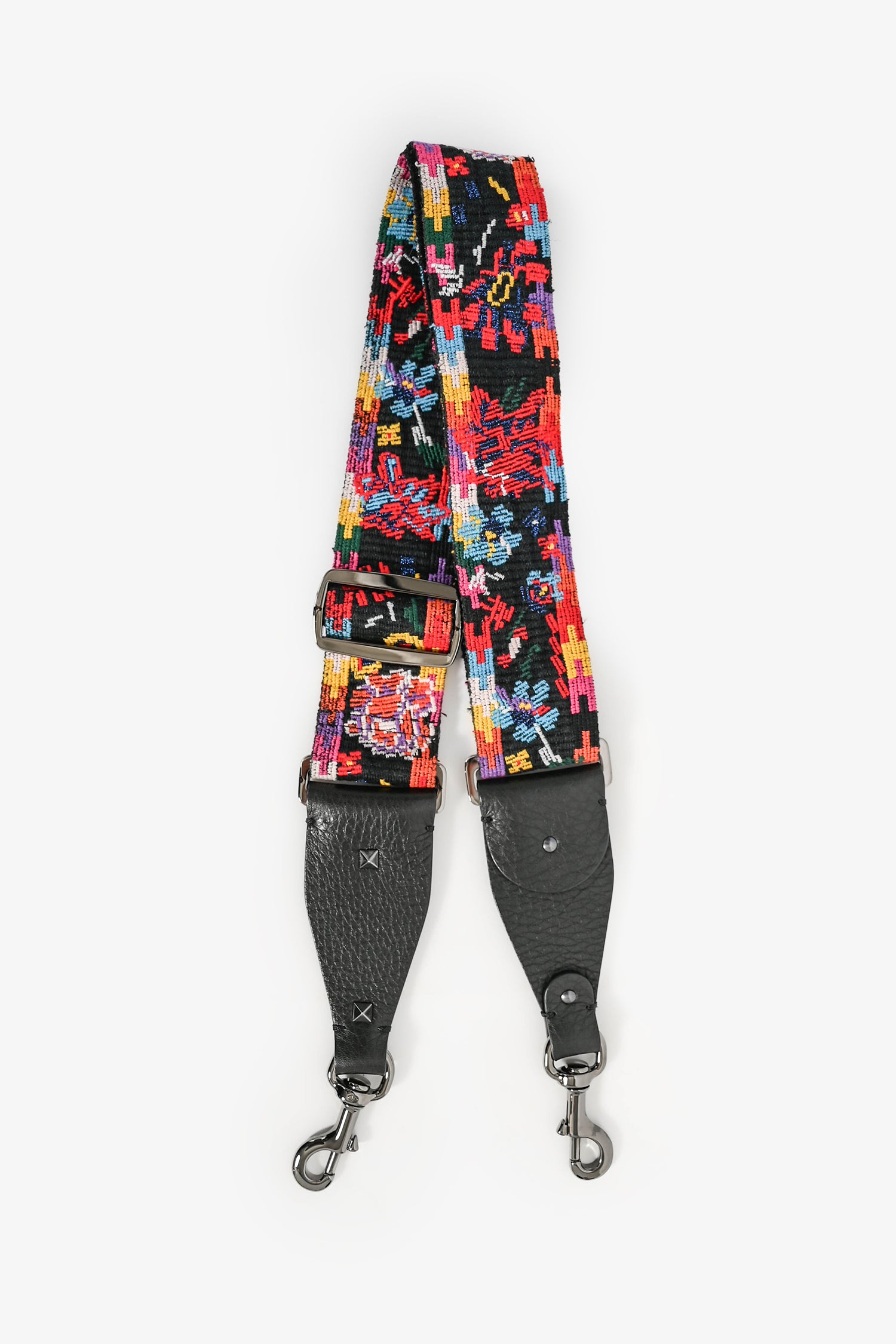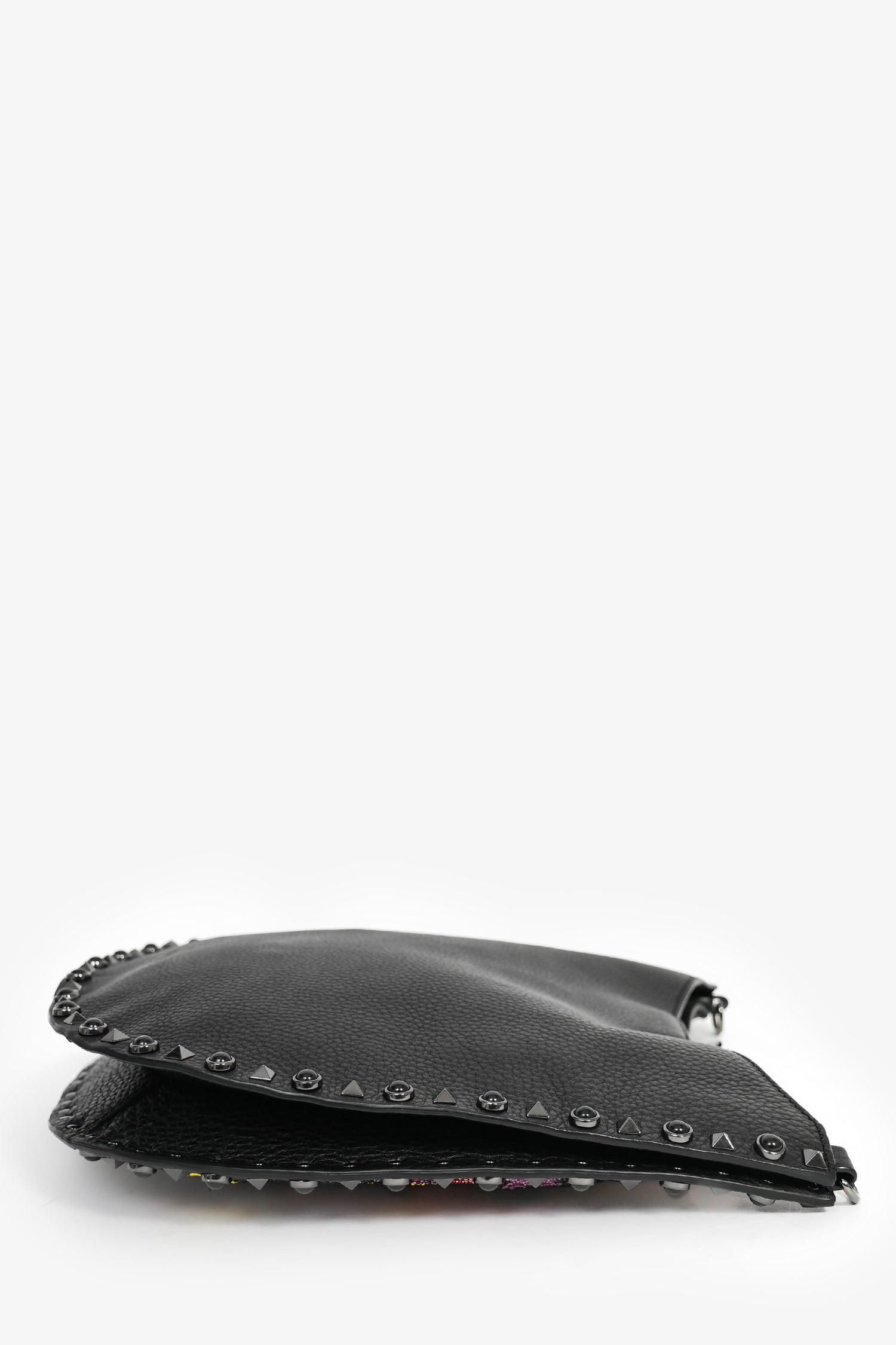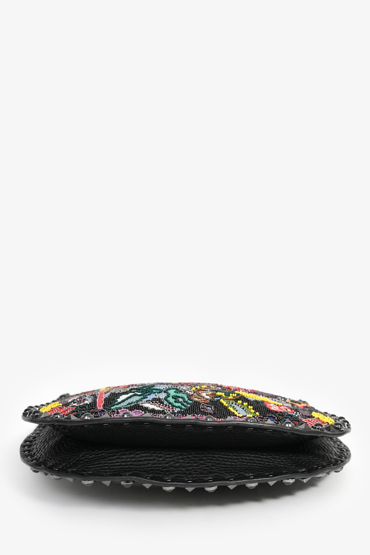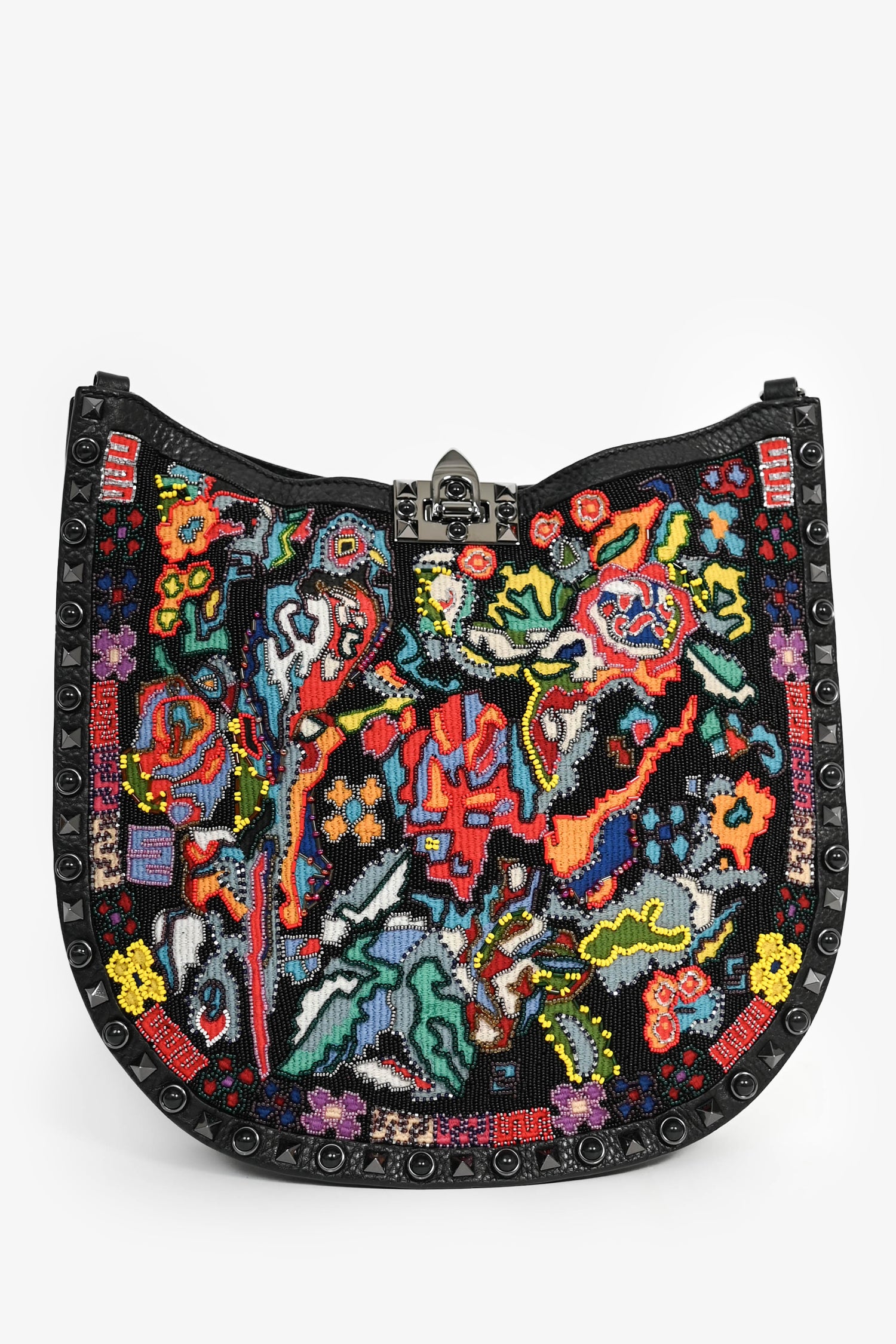Refresh availabilityValentino 2018 Black Leather Multicolour Beaded Guitar Crossbody Bag. Front turn-lock closure. Single compartment with 2 wall slip pockets and a wall zip pocket. Detachable and adjustable strap. Silver-tone hardware. Suede textile lining. Tonal stitching.