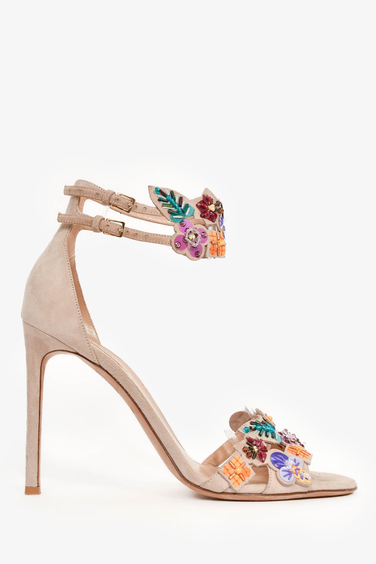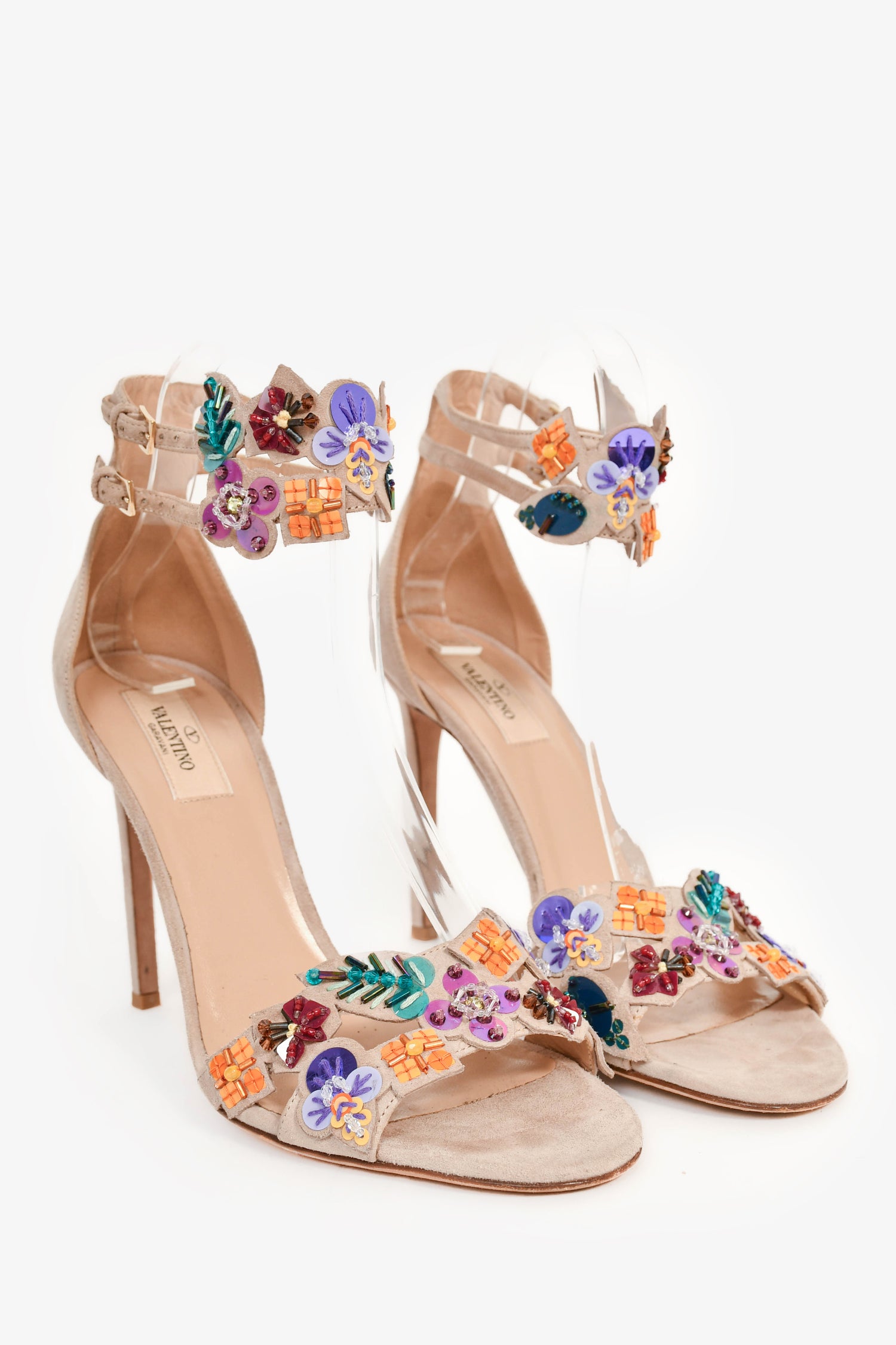 Refresh availabilityValentino Beige Suede Multi-Floral Sequin Embellished Heeled Sandals. Open toe. Ankle strap with side buckle closure. Gold-tone hardware. Tonal stitching.