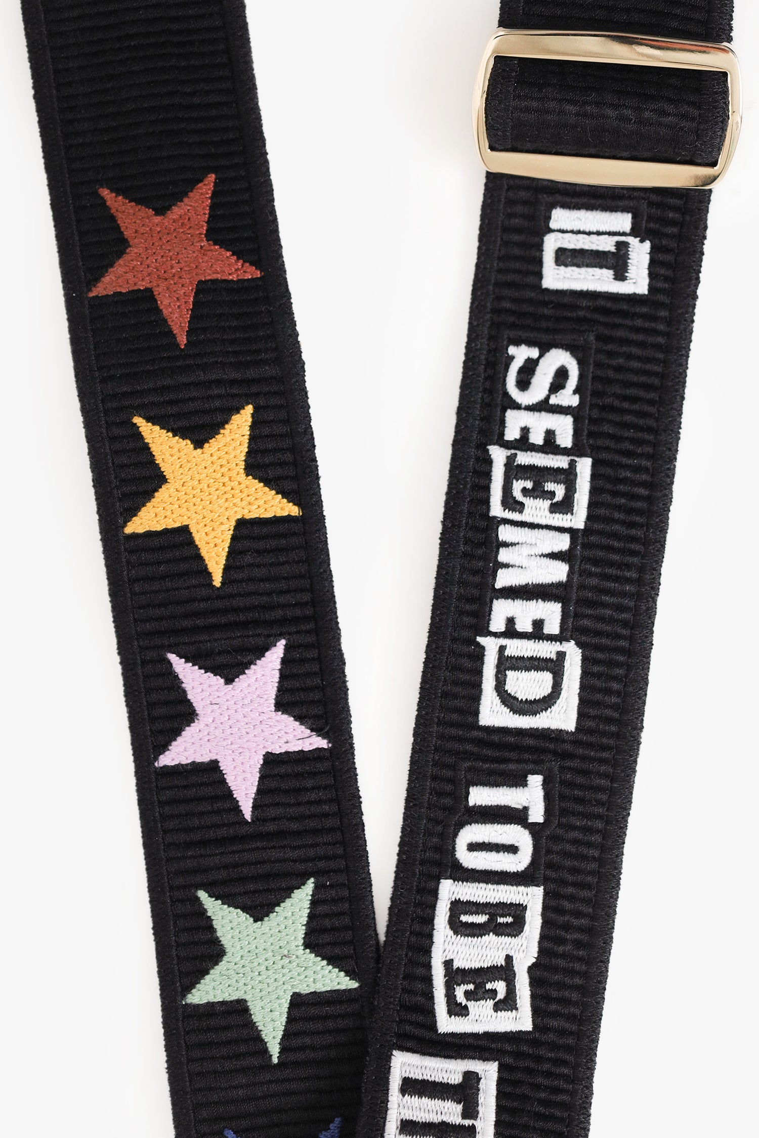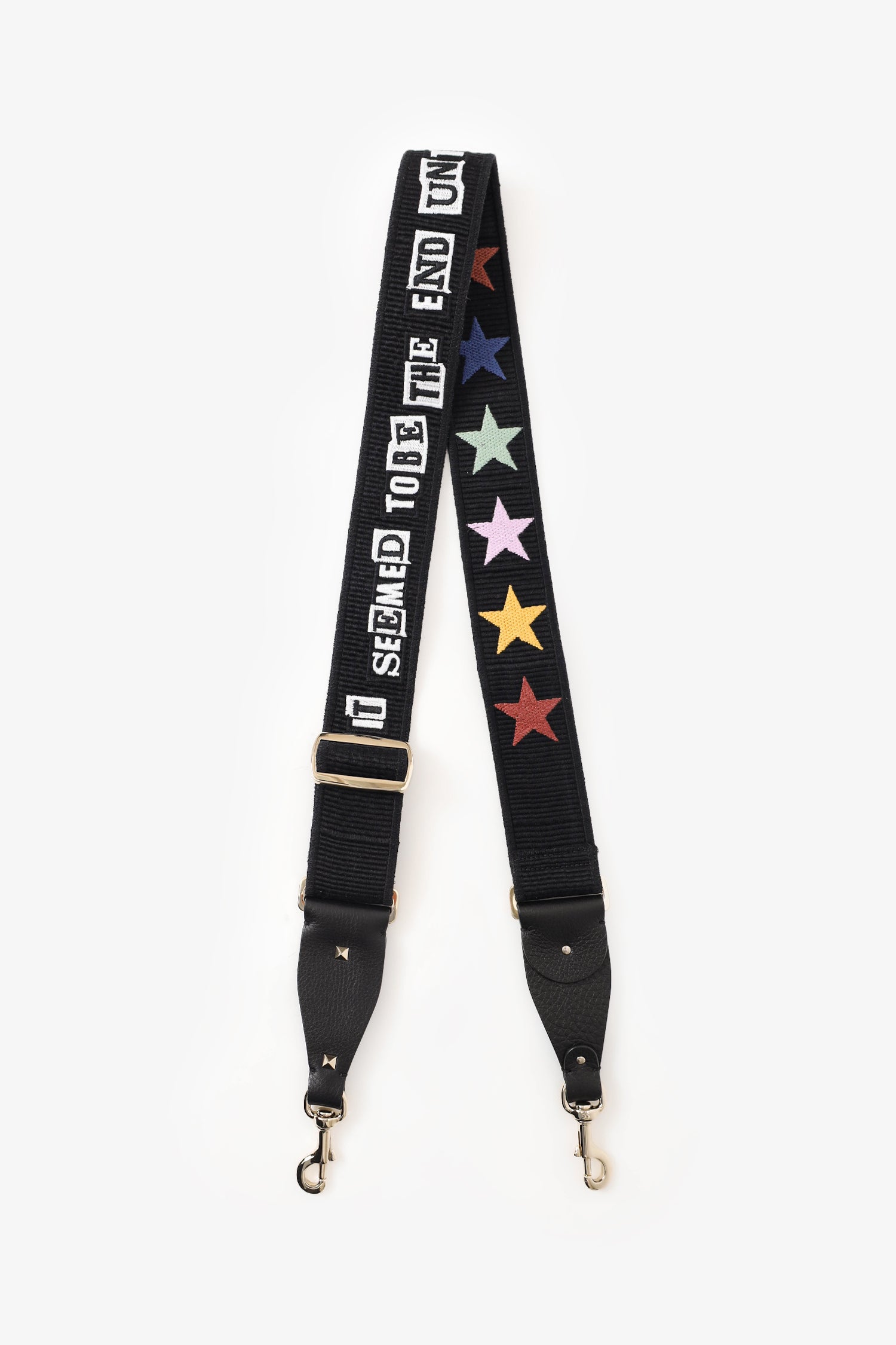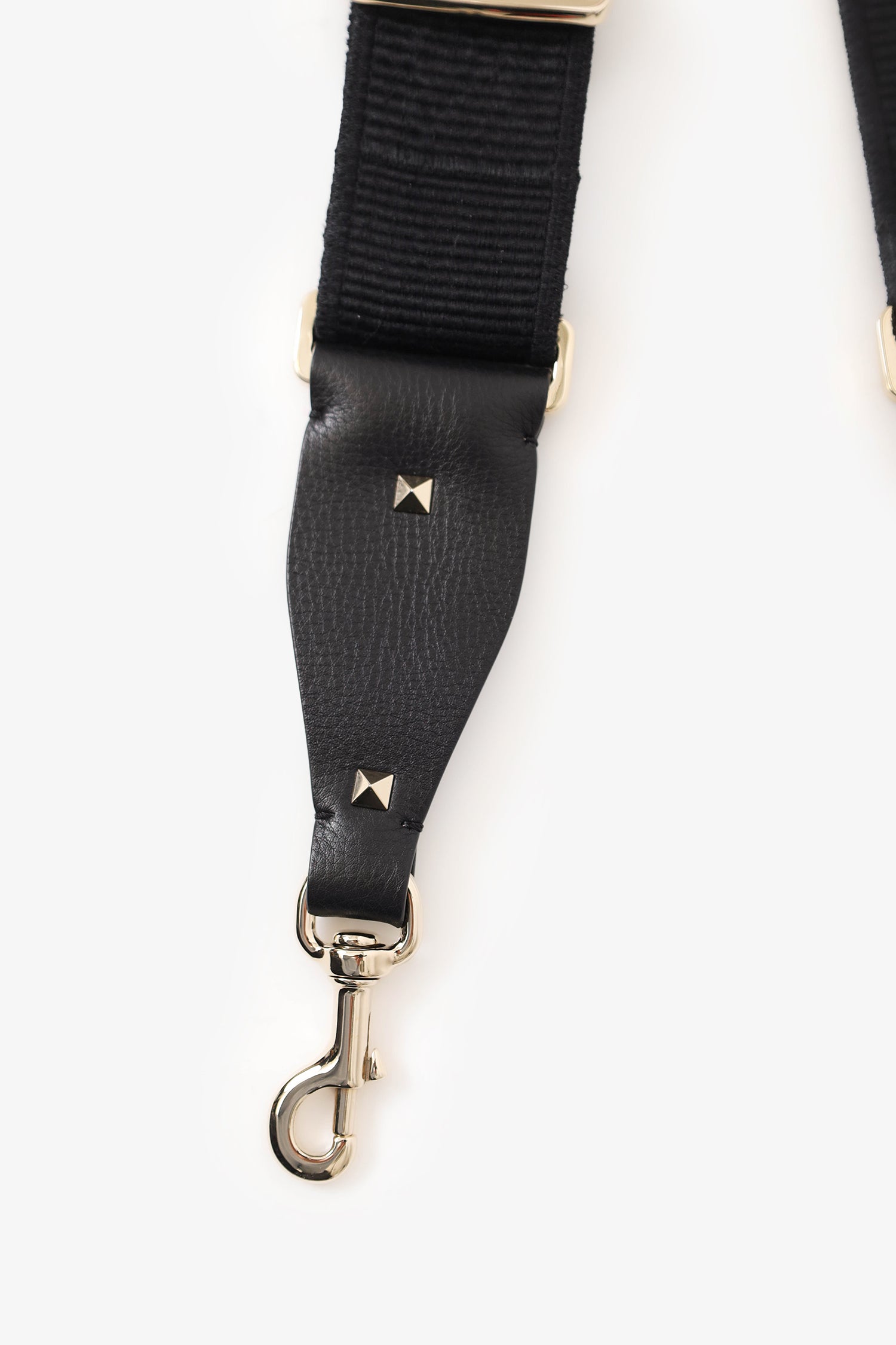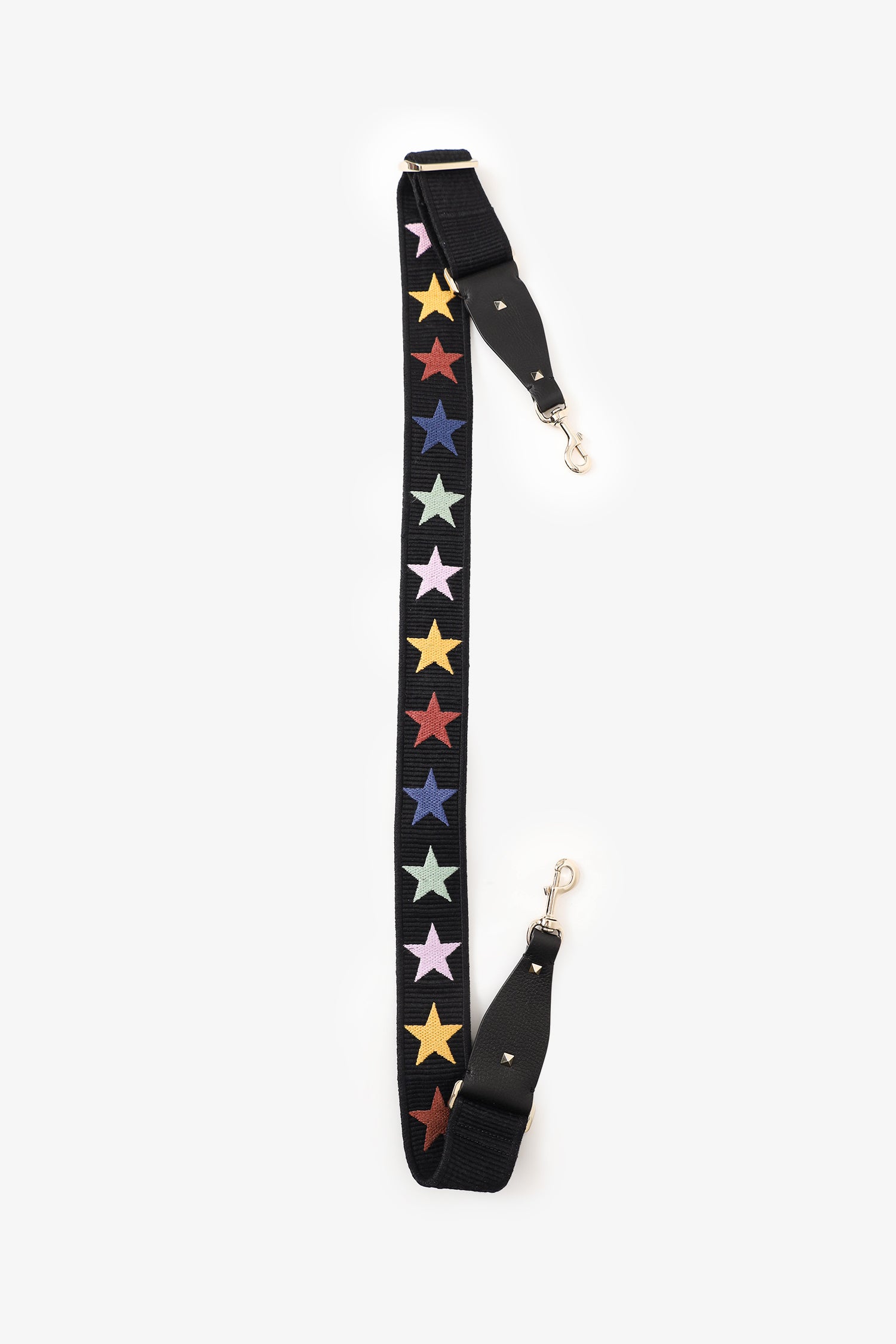Refresh availabilityValentino Black Canvas Star Bag Strap. Lobster clasp closures on both ends. Adjustable buckle closure. Palladium-tone hardware. Tonal stitching.