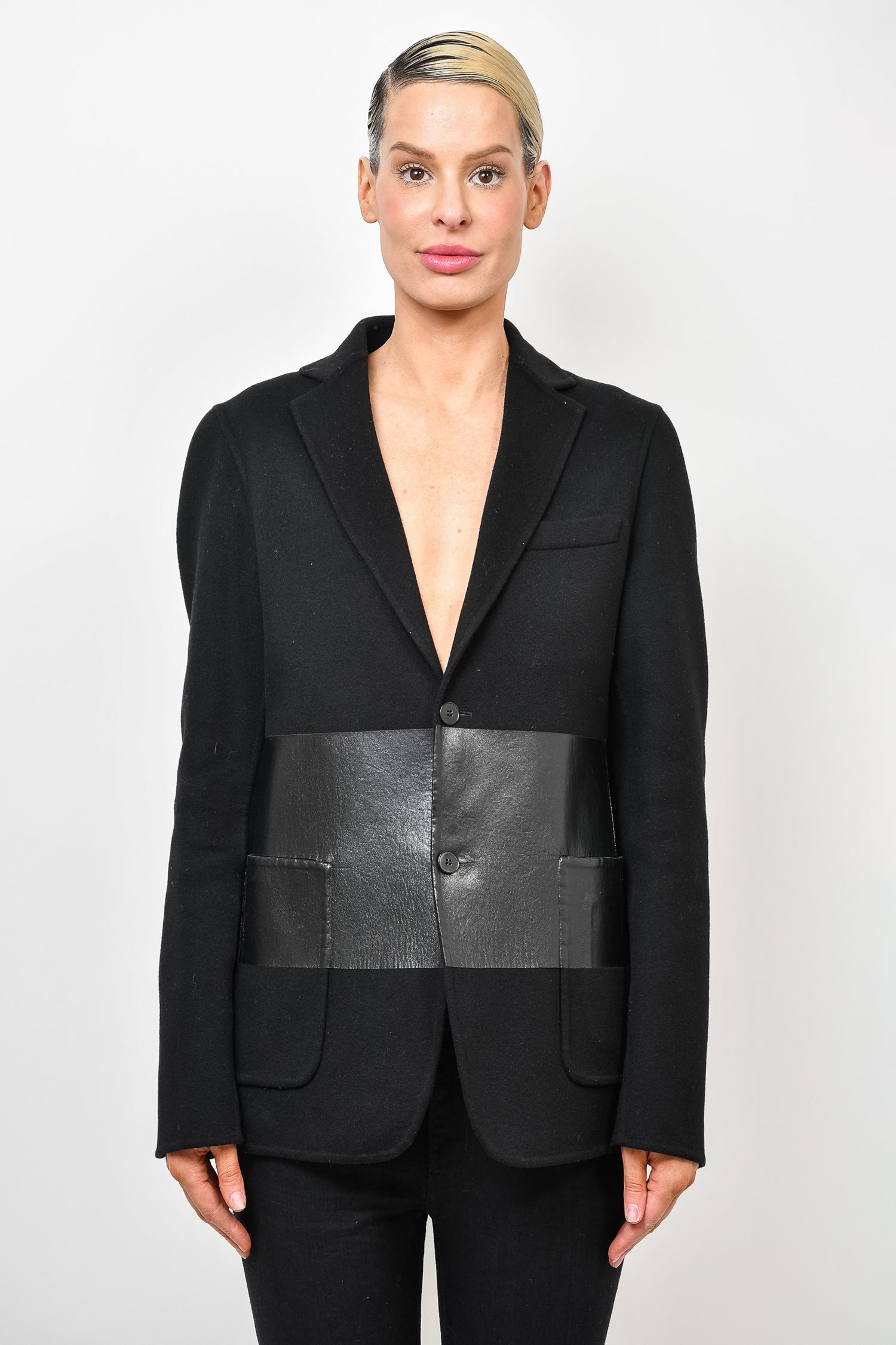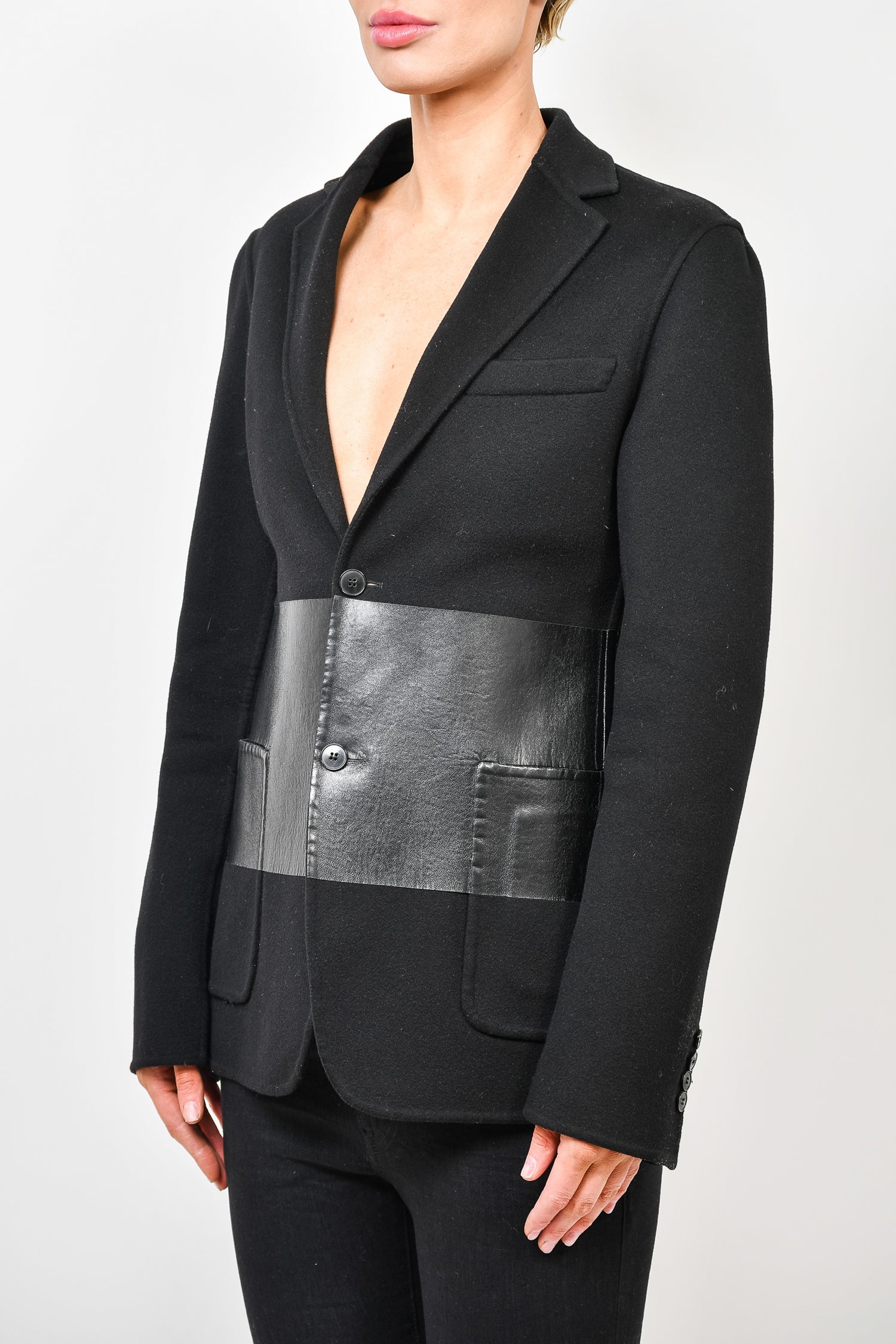 Refresh availabilityValentino Black Double Faced Wool Blazer with Leather Detail. Two slip pockets at front. Button up closure. Single breasted. Interior slip pocket. Buttoned cuffs. Tonal stitching.