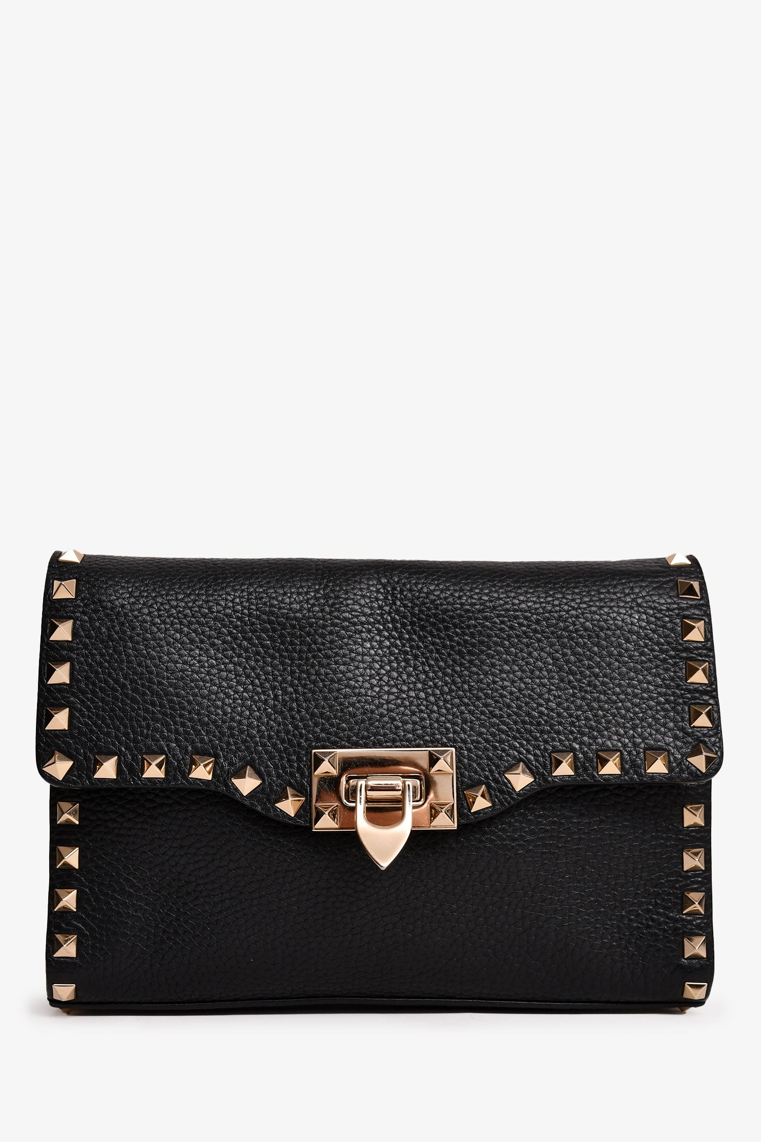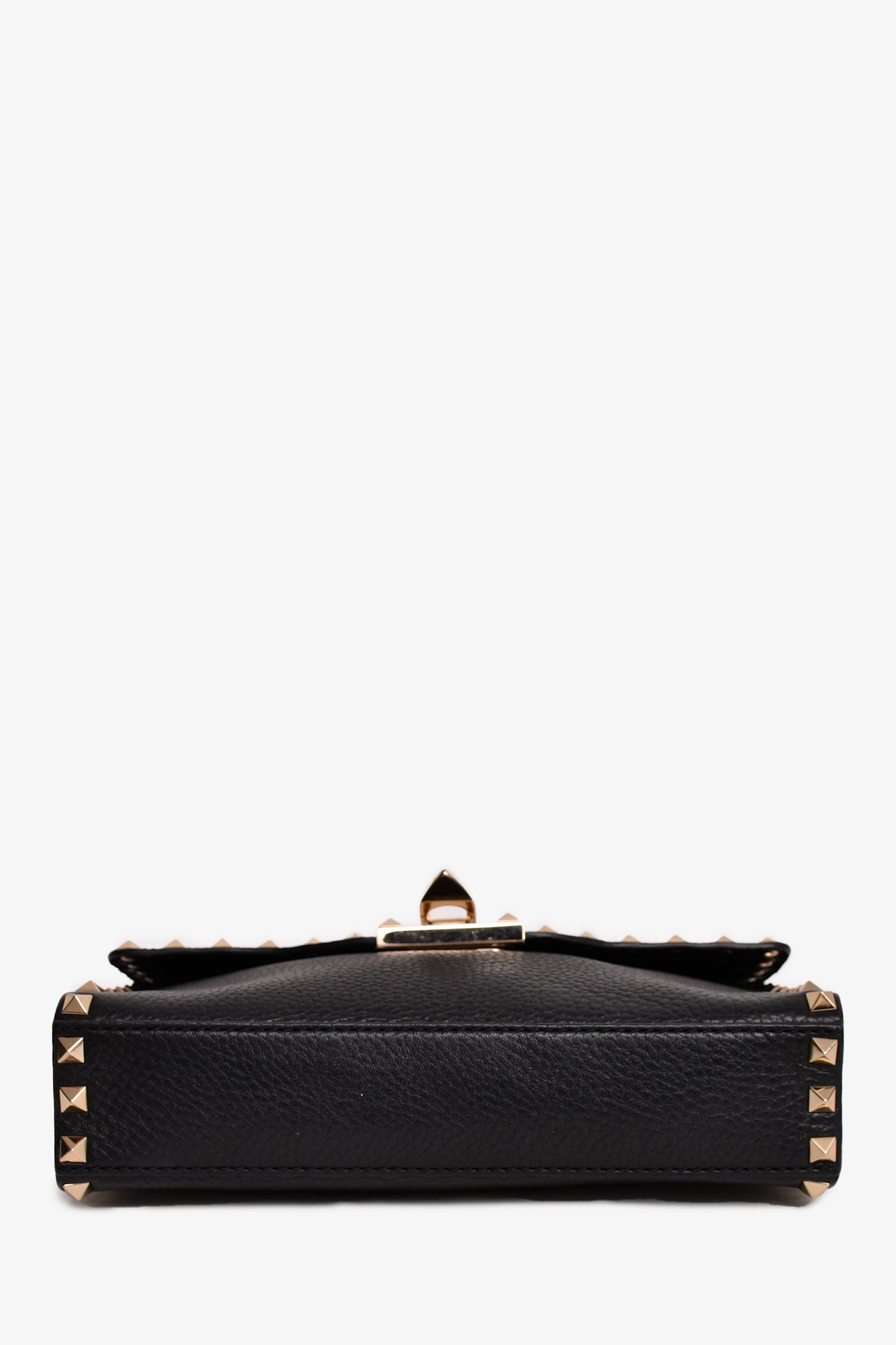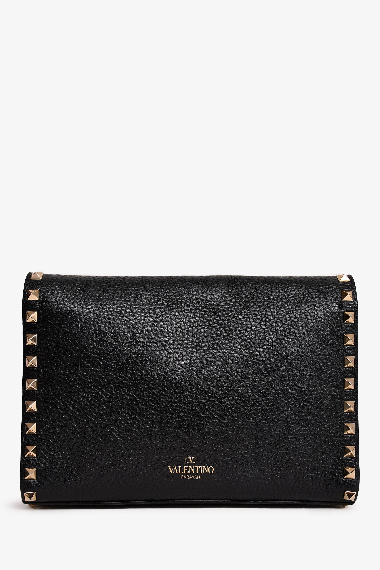 Refresh availabilityValentino Black Grained Leather Rockstud Flap Crossbody. Front fold-over flap with flip-lock closure. Tonal suede interior lining. Single interior wall slip pocket. Removable and adjustable strap. Gold-tone hardware.
