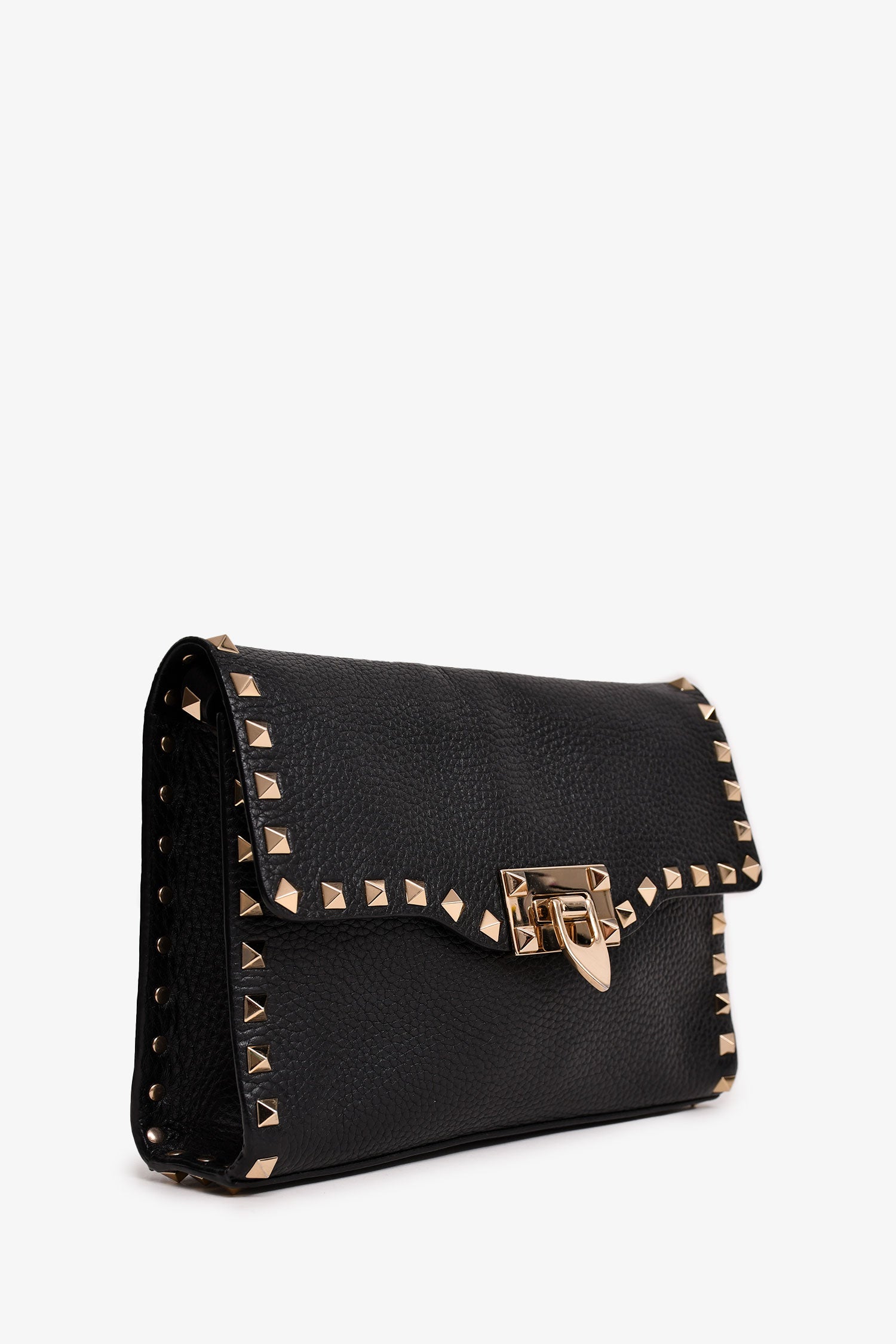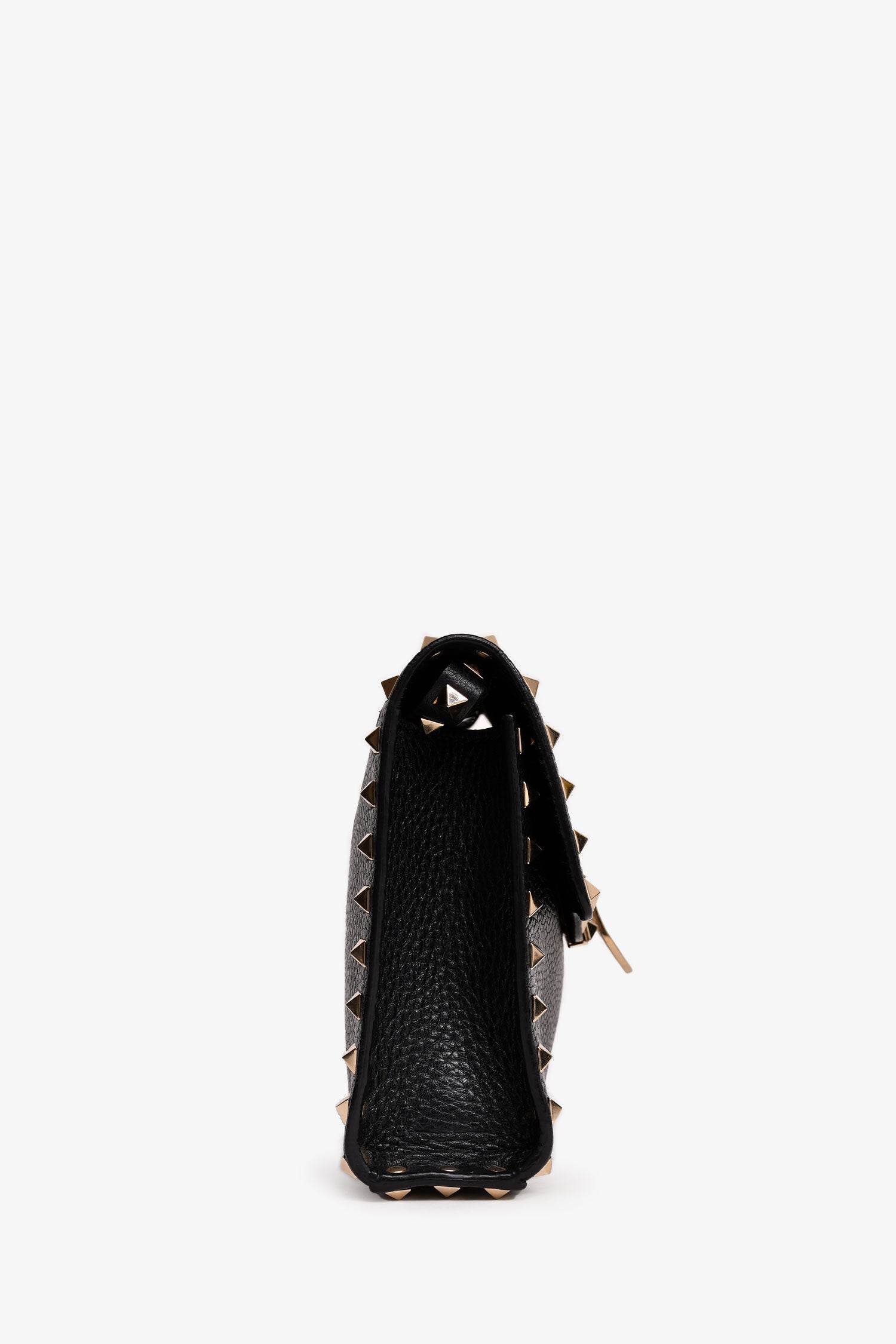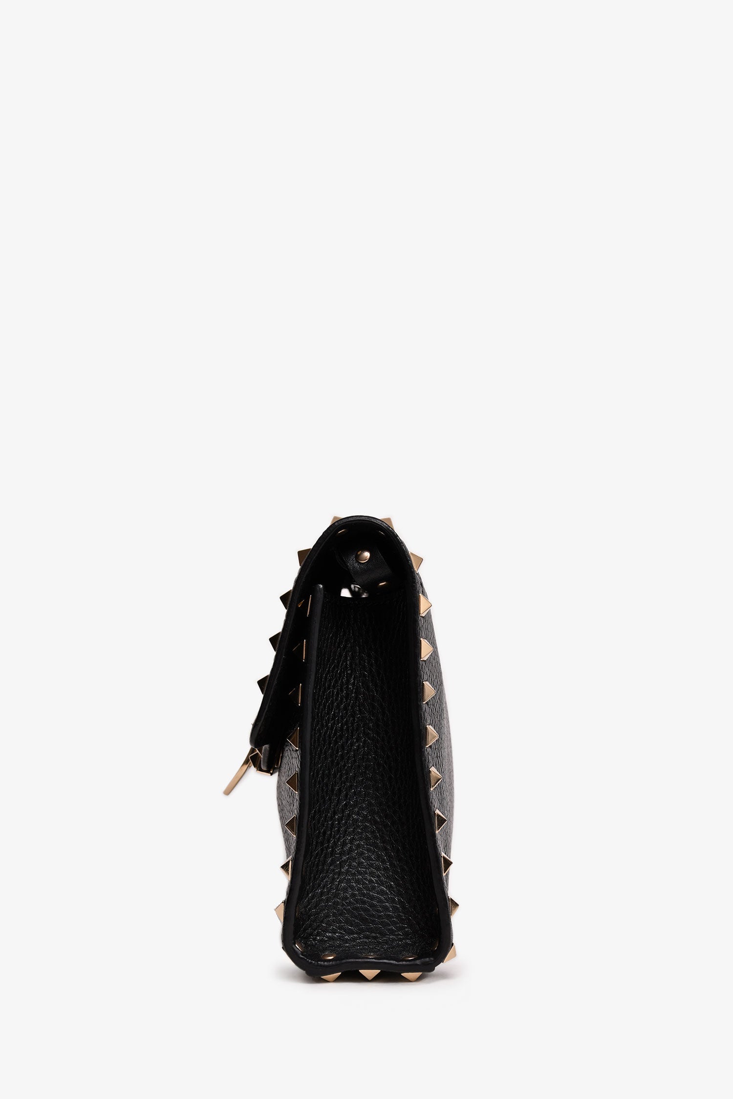 Refresh availabilityValentino Black Grained Leather Rockstud Flap Crossbody. Front fold-over flap with flip-lock closure. Tonal suede interior lining. Single interior wall slip pocket. Removable and adjustable strap. Gold-tone hardware.